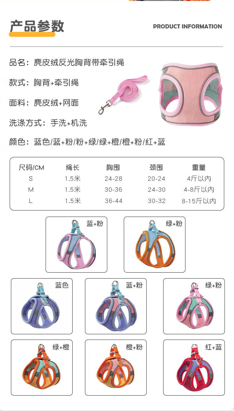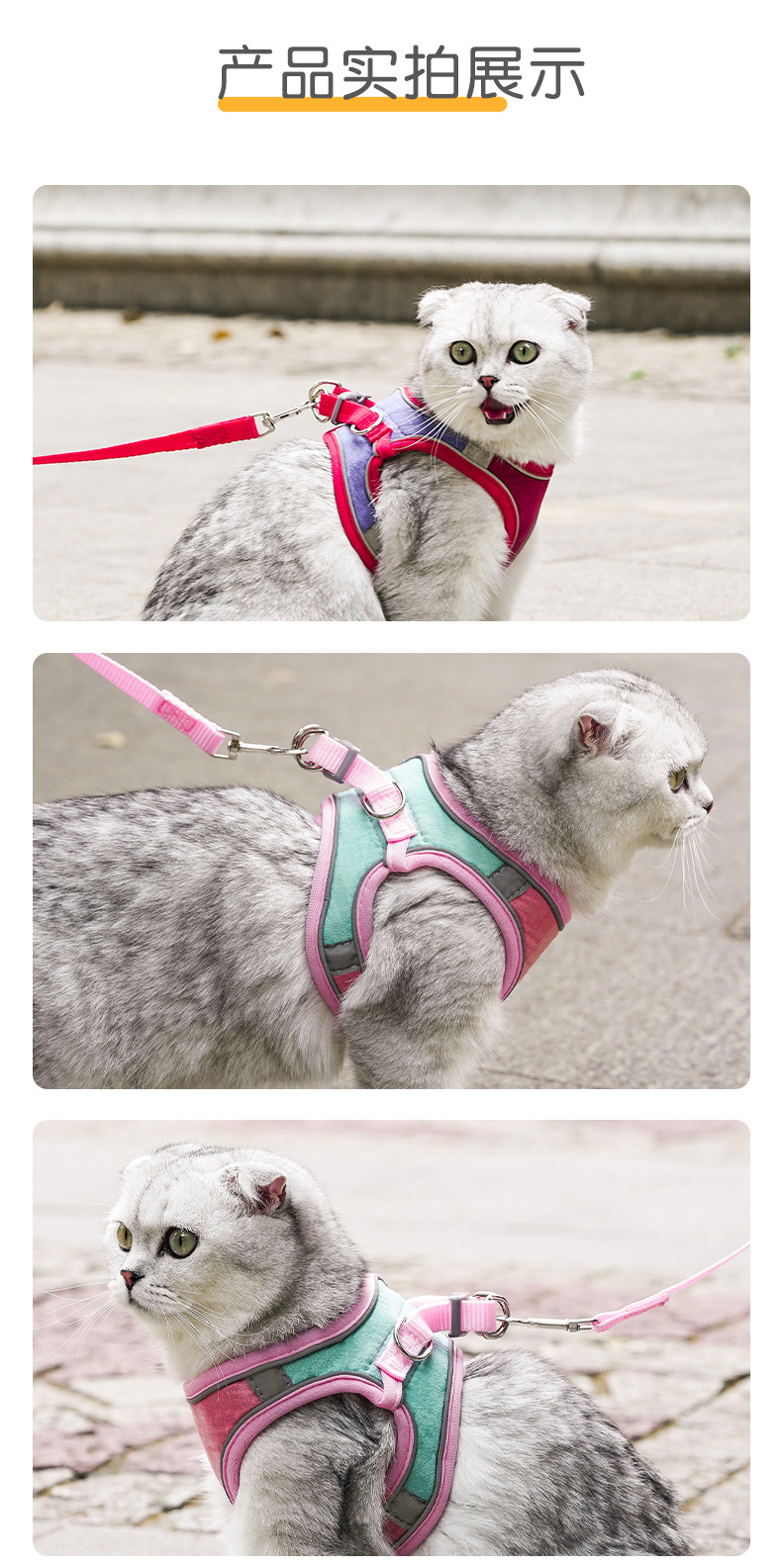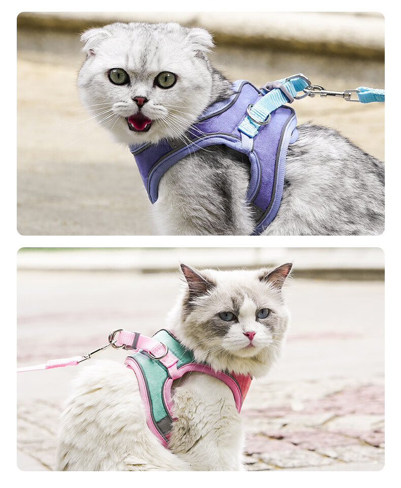PEITE PET Cat Traction Rope Vest Type Harness When Going Out to Prevent Break-Out Cat Walking Rope Cute Kitten Reflective Traction Rope Blue and Pink Color Matching Comfortable Suede Rope Length 1.5m M Size (Chest 30-36cm) Suitable for 5-8 Jin Jin equals 0.5 kg cat