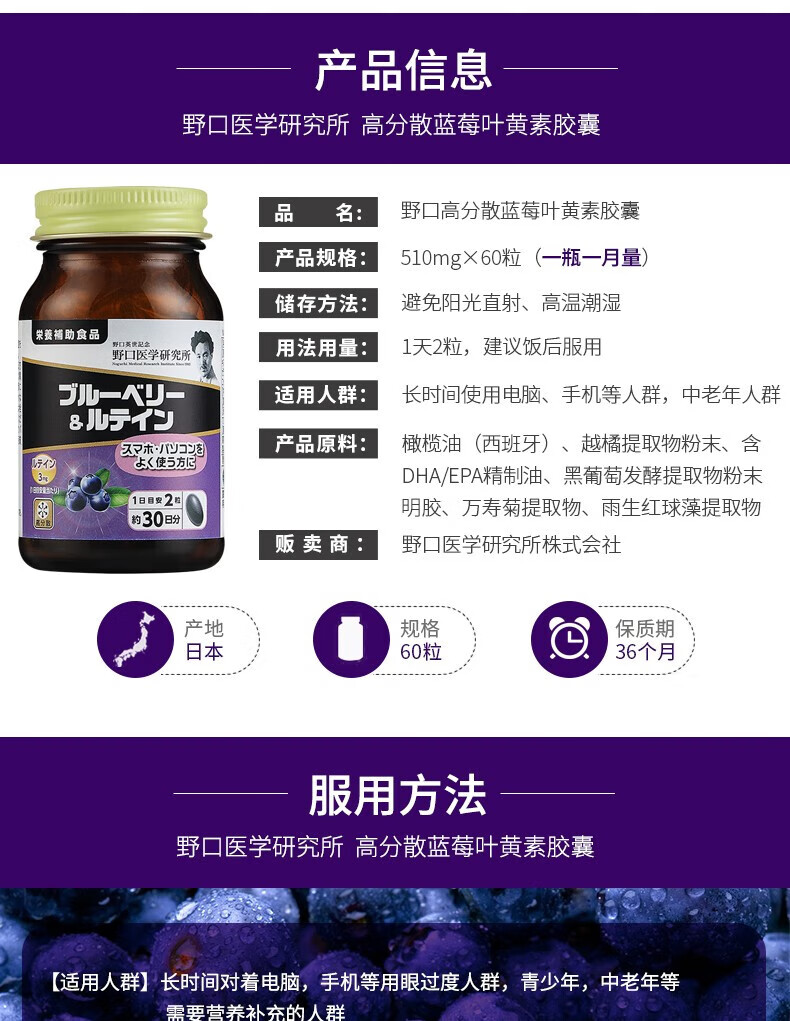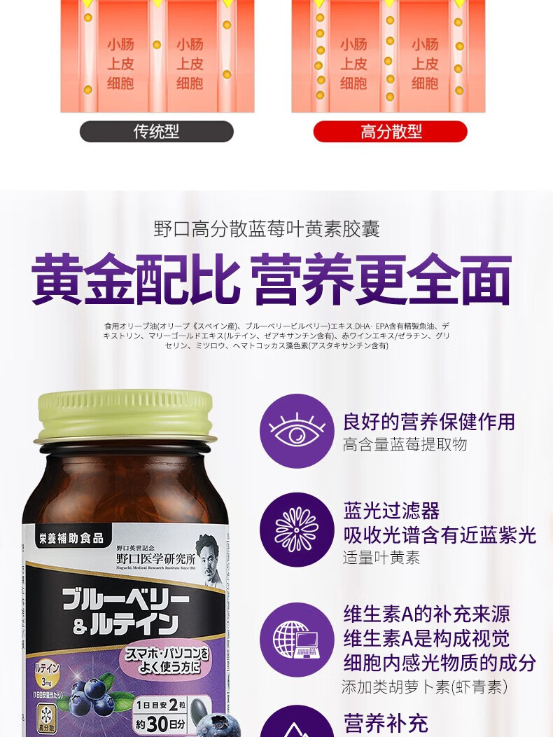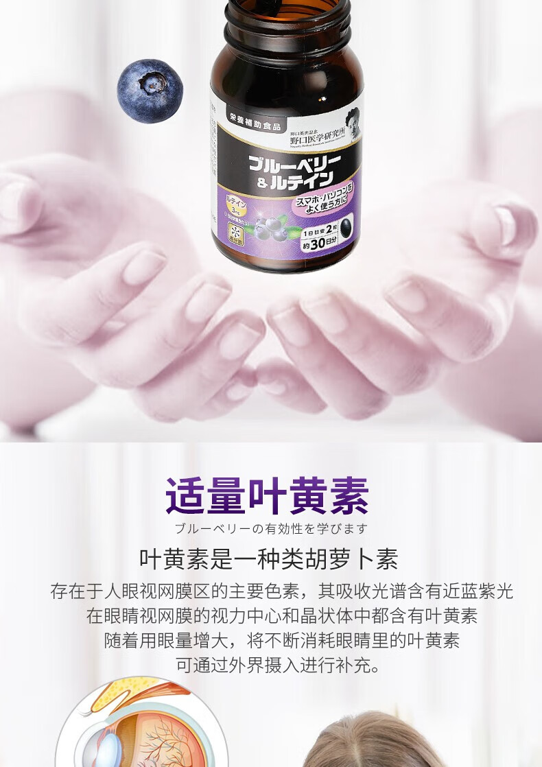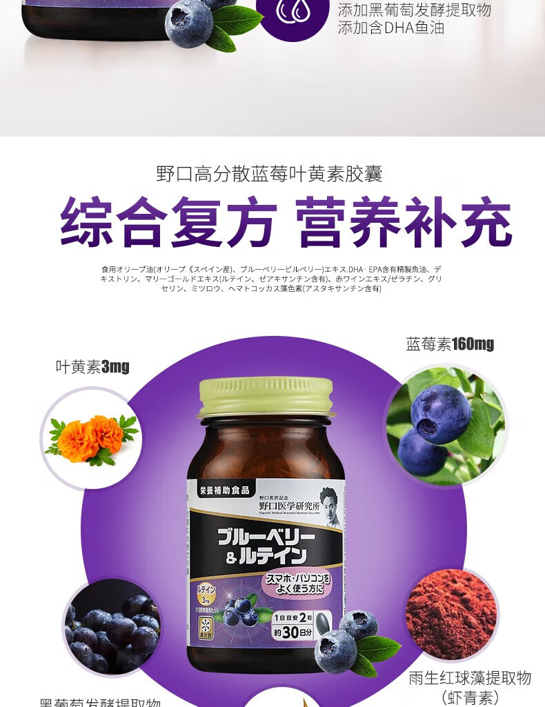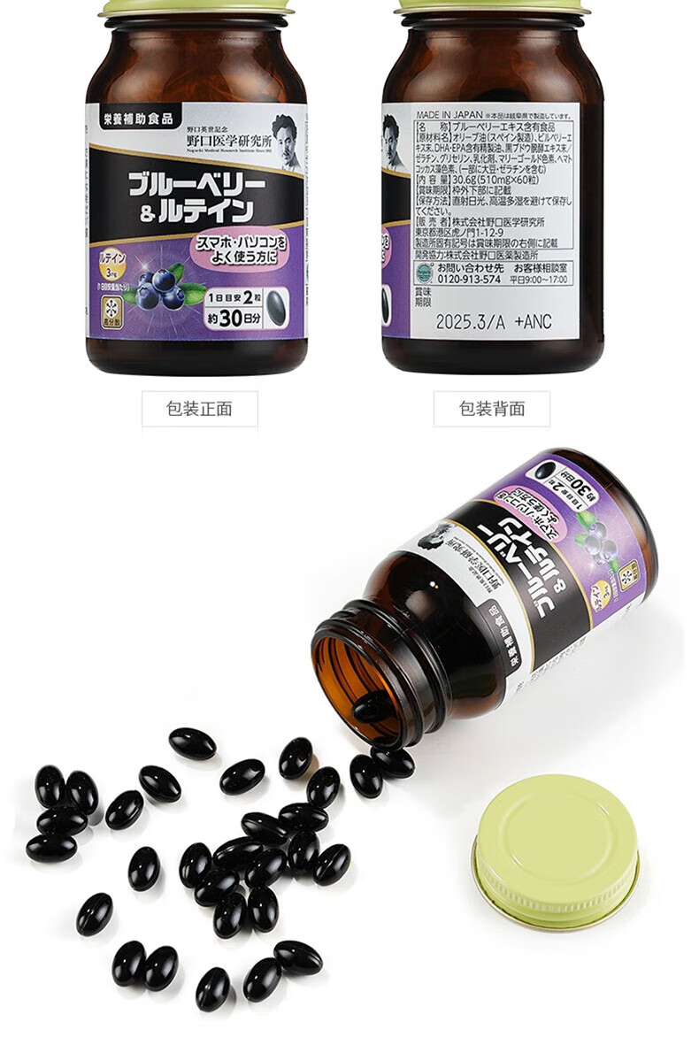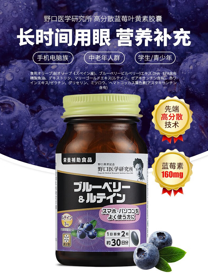 Noguchi Japanese blueberry lutein supplements eye nutrition to relieve dryness and is rich in anthocyanins and blueberry eye care. Three bottles for 90 days.