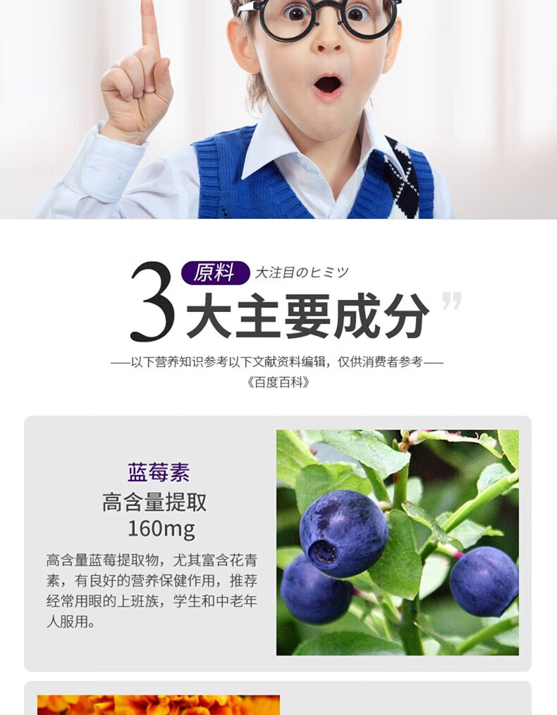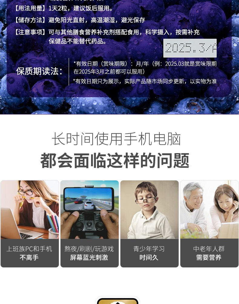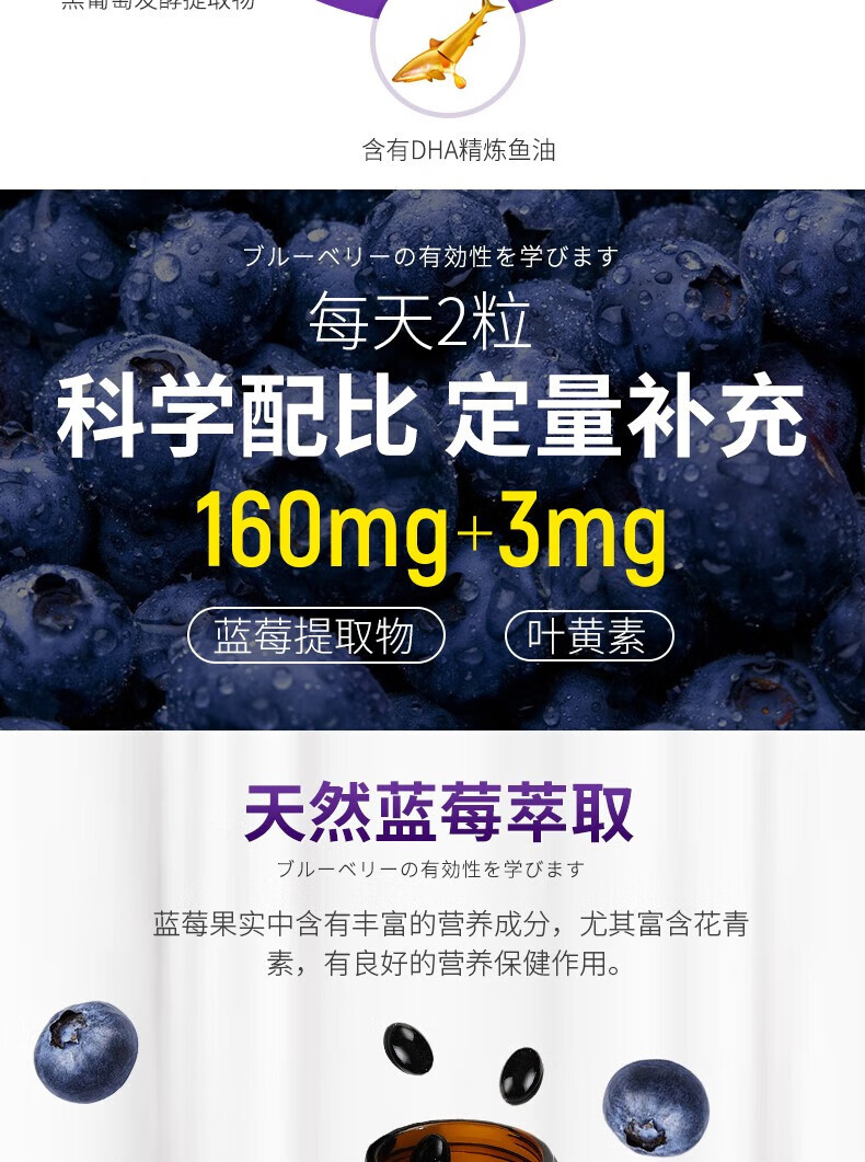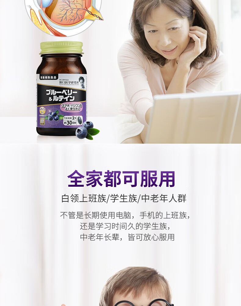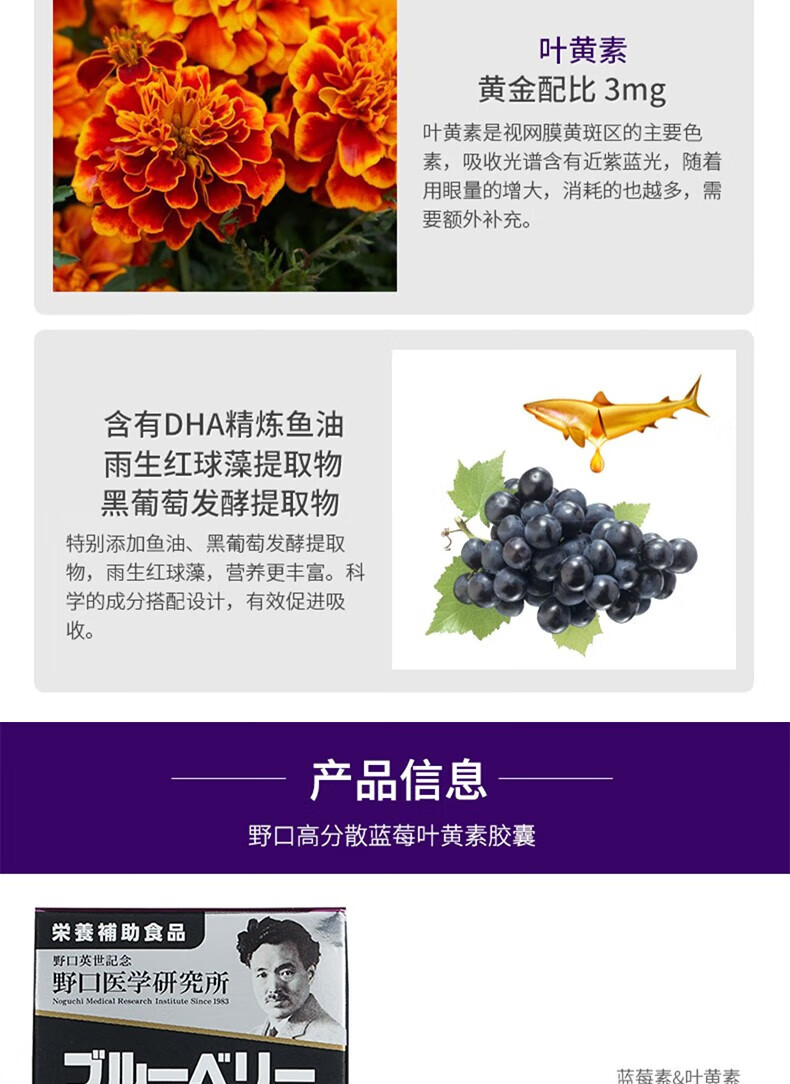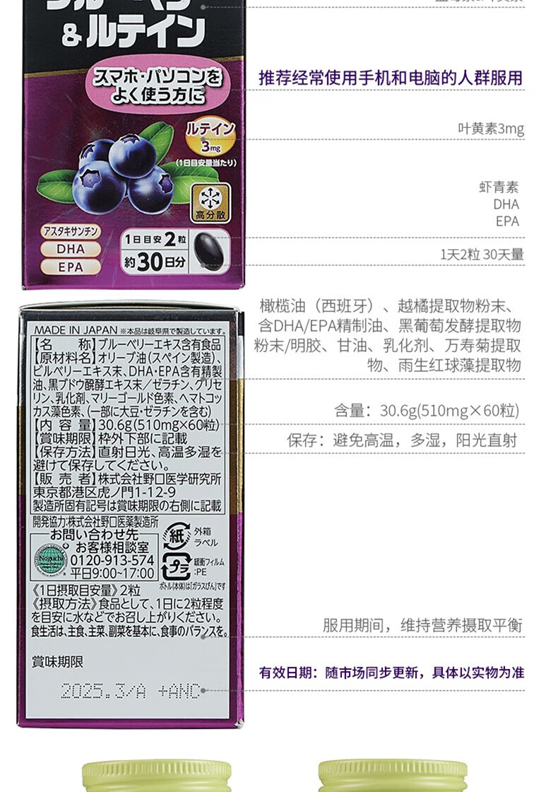 Noguchi Japanese blueberry lutein supplements eye nutrition to relieve dryness and is rich in anthocyanins and blueberry eye care. Three bottles for 90 days.