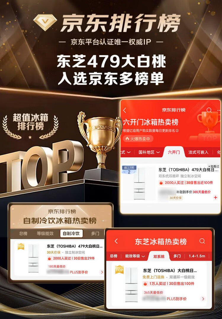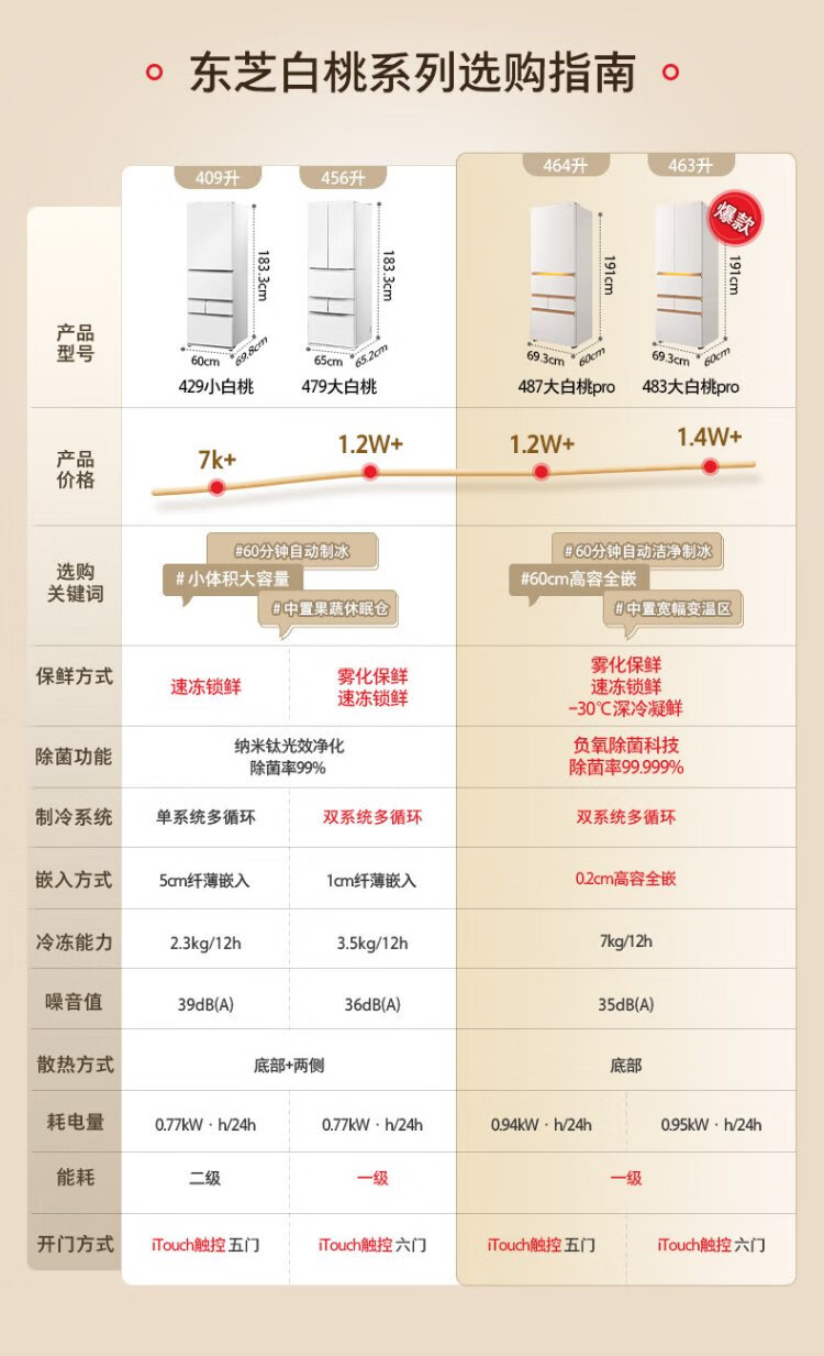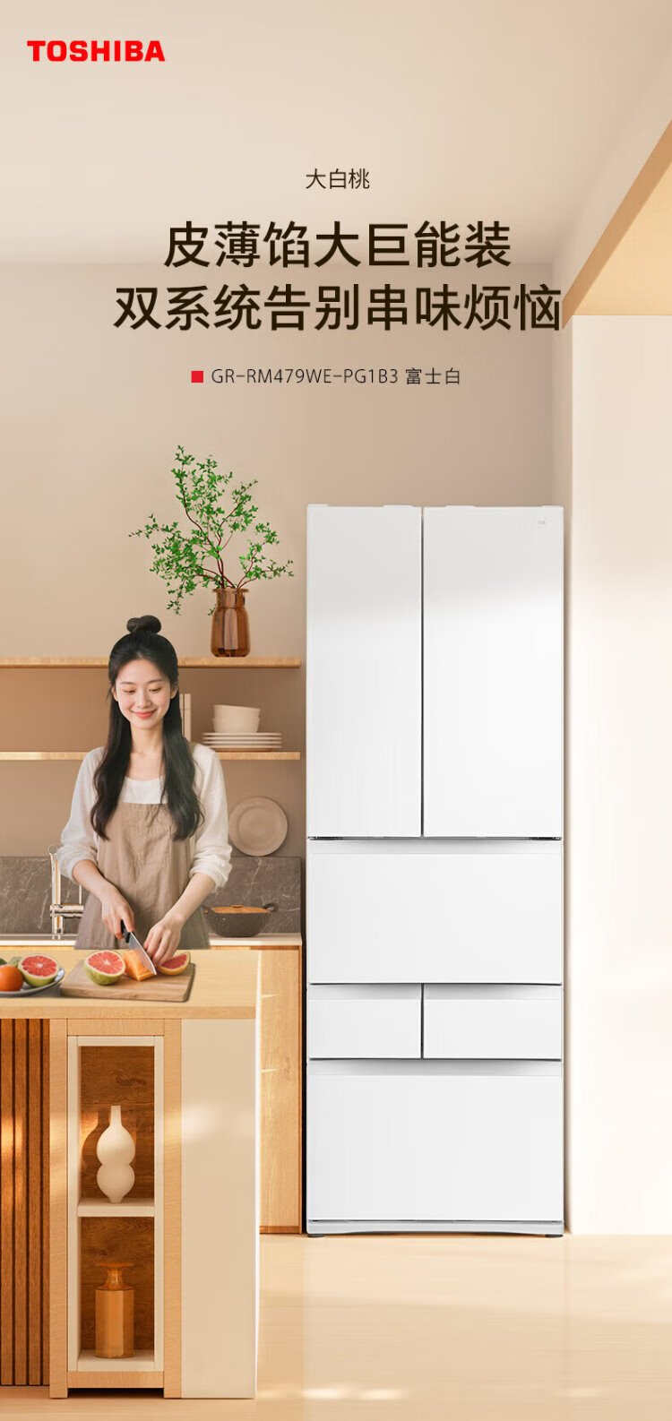 TOSHIBA Dabai Peach 479 Japanese-style multi-door dual-system circulation first-level energy-efficiency frequency conversion ultra-thin embedded automatic ice making and sterilization air-cooled and frost-free state-subsidized household refrigerator GR-RM479WE-PG1B3 Fuji White