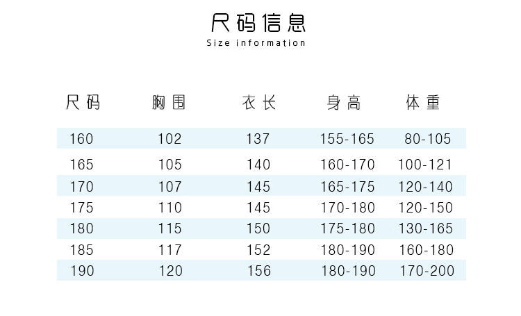 China (cm) 165 / 88-90 170 / 96-98 175 / 108-110 180 / 118-122 185 / 126-130
