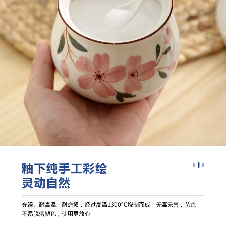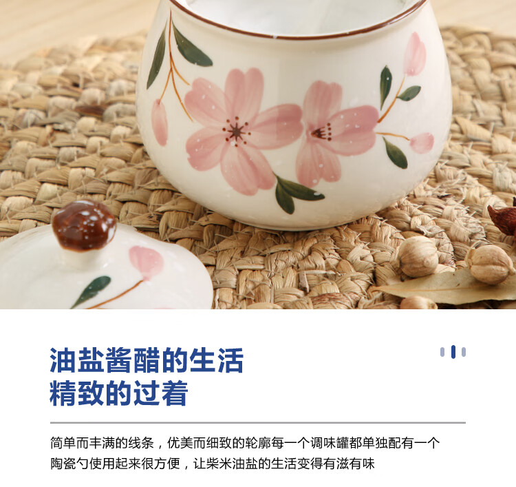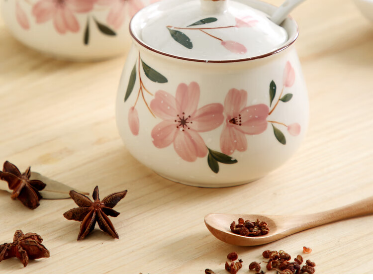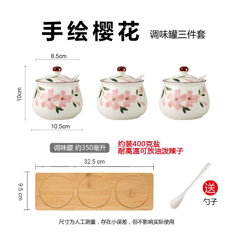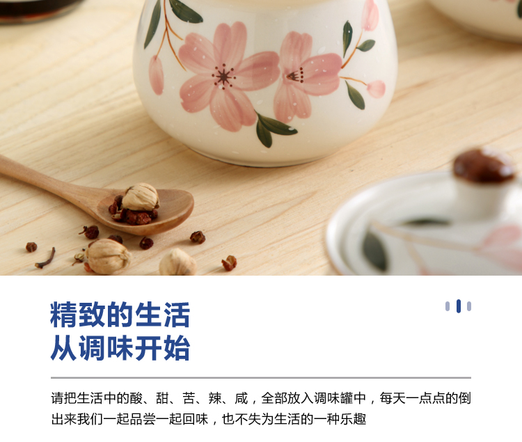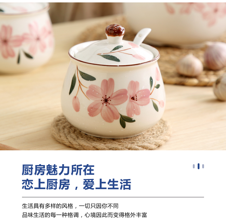 Duomeiran kitchen high-end seasoning jar ceramic salt jar chili jar household seasoning box seasoning bottle jar seasoning combination set Sakura three-piece set + ceramic plate