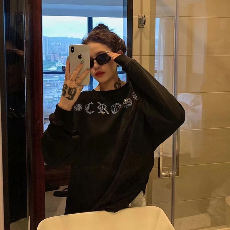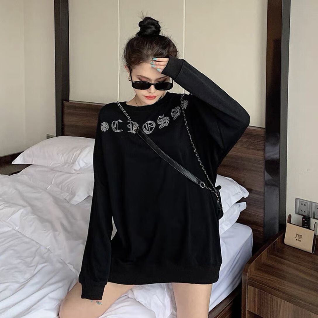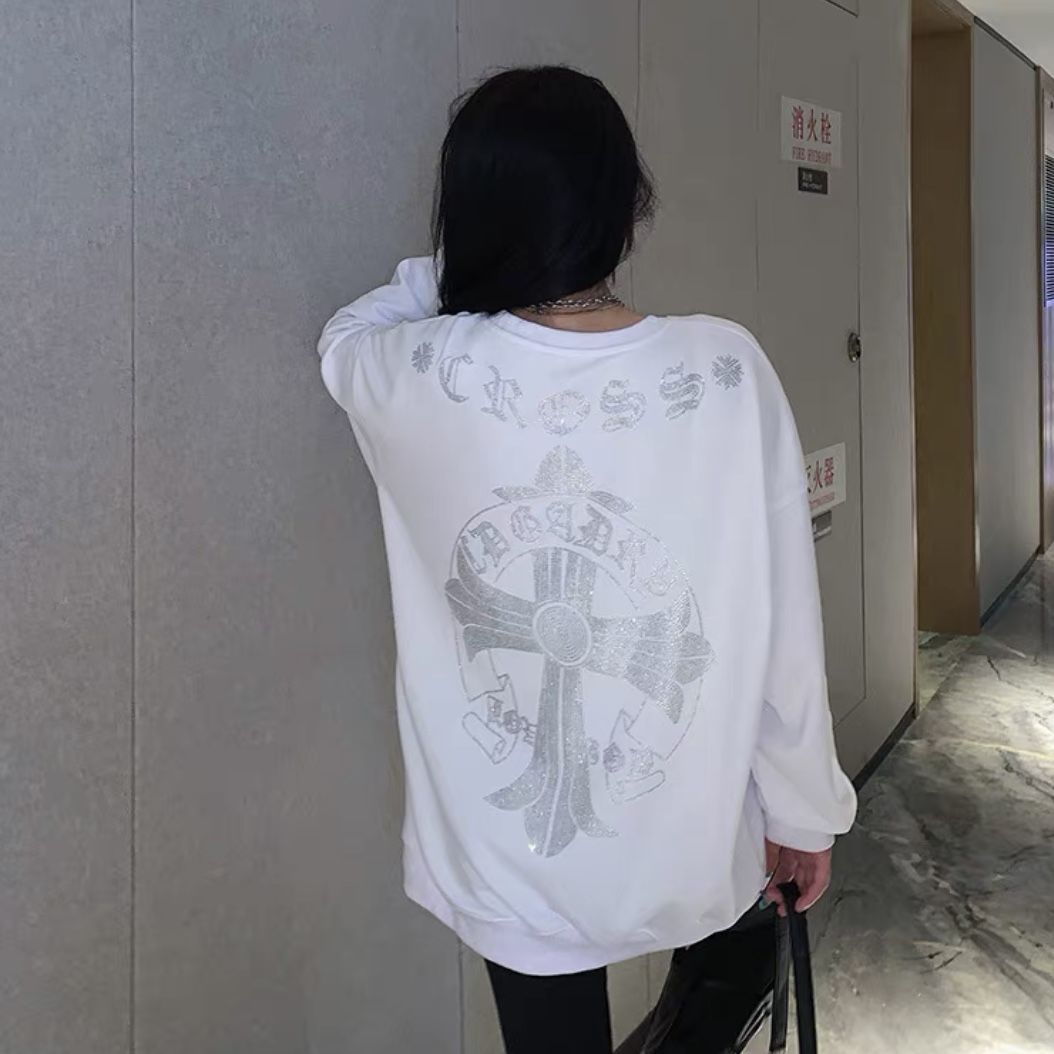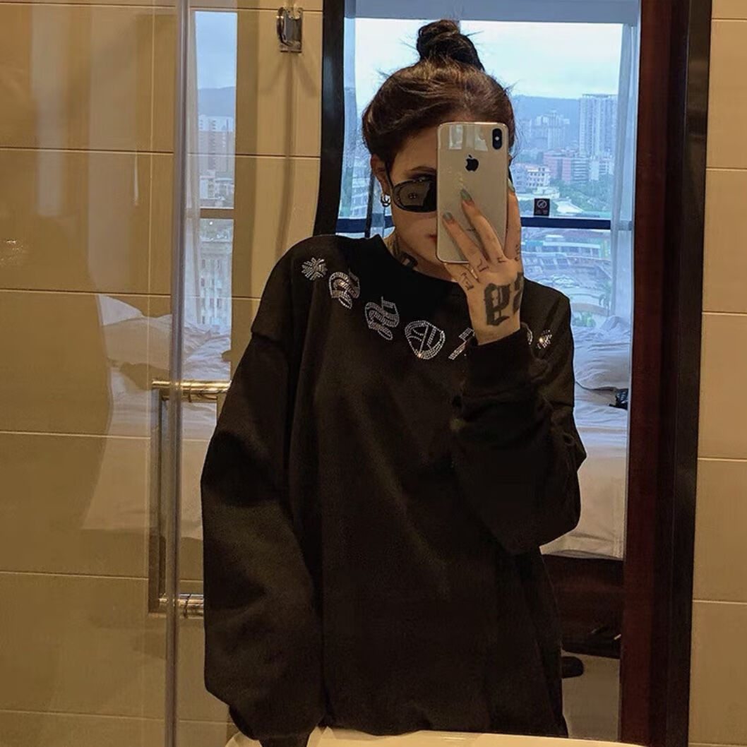 Shangjianfen women's niche 2025 spring and autumn new ins trendy brand hot diamond sweatshirt for women European and American heavy industry Sanskrit cross loose cross hot diamond sweatshirt - black high quality thin section XXS recommended 10Jin Jin equal to 0.5 kg or less