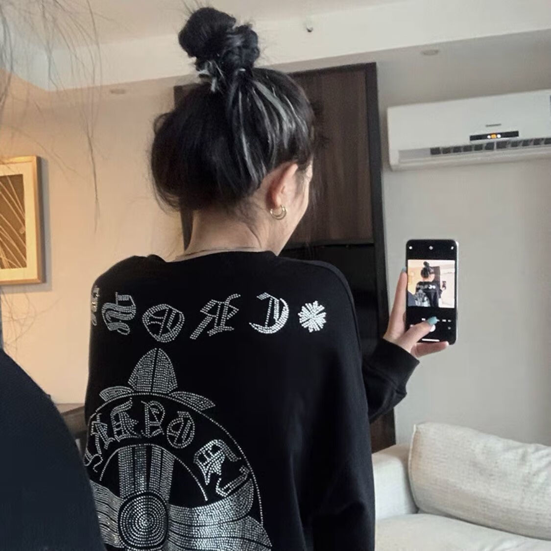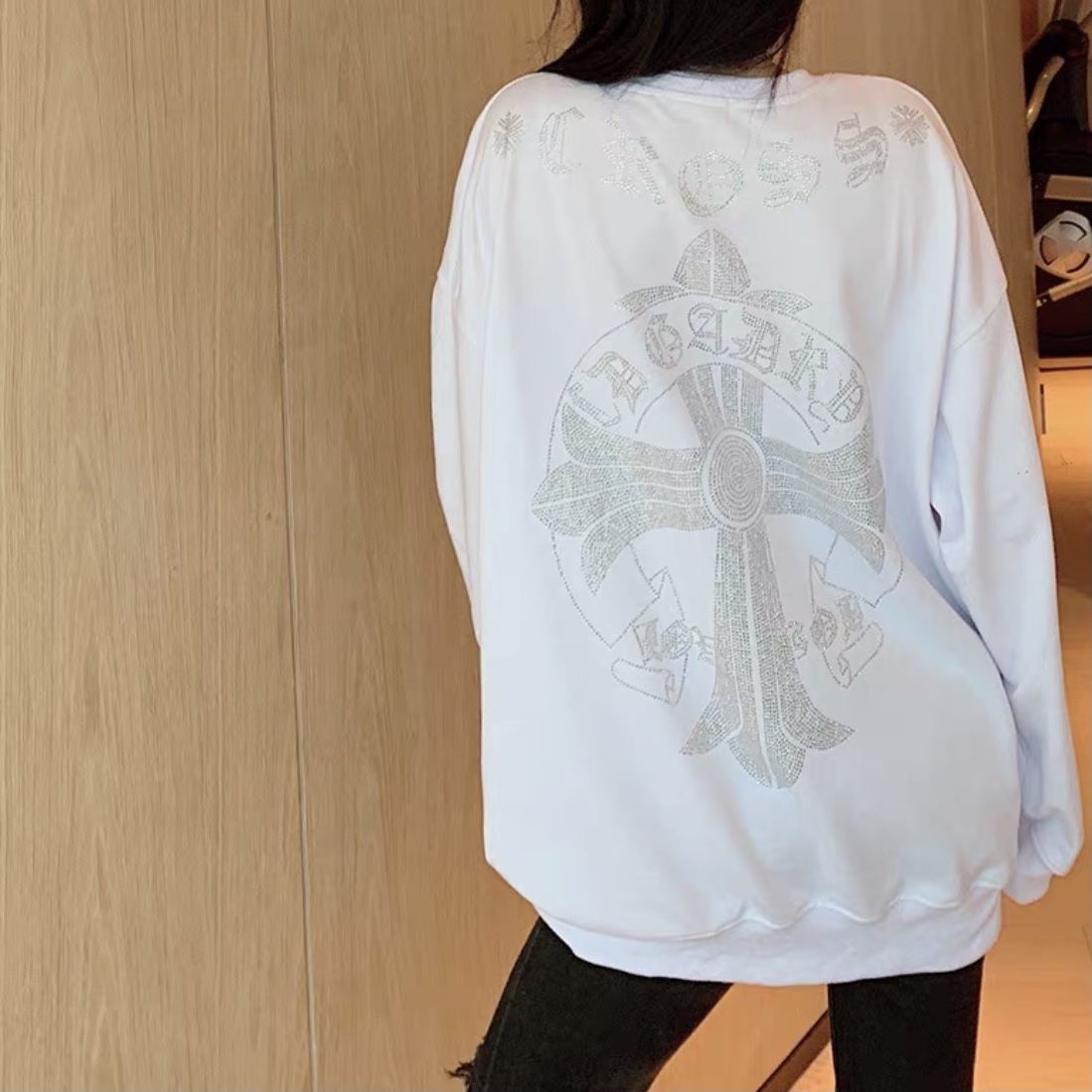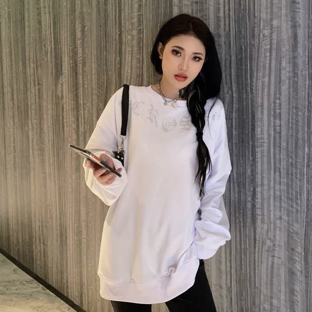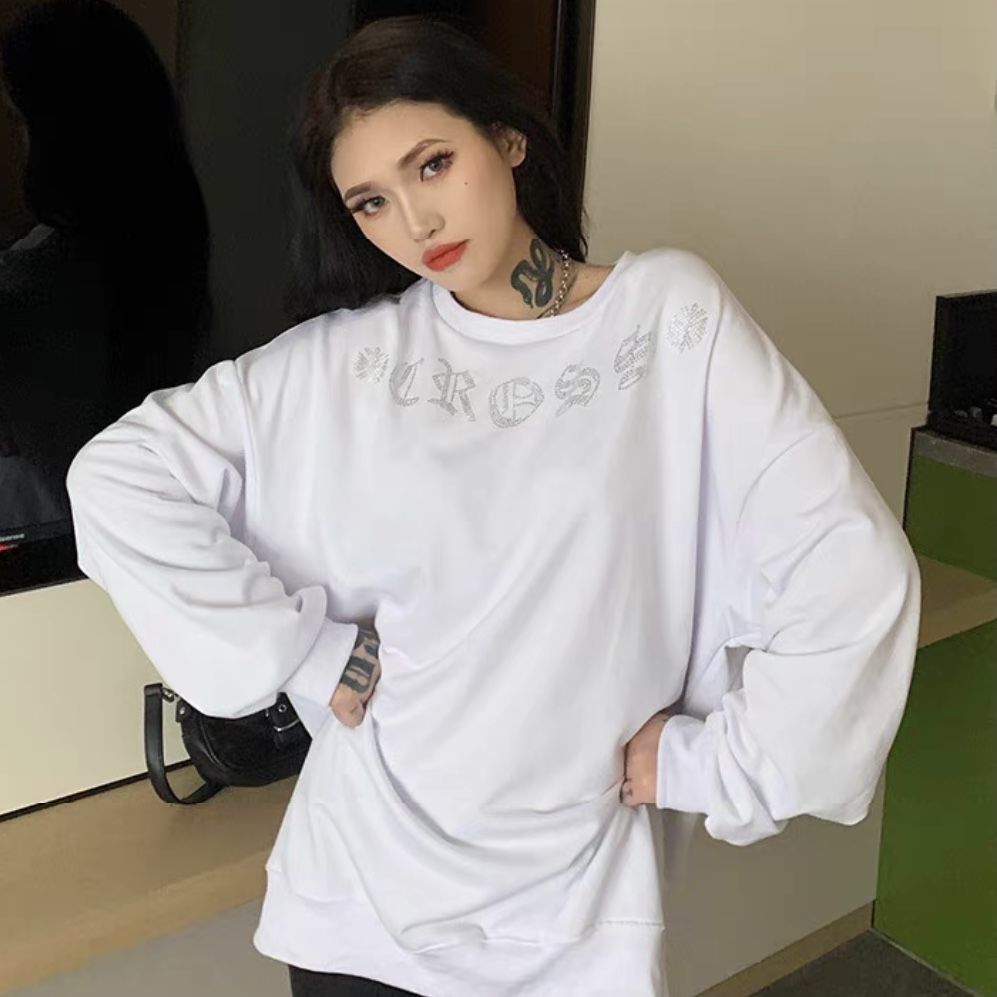 Shangjianfen women's niche 2025 spring and autumn new ins trendy brand hot diamond sweatshirt for women European and American heavy industry Sanskrit cross loose cross hot diamond sweatshirt - black high quality thin section XXS recommended 10Jin Jin equal to 0.5 kg or less