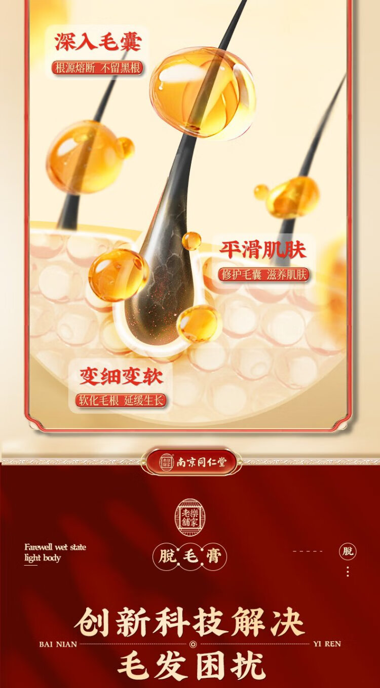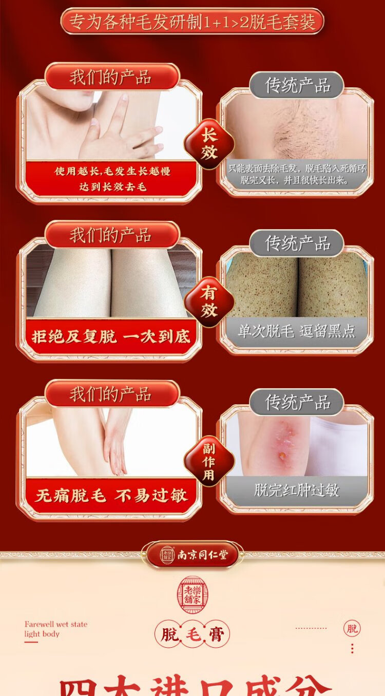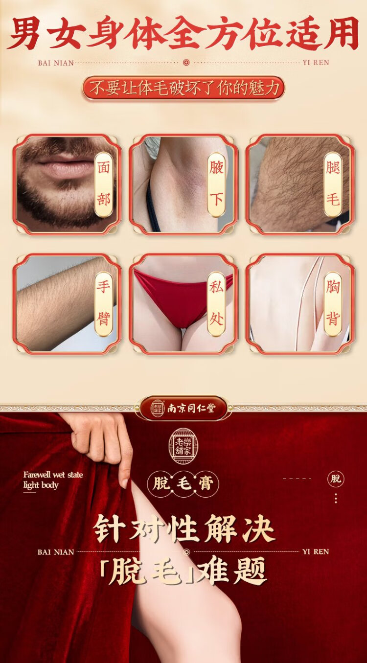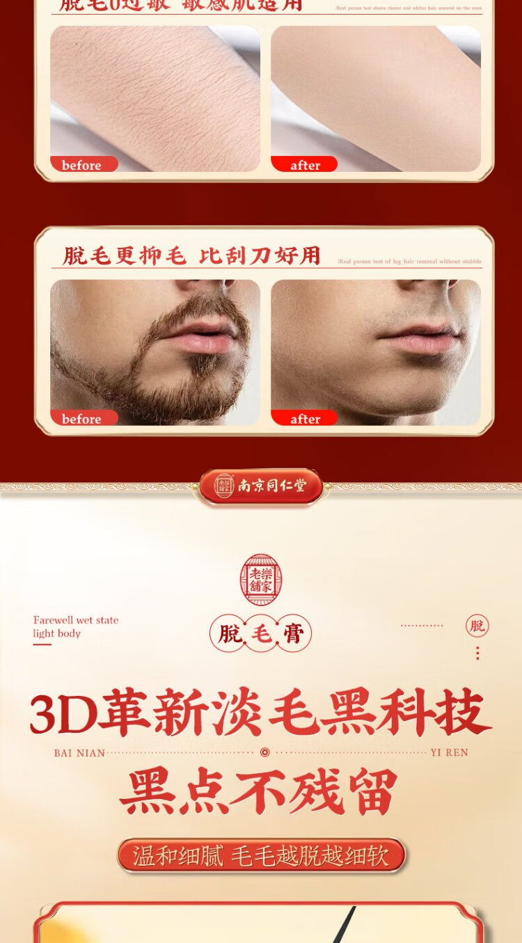 Nanjing Tongrentang Hair Removal Cream permanently removes hair roots and no longer grows in private areas, beard, armpits, facial armpit hair, and body for men and women. A box of 69 100g hair removal cream + 50ml essence