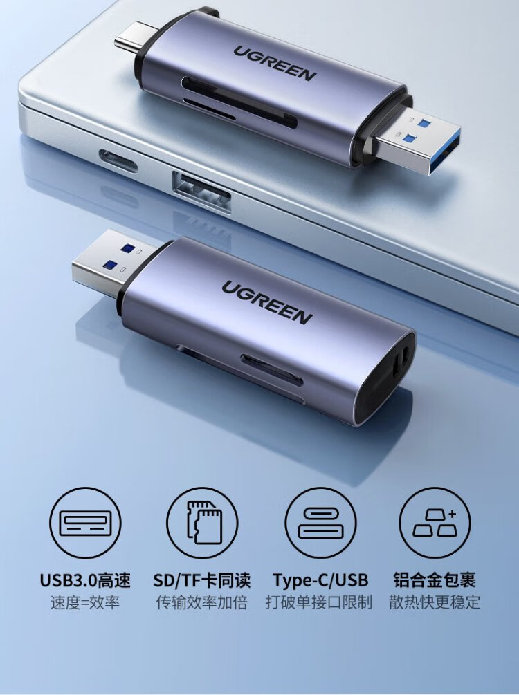 Greenlink USB/Type-C3.0 high-speed 4.0 card reader multi-function in one SD/TF card reader OTG suitable for mobile phone camera driving recorder surveillance camera memory card Type-C+USB 3.0 dual card single reading aluminum shell
