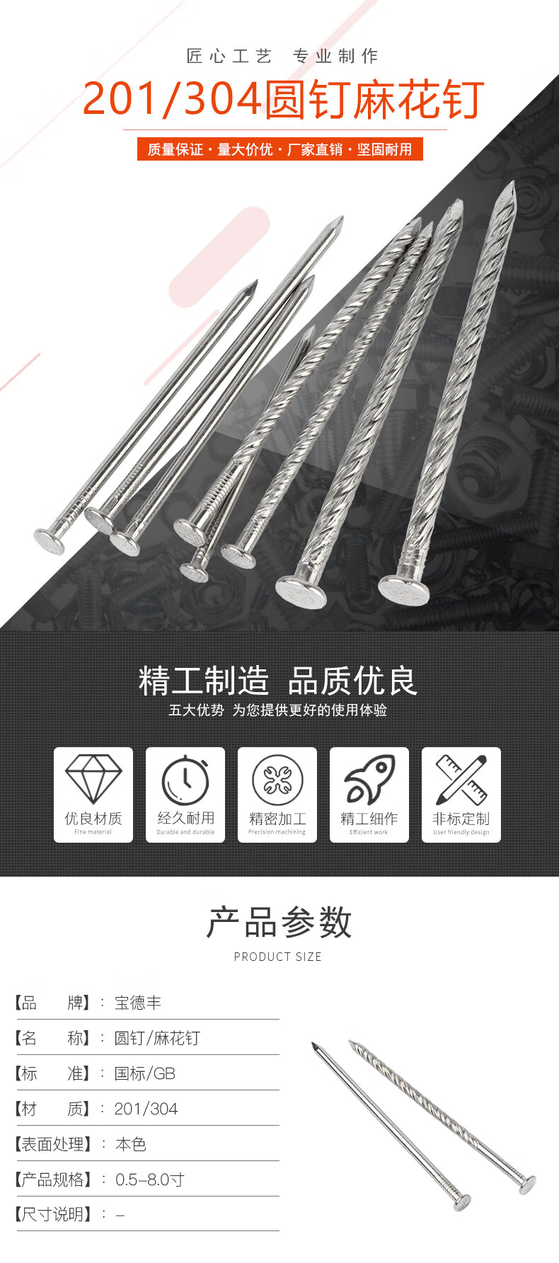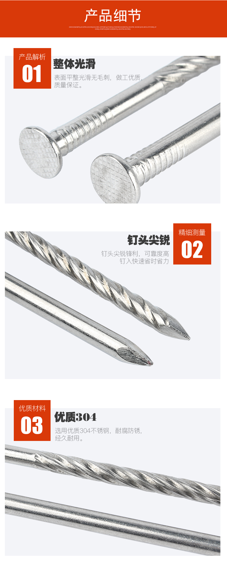 Baodefeng 304 stainless steel round nails, steel nails, yuan nails, woodworking nails, cement nails, extended twist nails, foreign nails, floor nails, 1.5 inches, 304 round nails, 1.2 inches (about 50 pcs)