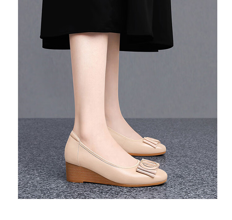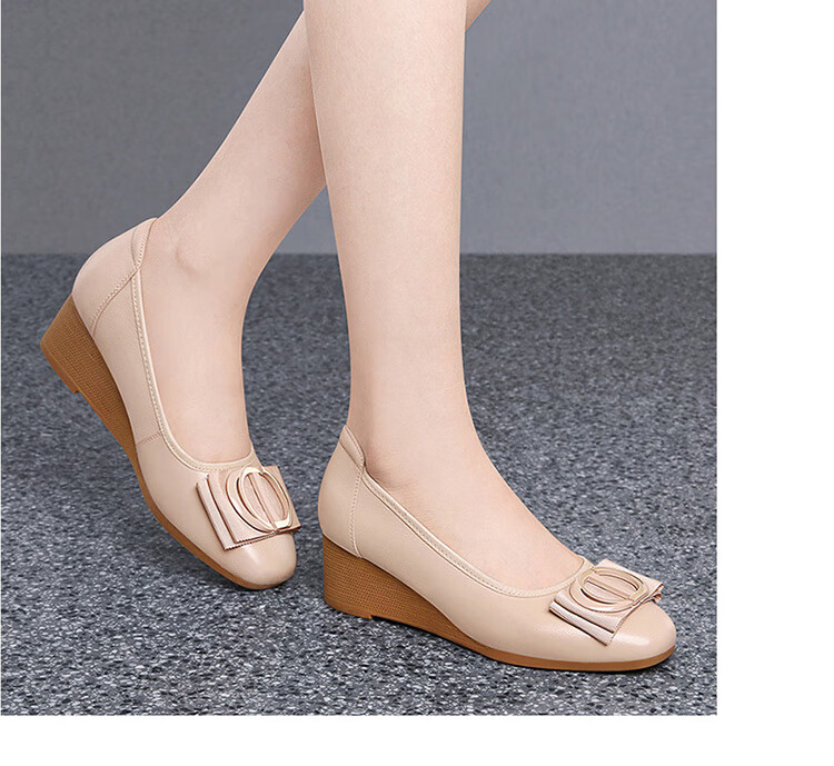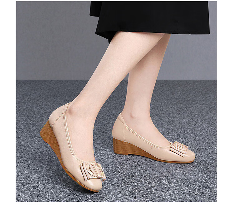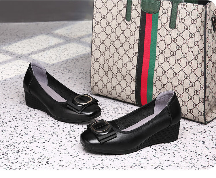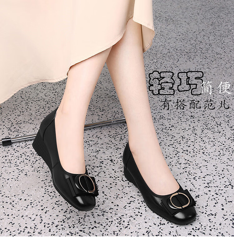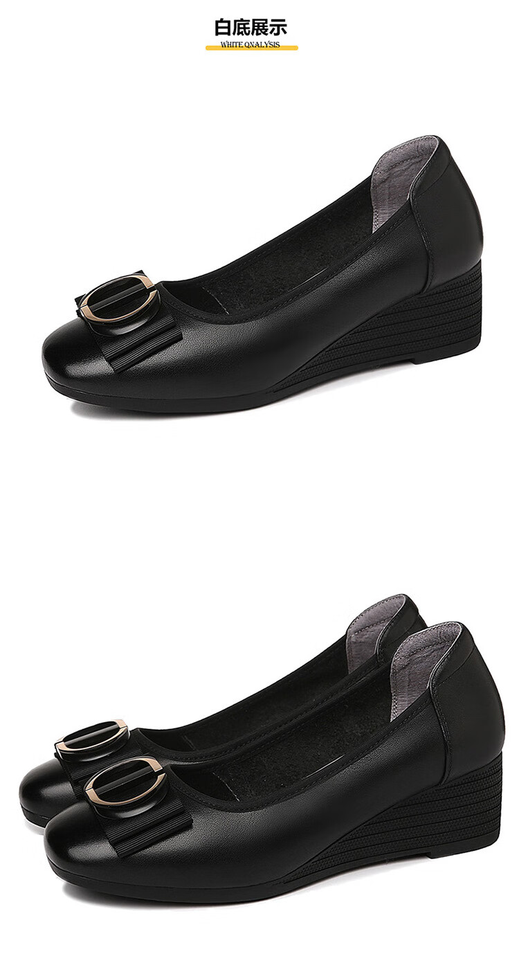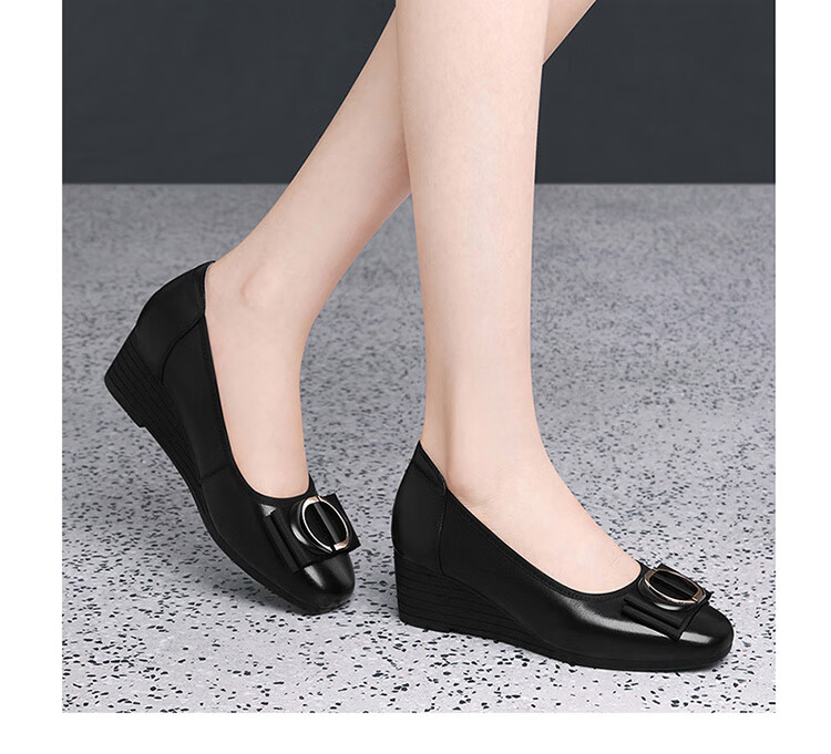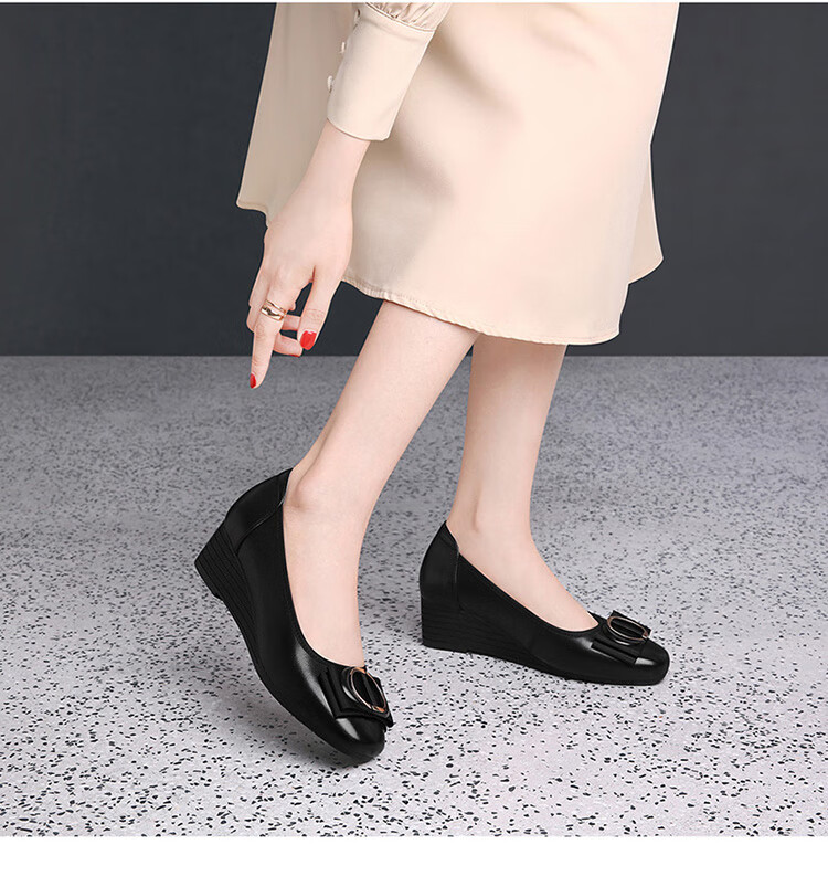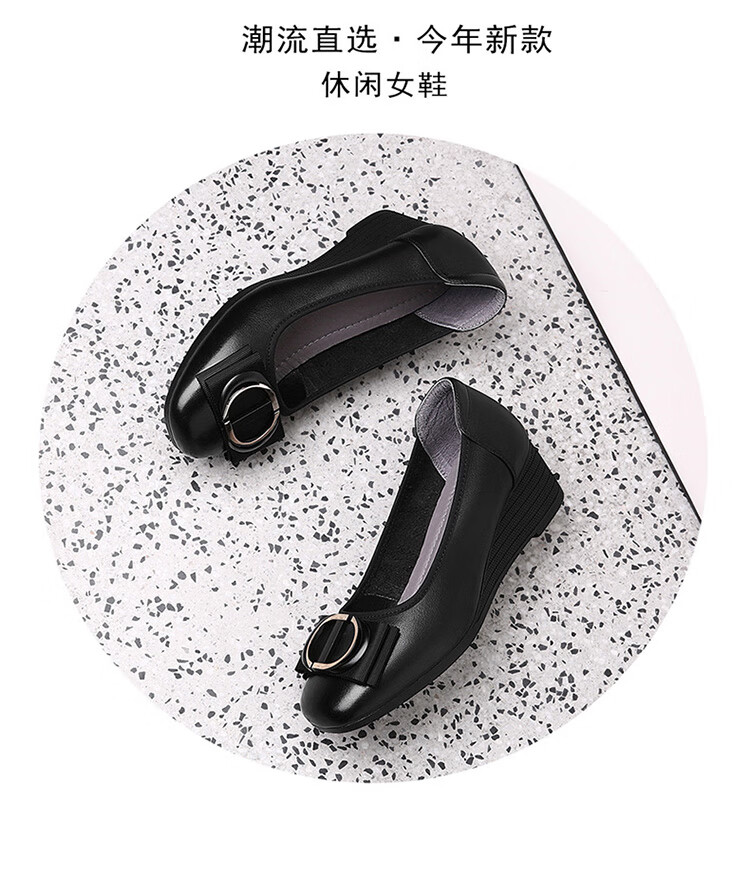 Fuguiniao first-layer cowhide single shoes for women 2024 spring new wedge heel women's shoes thick heel mom and grandma shoes soft sole soft leather shoes black 36