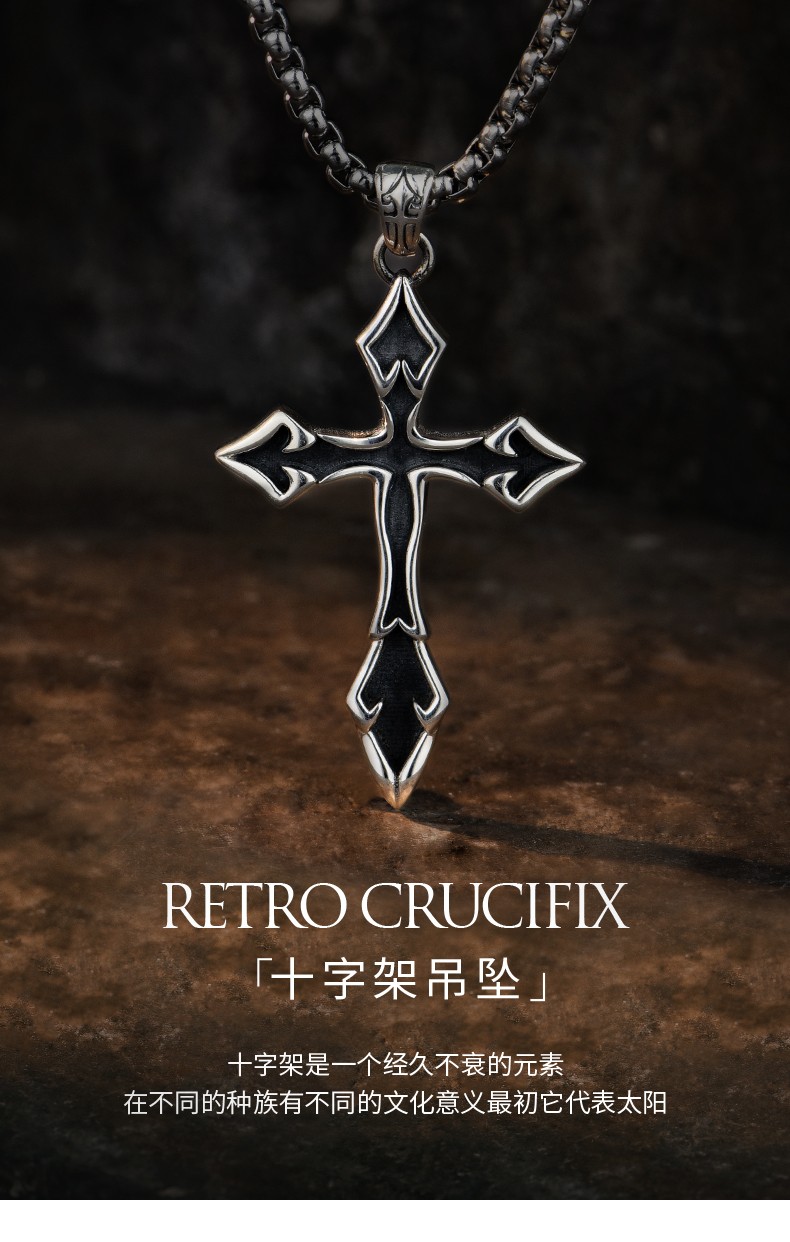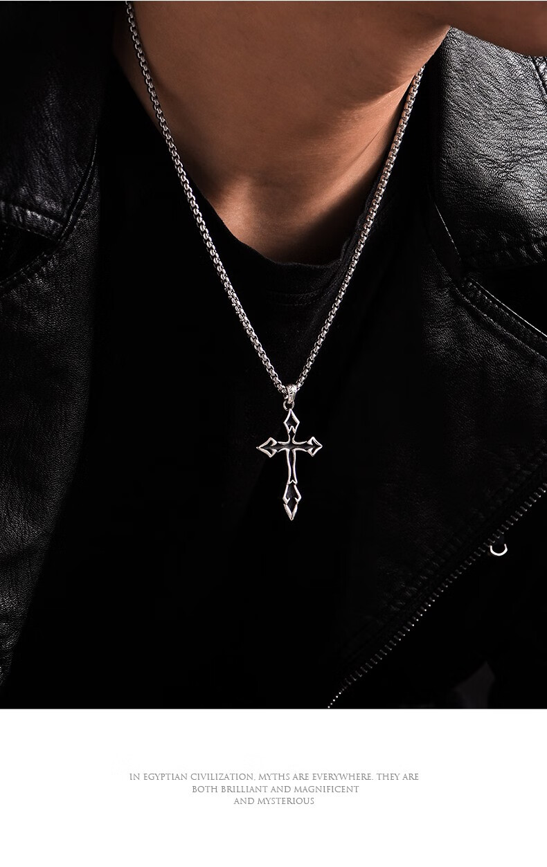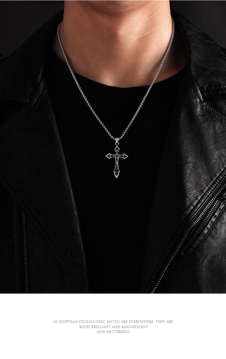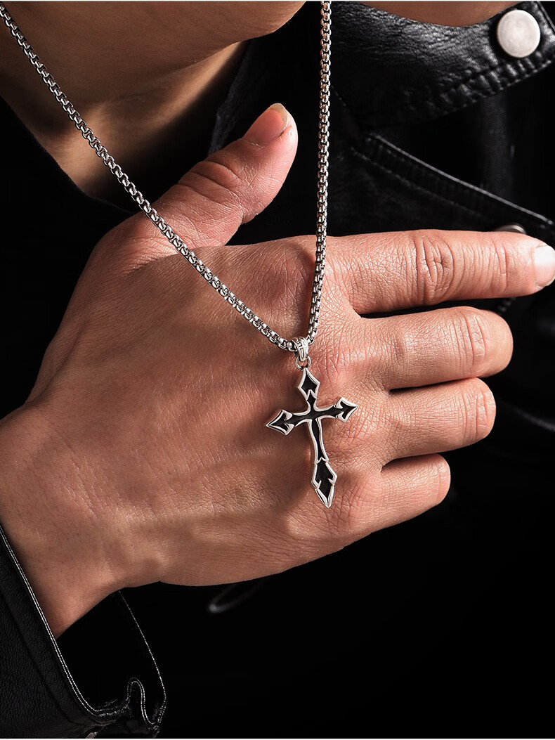 IDEAGEMER925 silver cross necklace men's personality retro niche simple versatile handsome boy pendant clavicle chain trend cross pendant + titanium steel chain 60CM supports engraving