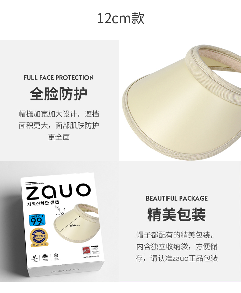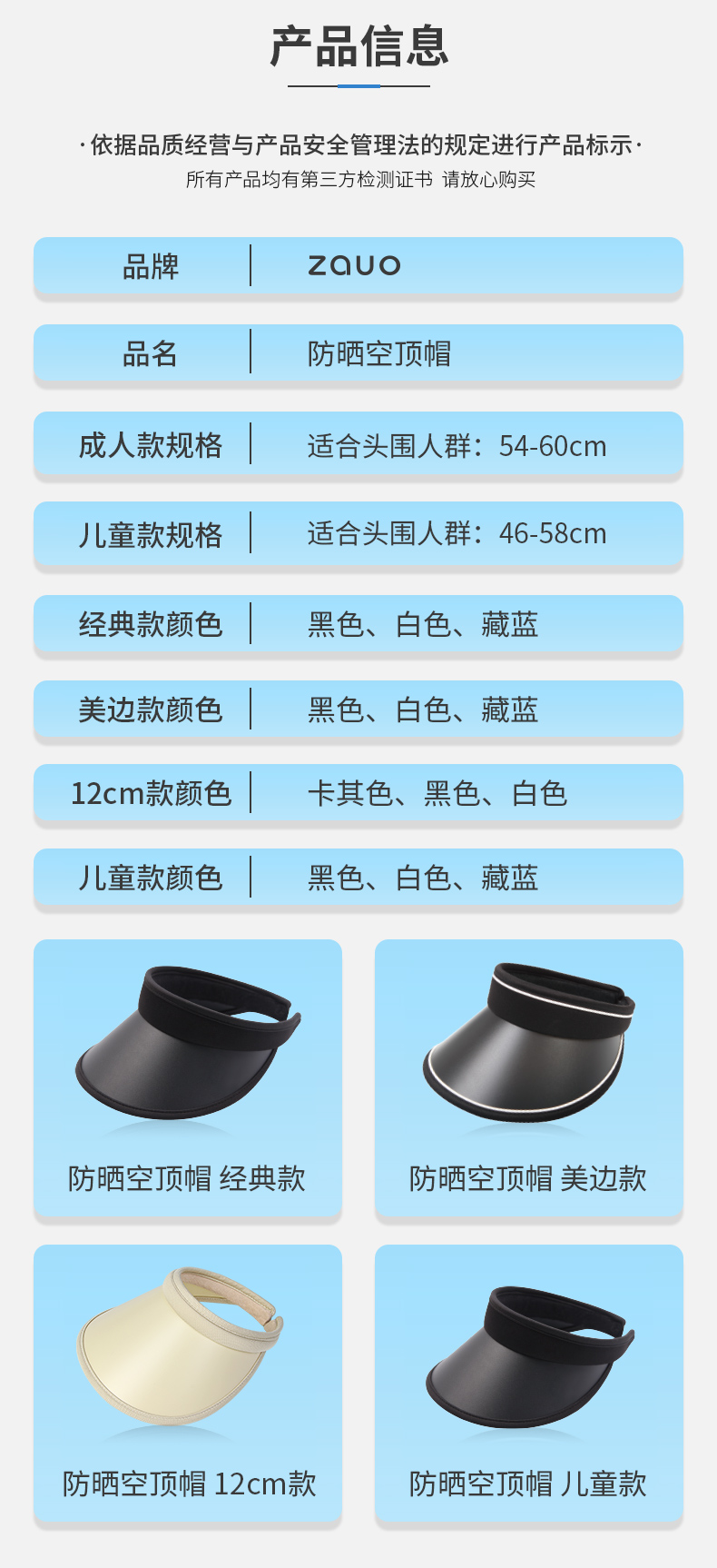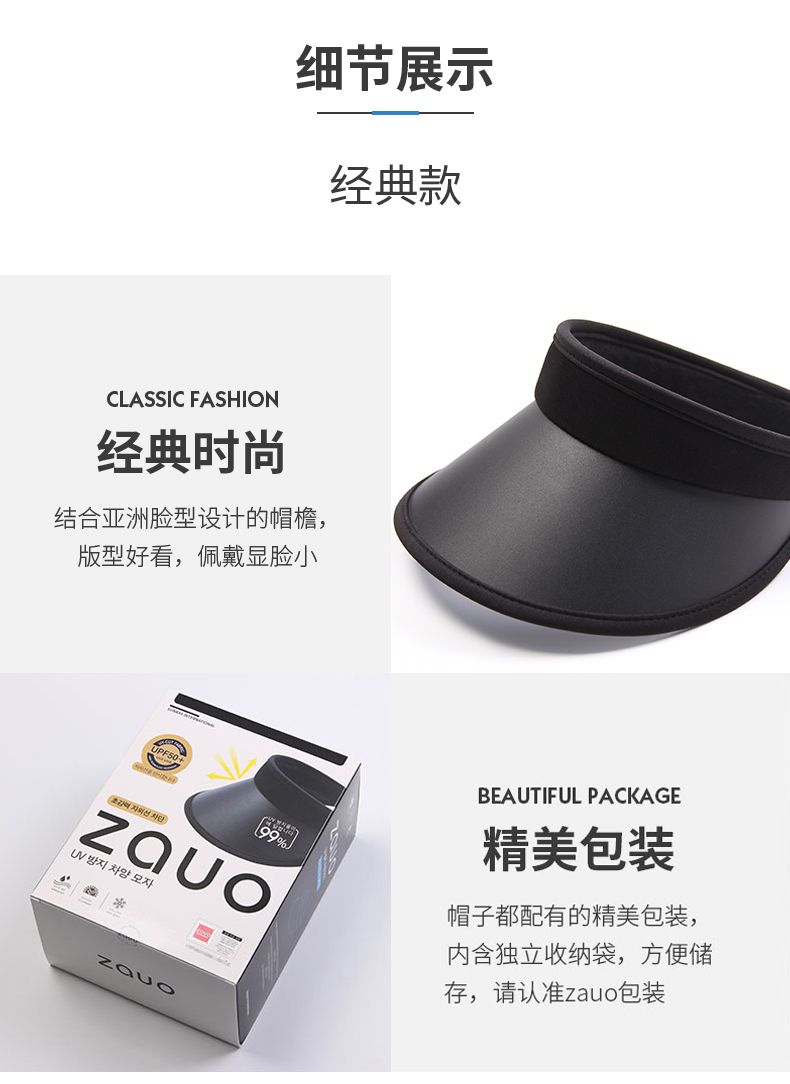 Zauo Korea zauo empty top hat summer cycling sun protection hat large brim beach women UV protection children men classic black