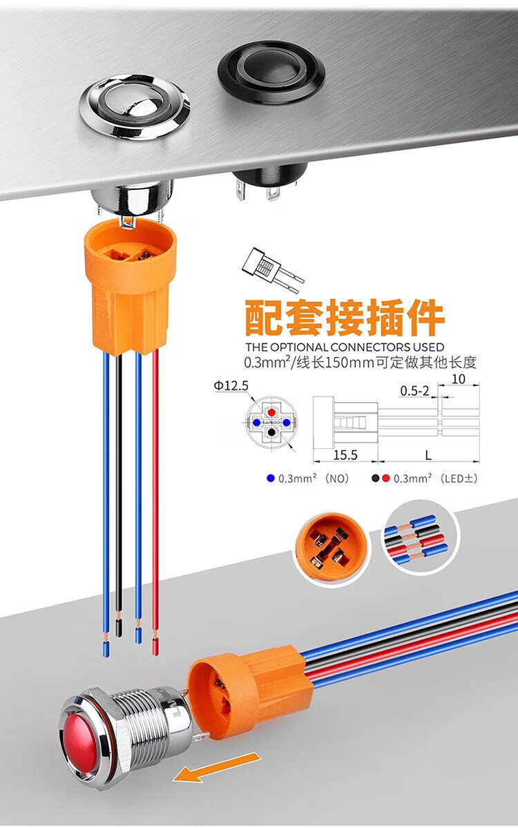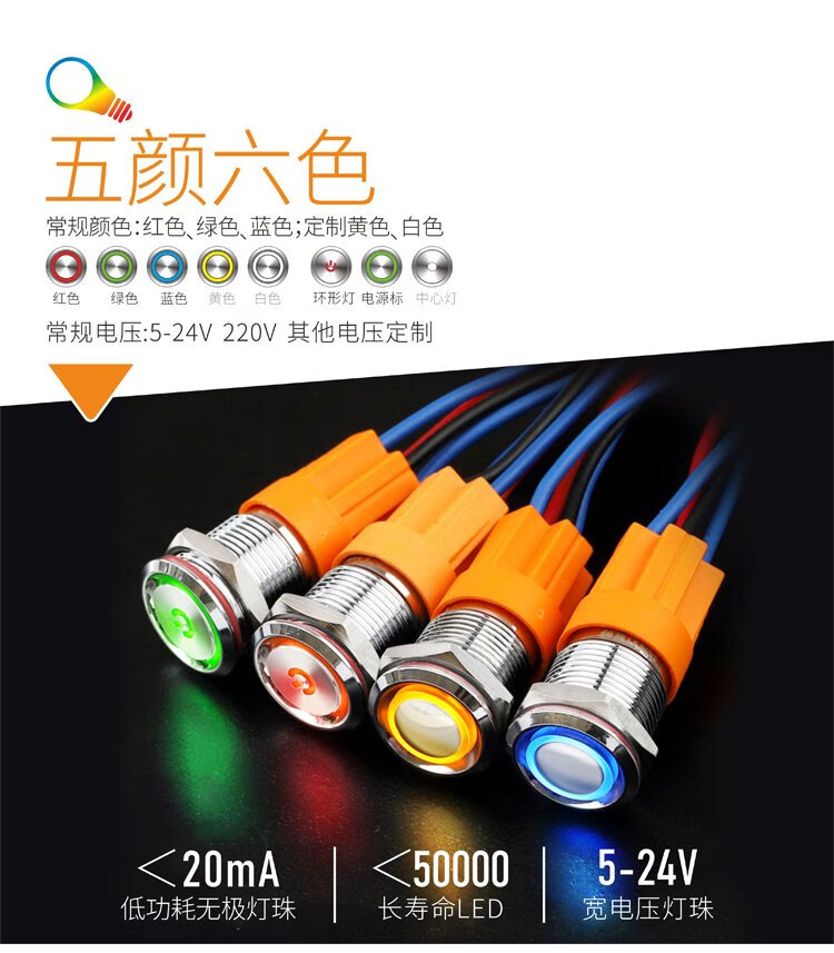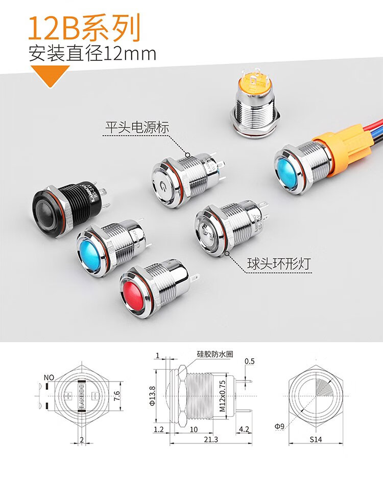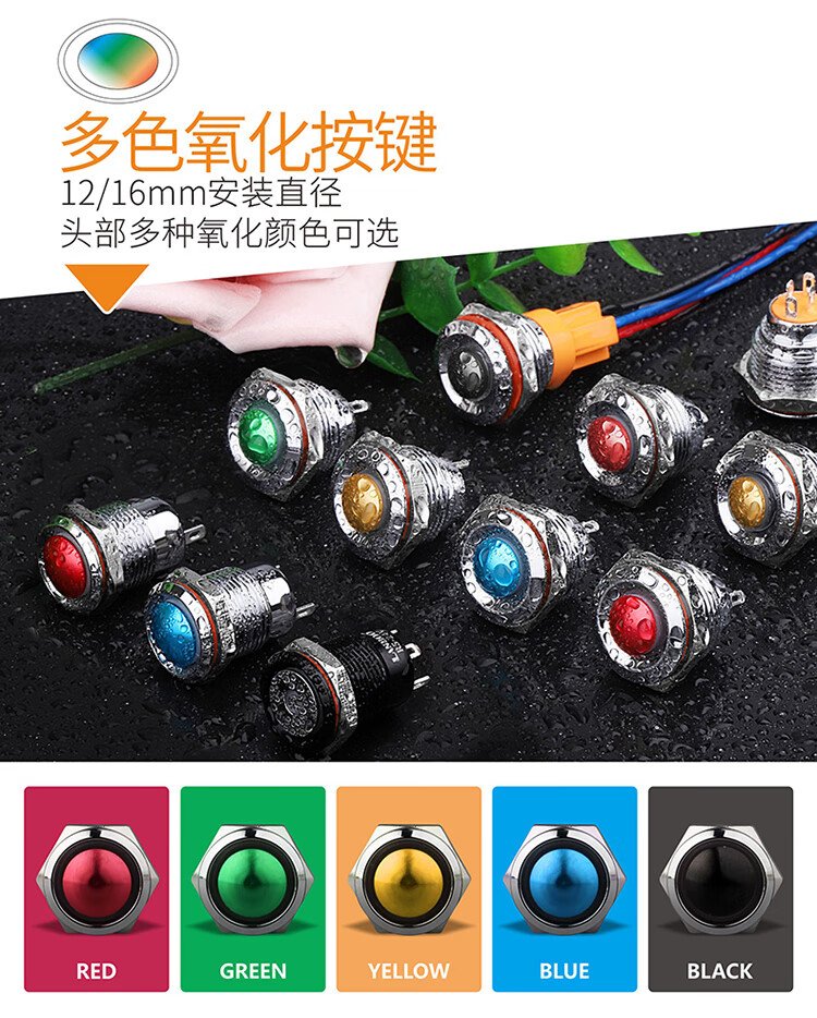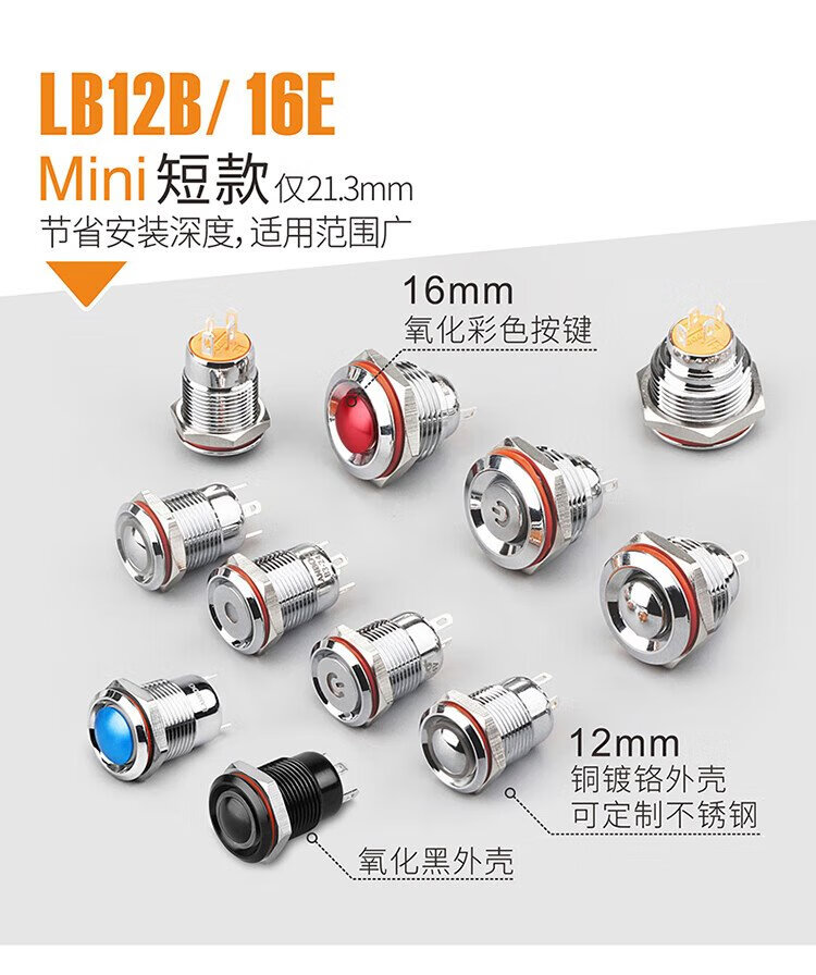 12mm metal button switch ultra-short self-resetting and self-locking optional customized waterproof with lights red, green, blue, yellow and white 24V220V 12B copper chrome-self-resetting-flat head power supply mark-blue light 5-24V