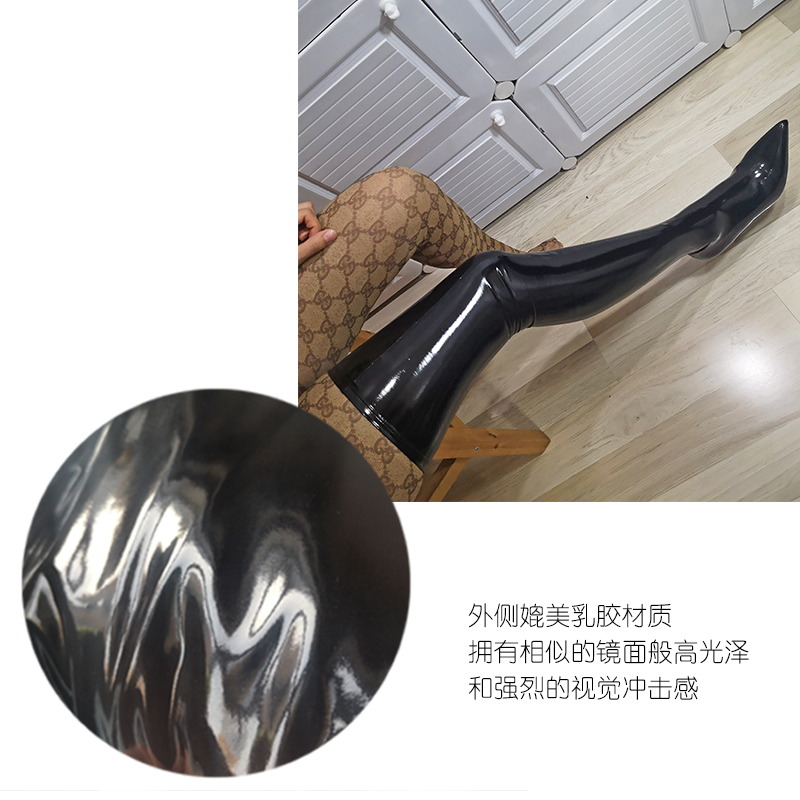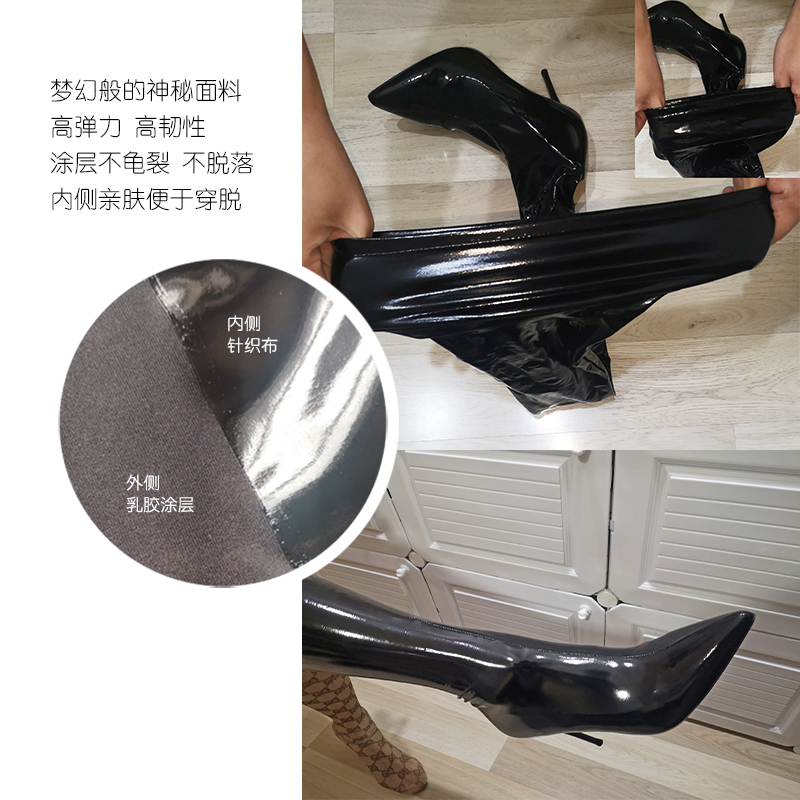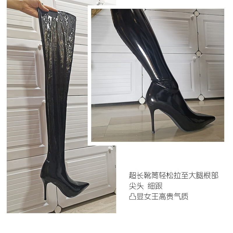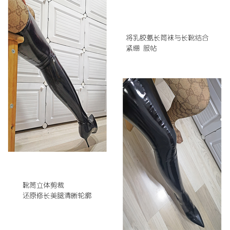 Ftshist sexy sm large size glossy patent leather latex ammonia 9cm ultra-high stiletto pointed toe thigh boots elastic stocking boots over-the-knee boots thigh boots black 38