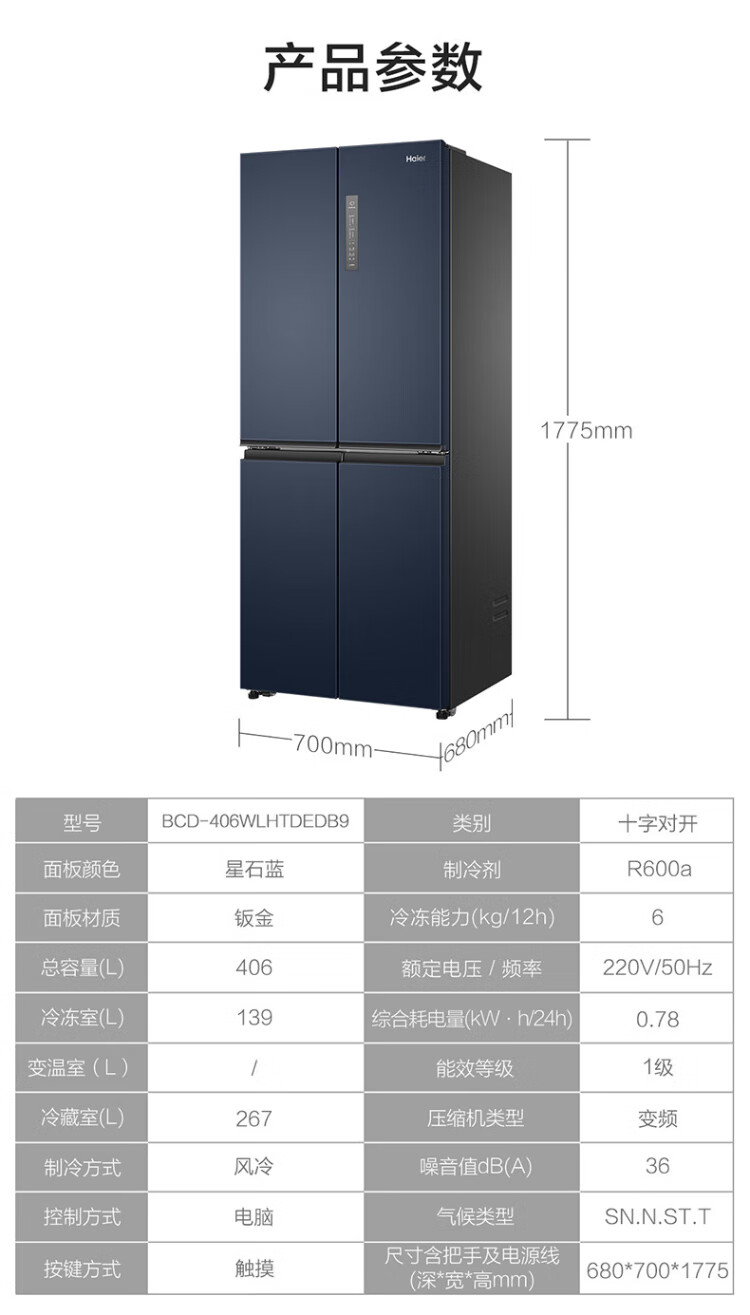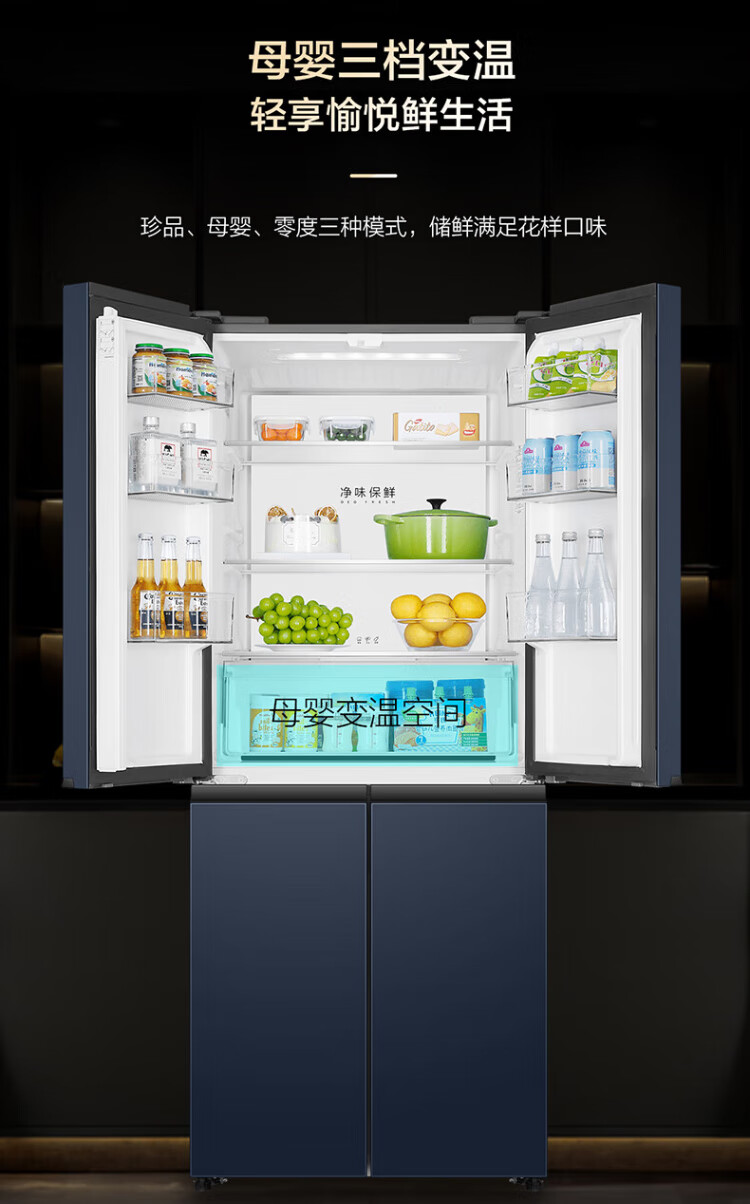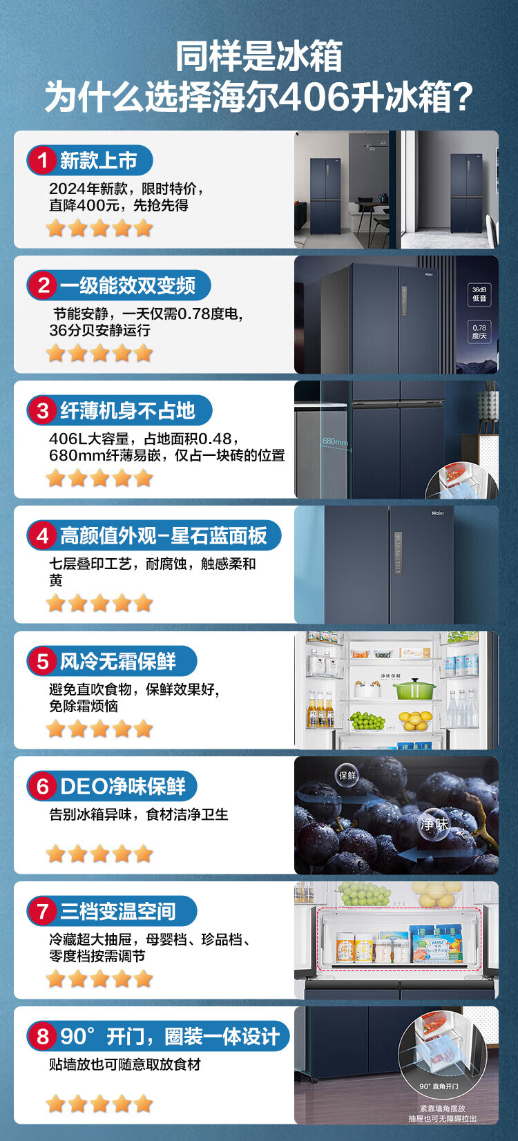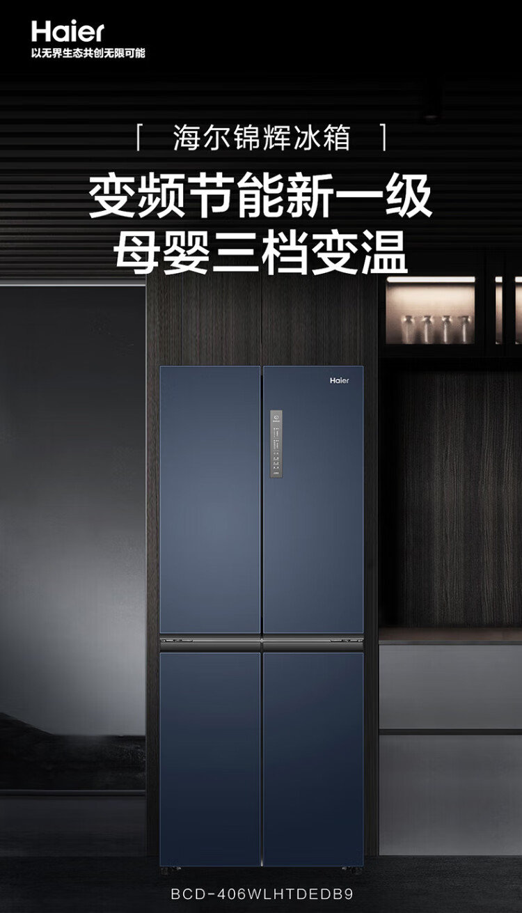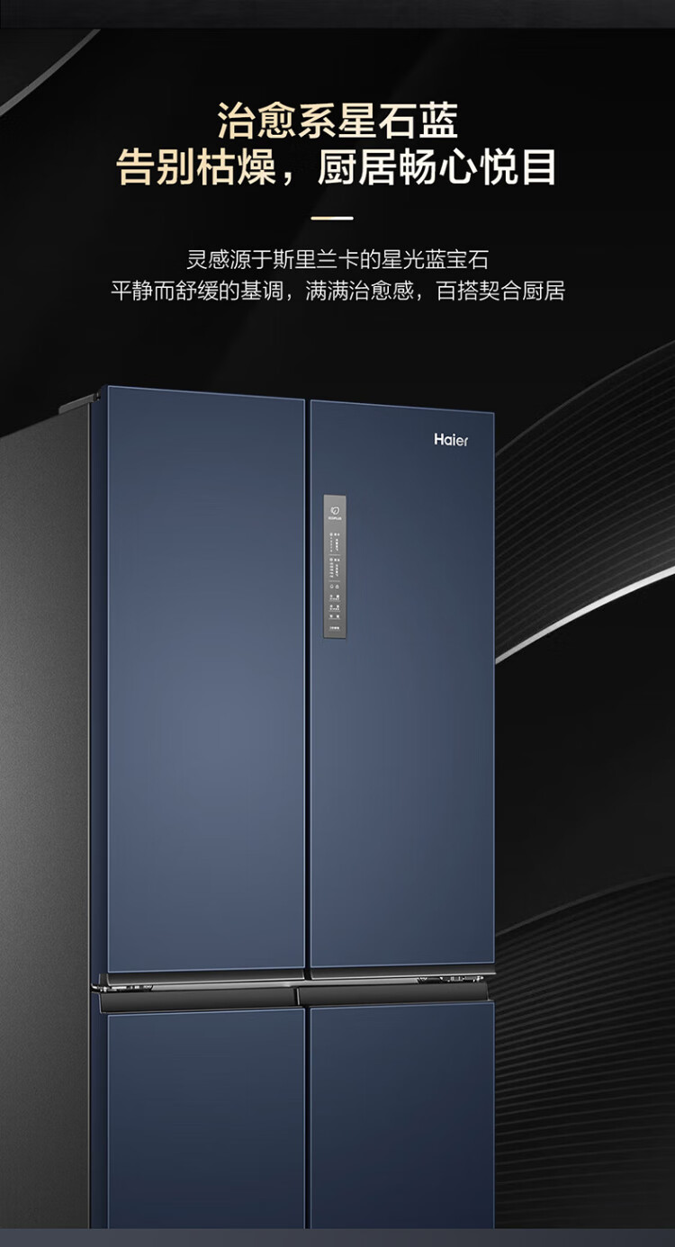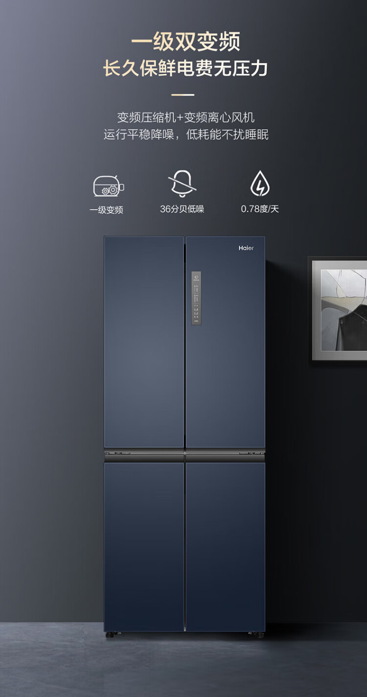 Haier refrigerator 406 liters household four-door cross-door double-door inverter first-level energy efficiency ultra-thin embedded air-cooled frost-free fresh pie series refrigerator state subsidy 15% 406 liters Star Stone Blue + first-level dual inverter + air-cooled frost-free + mother and baby space