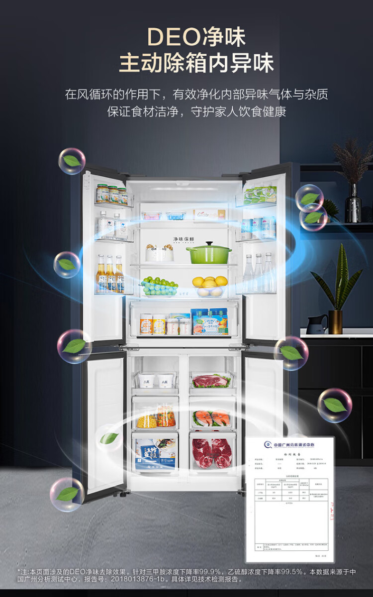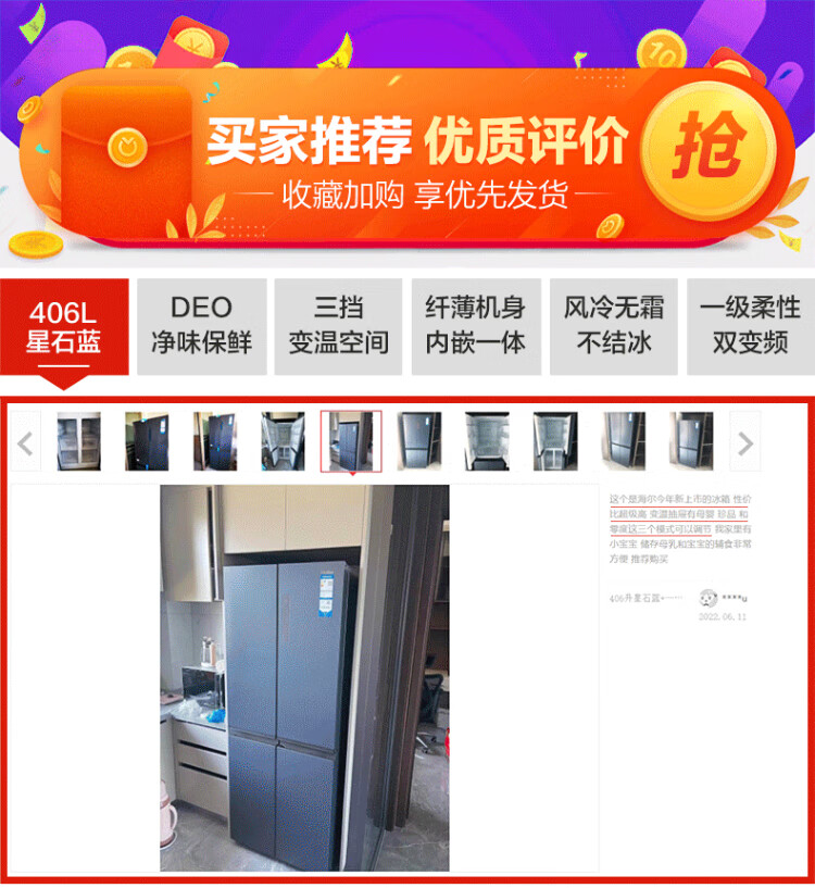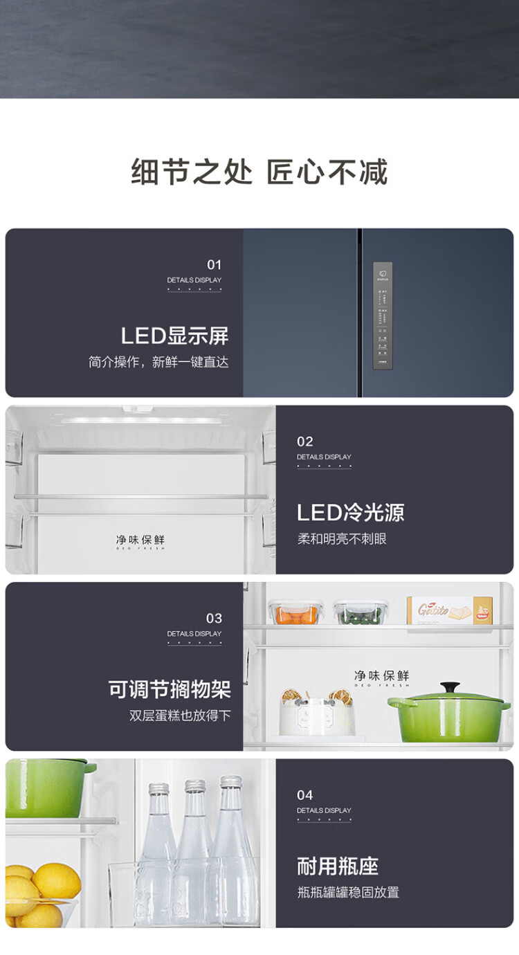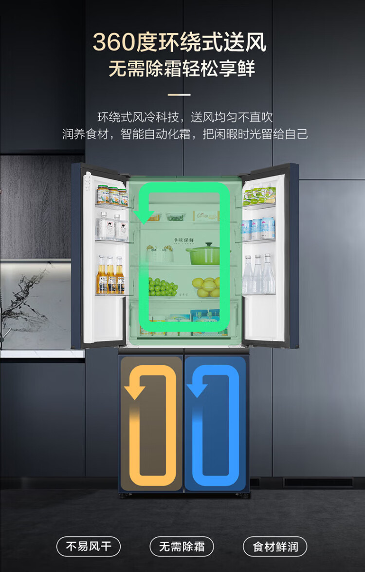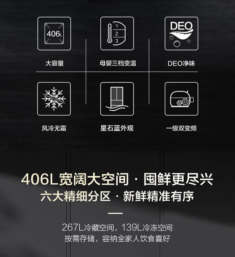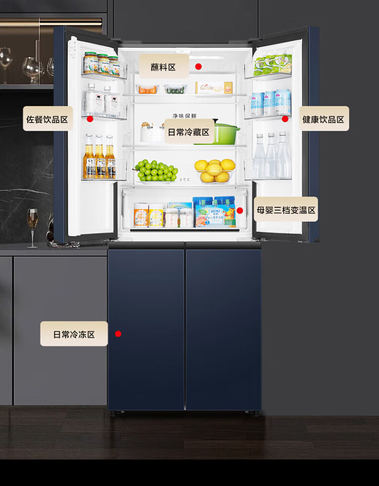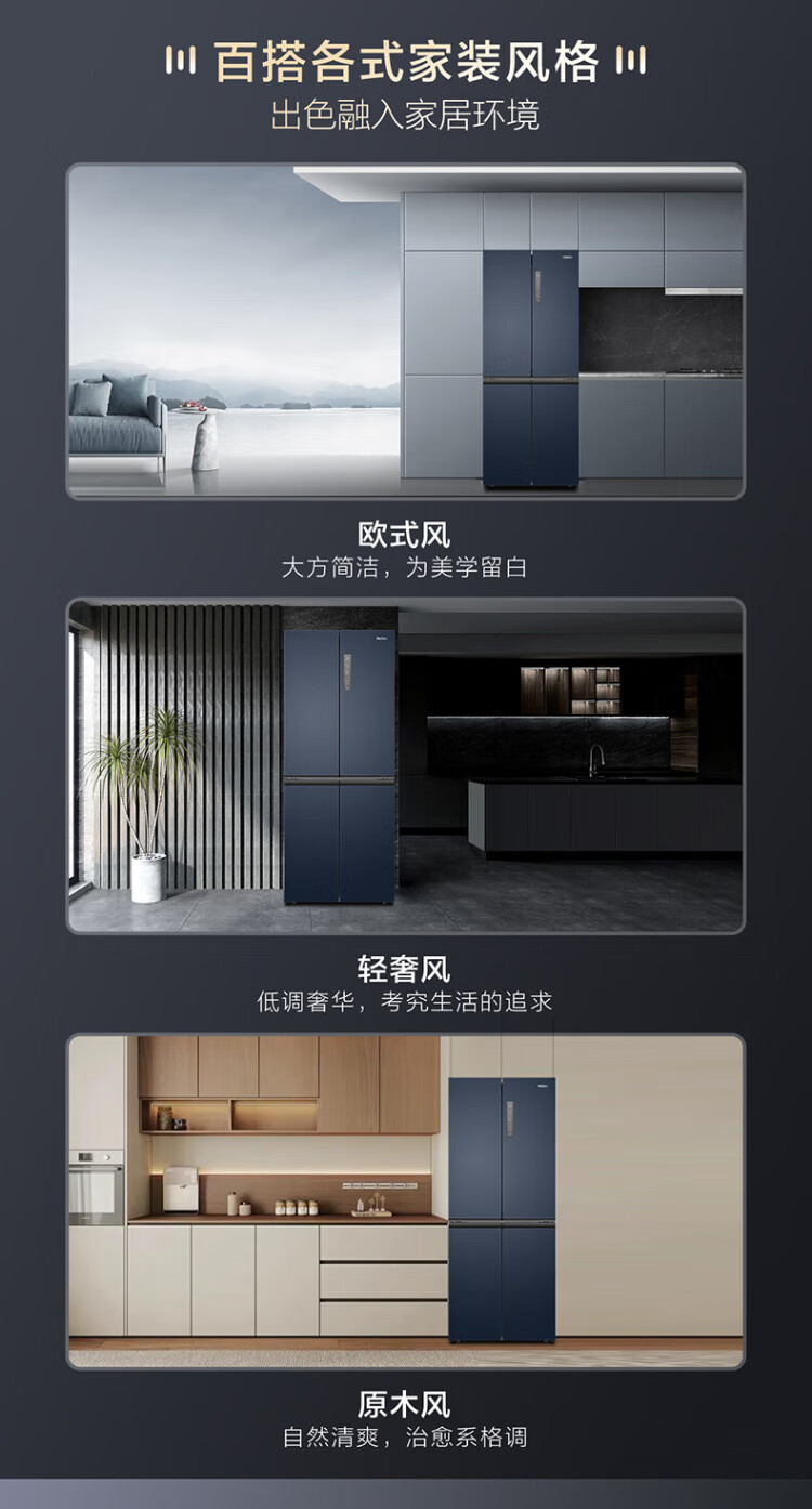 Haier refrigerator 406 liters household four-door cross-door double-door inverter first-level energy efficiency ultra-thin embedded air-cooled frost-free fresh pie series refrigerator state subsidy 15% 406 liters Star Stone Blue + first-level dual inverter + air-cooled frost-free + mother and baby space