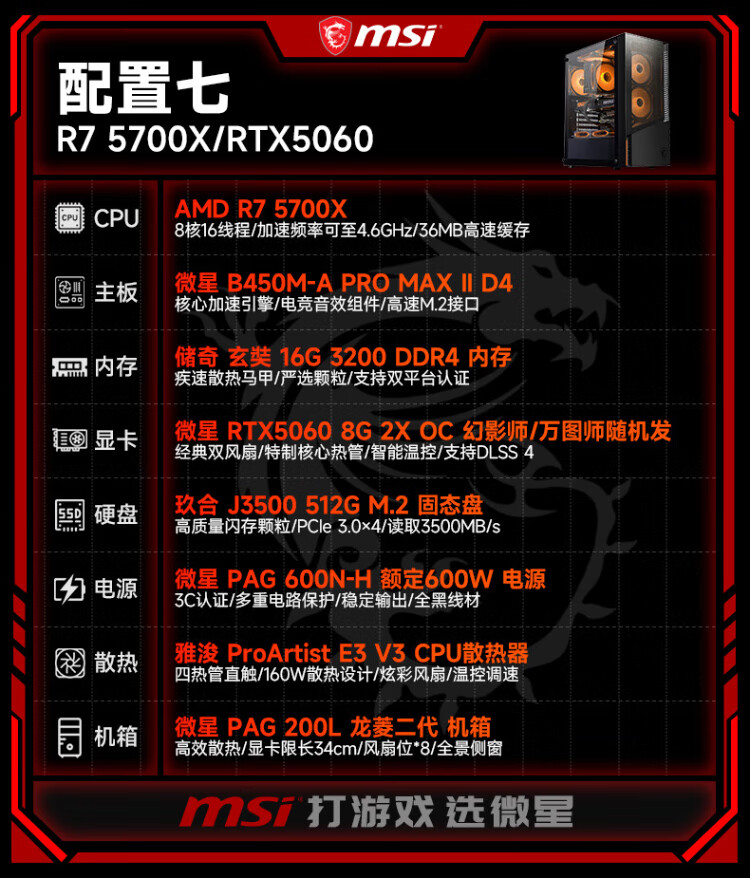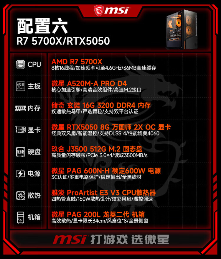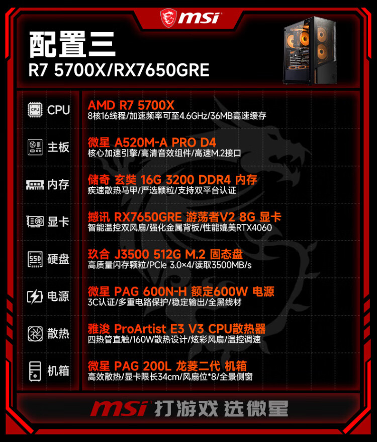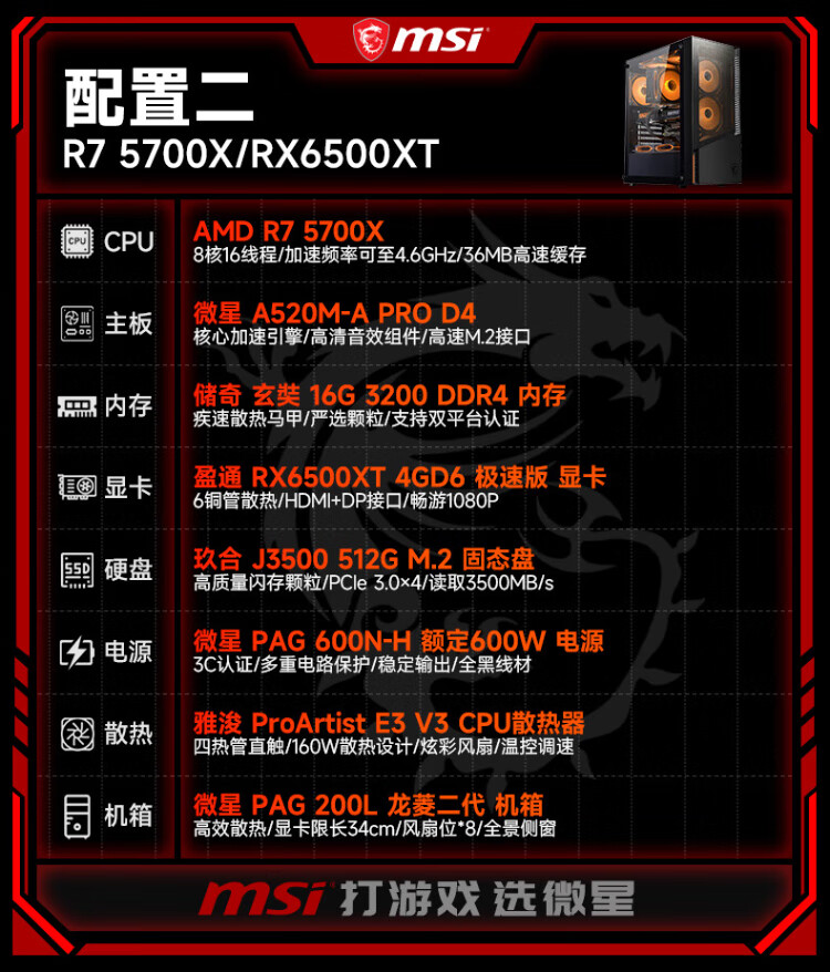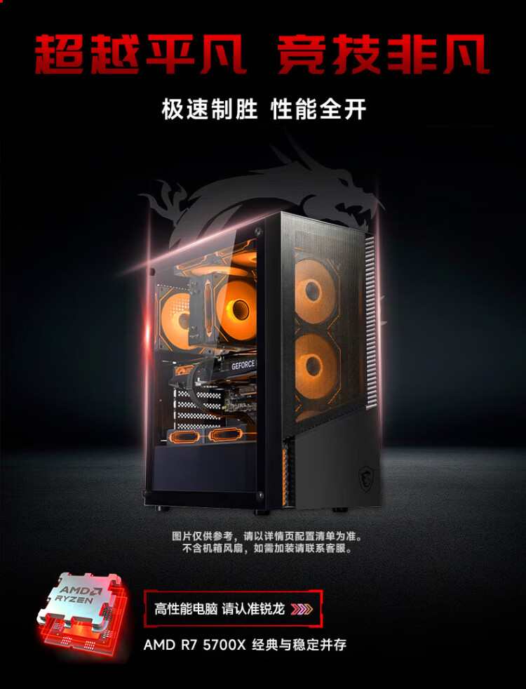 MSI AMD Ryzen 7 5700X/7650GRE/6500XT/6800XT/5050/5060Ti desktop assembly machine game e-sports design office computer host DIY complete machine configuration one R7 5700X without graphics card