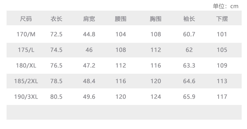 China (cm) 165 / 88-90 170 / 96-98 175 / 108-110 180 / 118-122 185 / 126-130