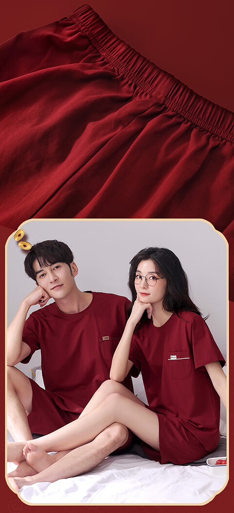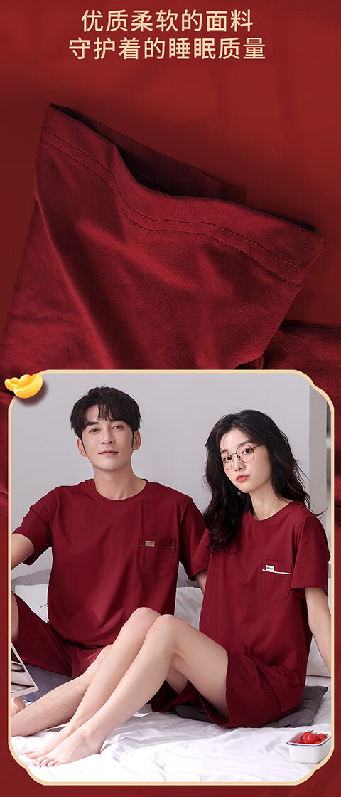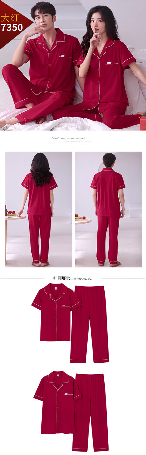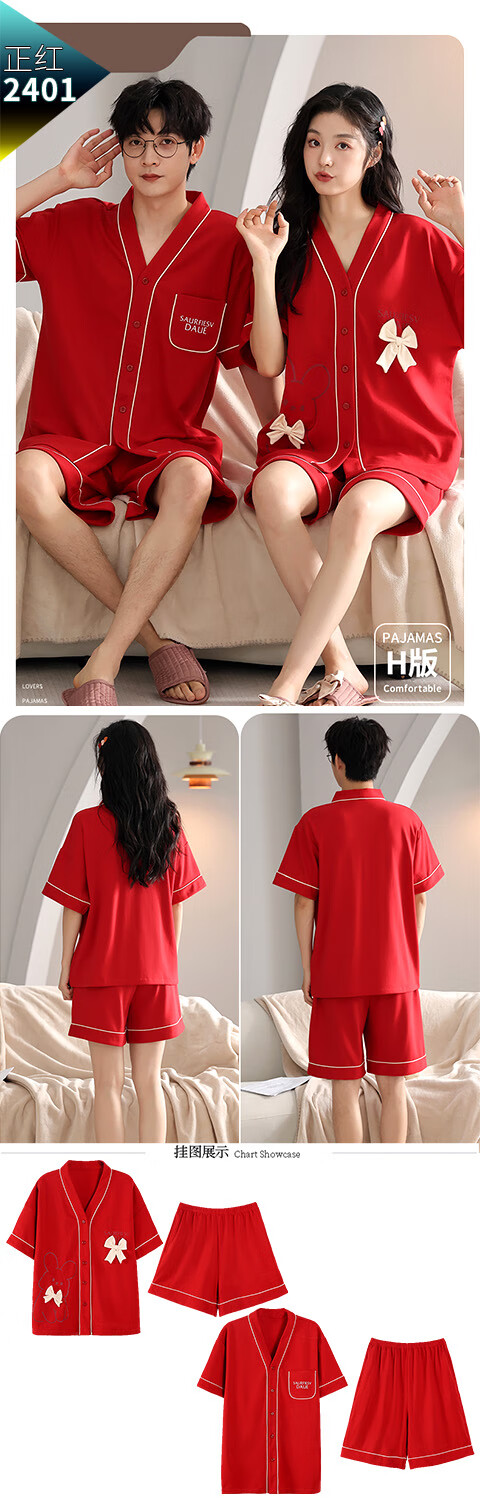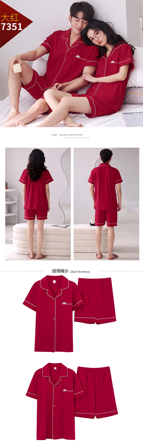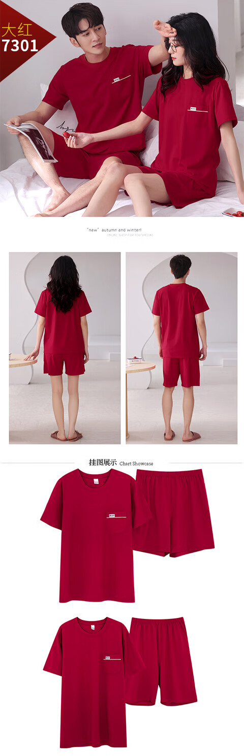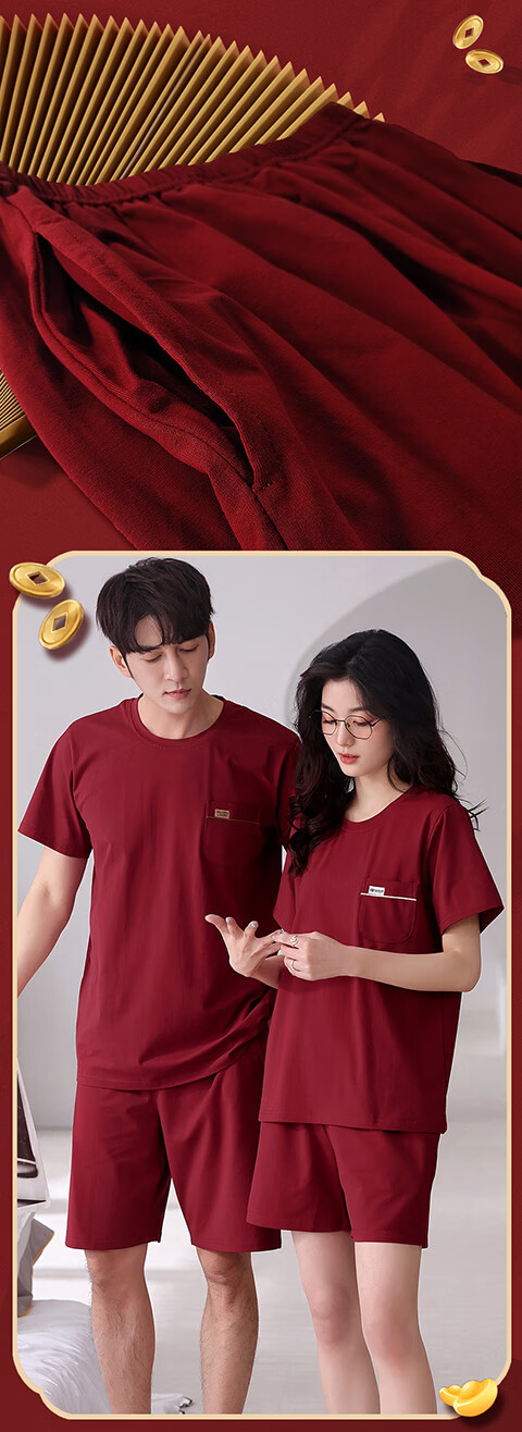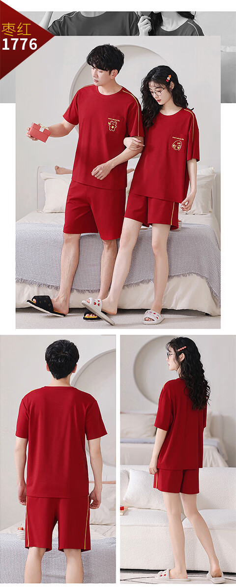 Green Couple Pajamas Women's Summer Thin Short-Sleeved 100% Cotton Zodiac Year Men's Newly Married Big Red Home Clothes mrcQ7301 Big Red Single Set Price Remarks or Customer Service Message Size