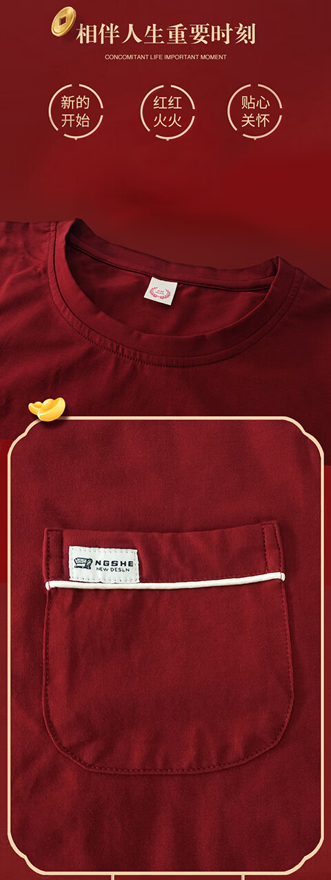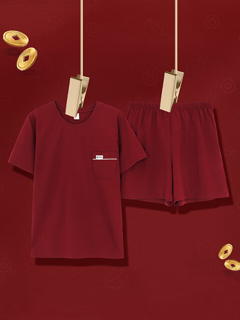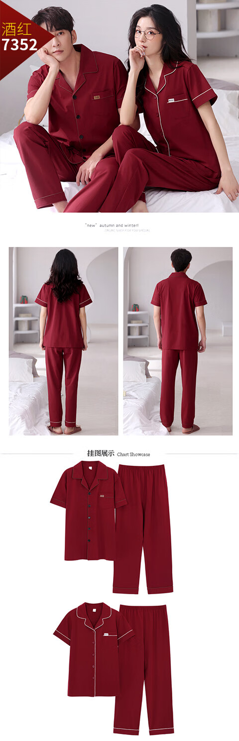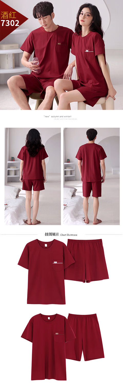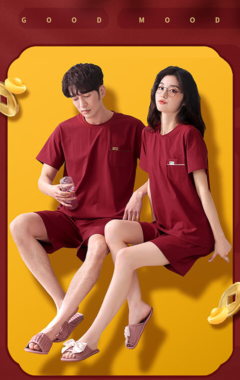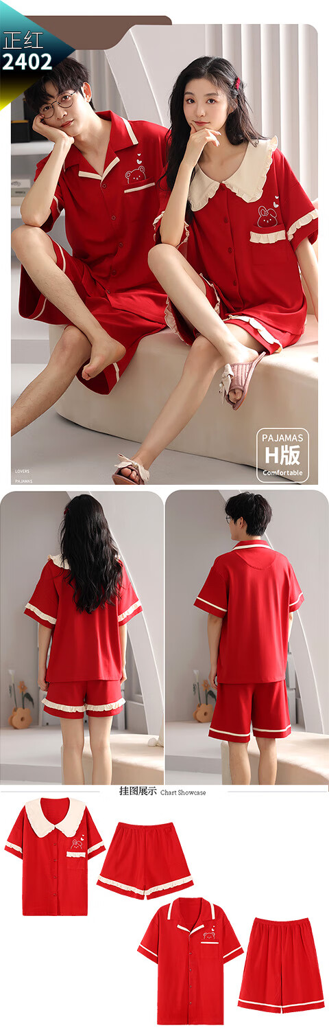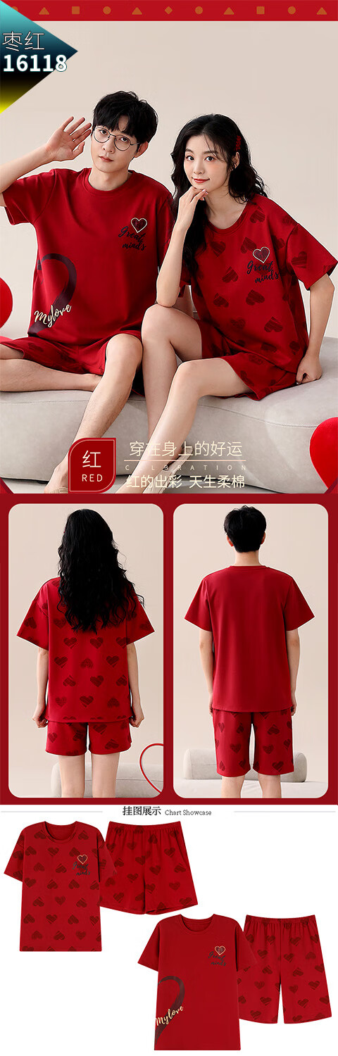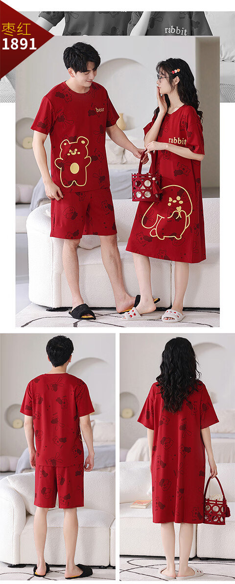 Green Couple Pajamas Women's Summer Thin Short-Sleeved 100% Cotton Zodiac Year Men's Newly Married Big Red Home Clothes mrcQ7301 Big Red Single Set Price Remarks or Customer Service Message Size