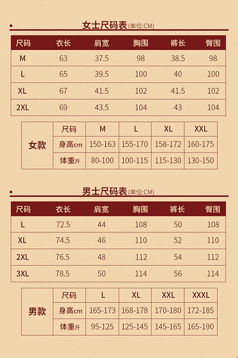 China (cm) 160-165/84-86 165-170 / 88-90 167-172 / 92-96 168-173 / 98-102 170-176 / 106-110