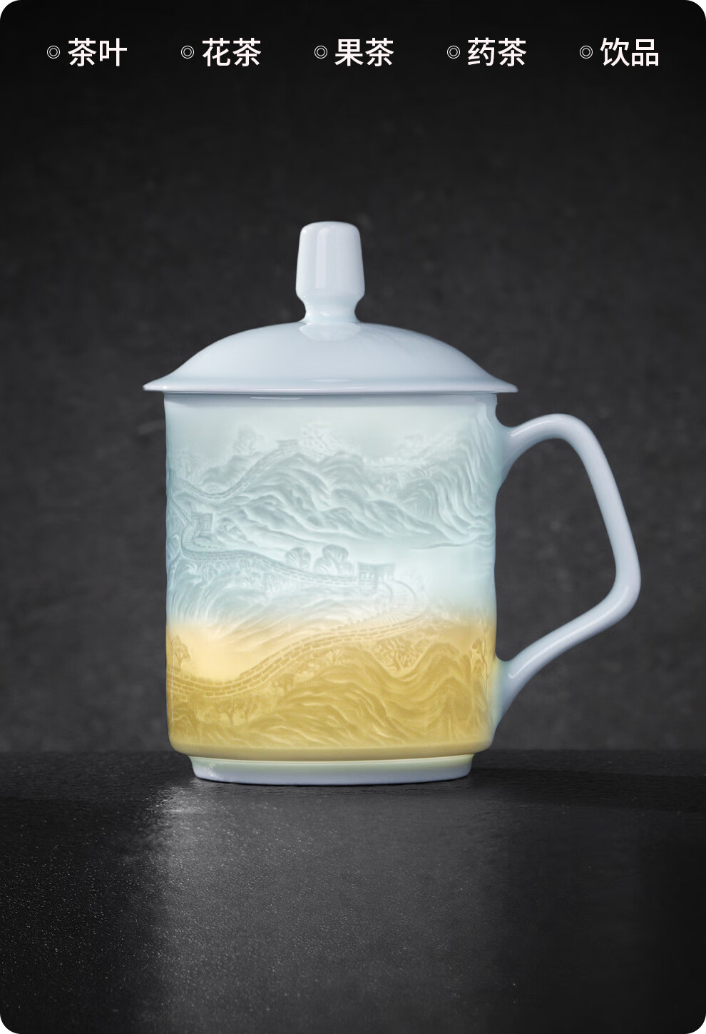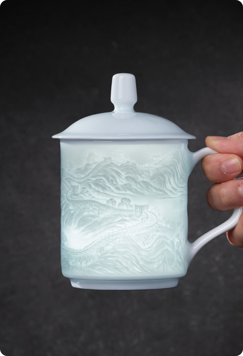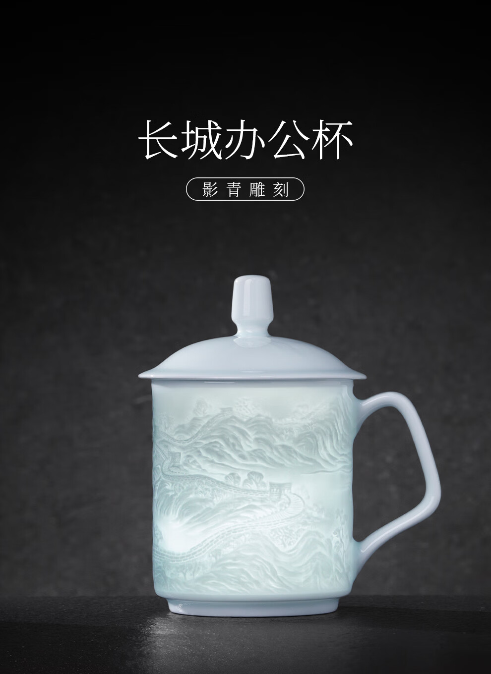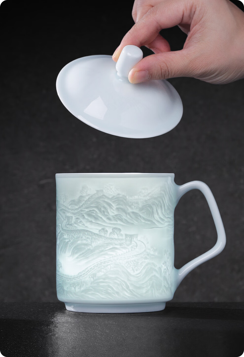 Jingdezhen (jdz) ceramic household Chinese-style handmade Great Wall tea cup tea set with lid office tea cup tea cup gift for elders shadow green relief Great Wall tea cup