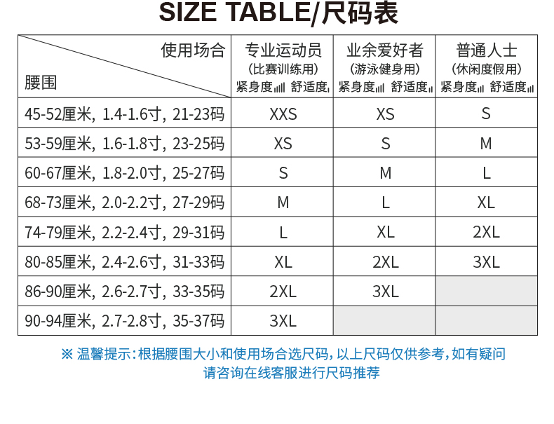 USA(inch) 28-30 30-32 32-34 34-38 38-42