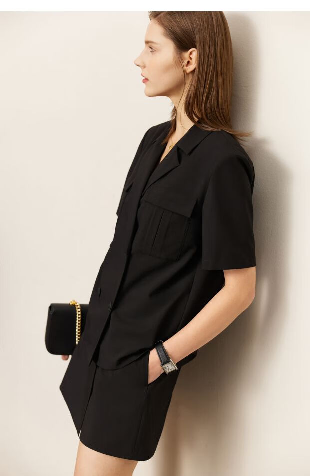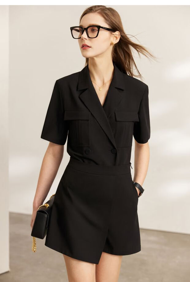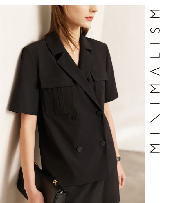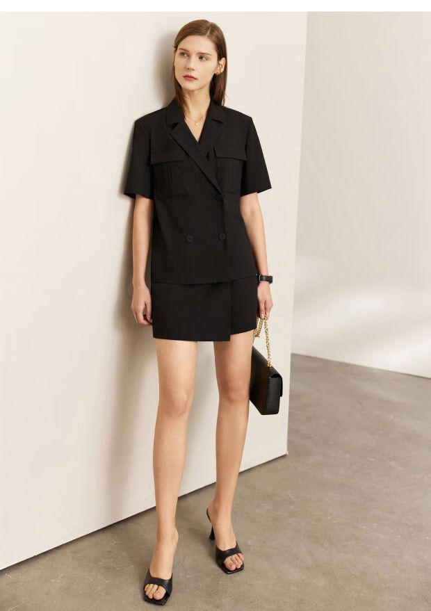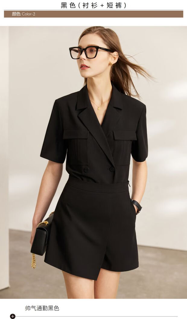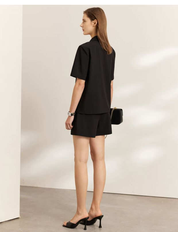 AMII Women's 2025 Summer New Complete Matching Suit Women's Fashion Double-breasted Casual Small Two Black (Shirt) S 155/80A