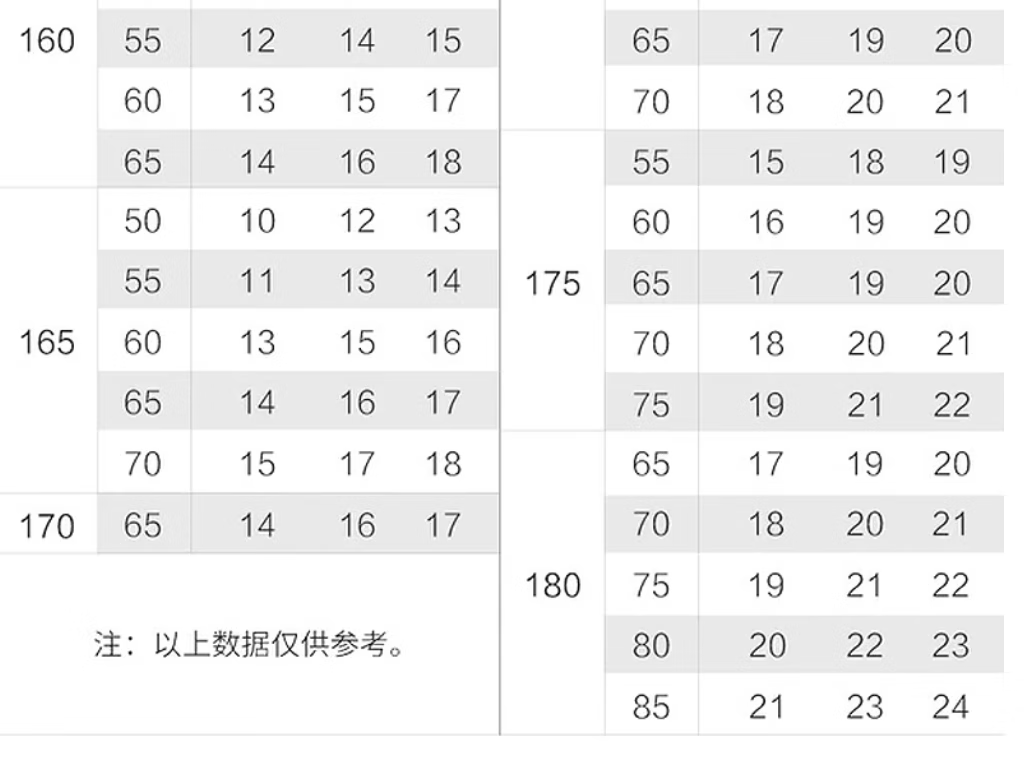 China (cm) 165 / 88-90 170 / 96-98 175 / 108-110 180 / 118-122 185 / 126-130