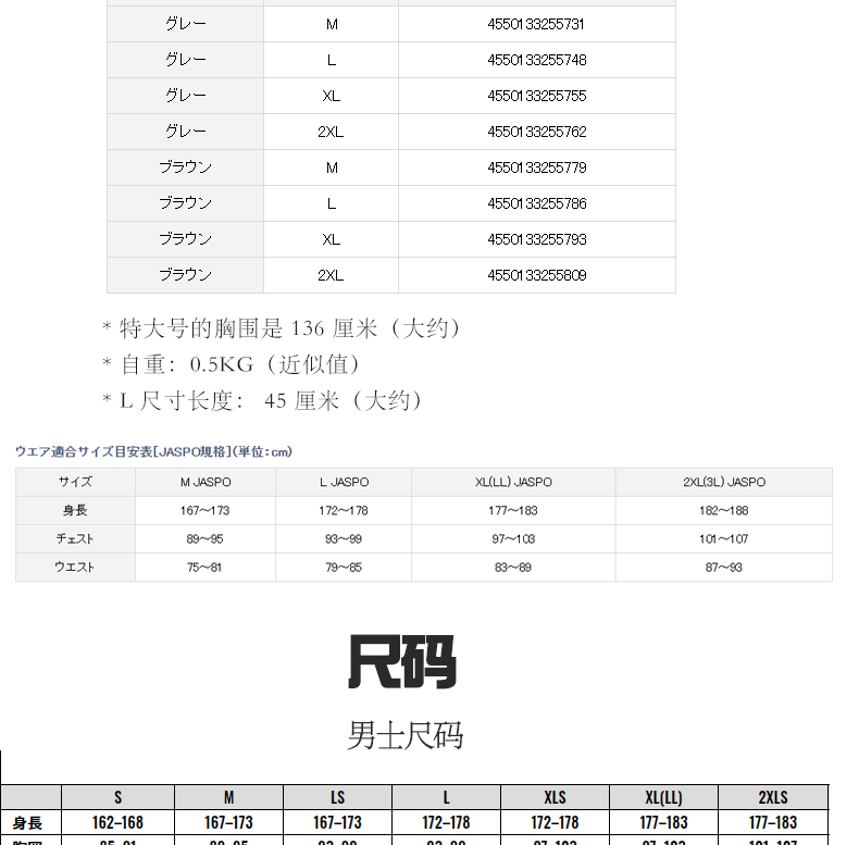 China (cm) 165 / 88-90 170 / 96-98 175 / 108-110 180 / 118-122 185 / 126-130