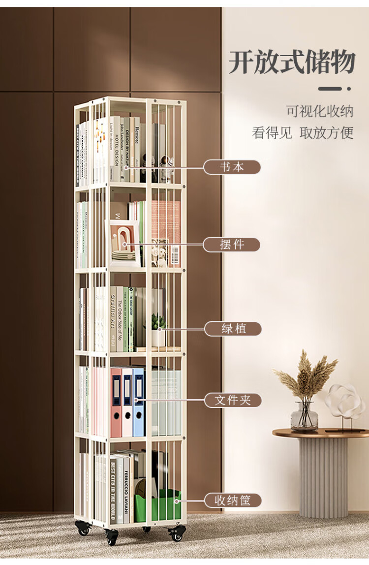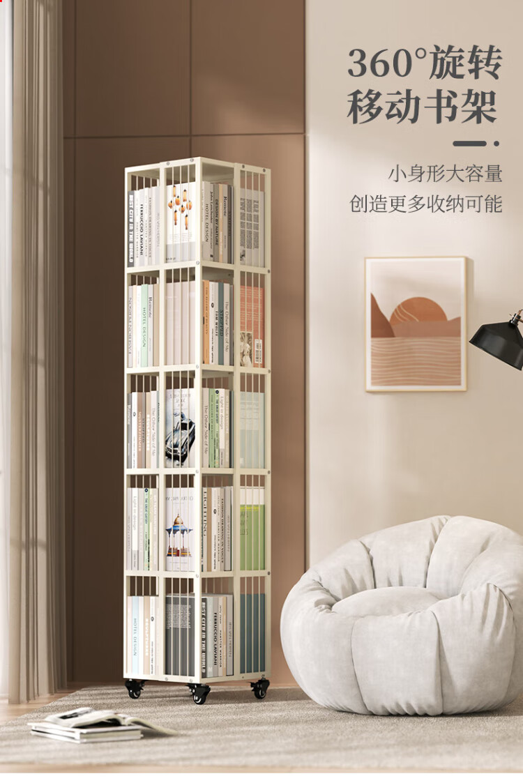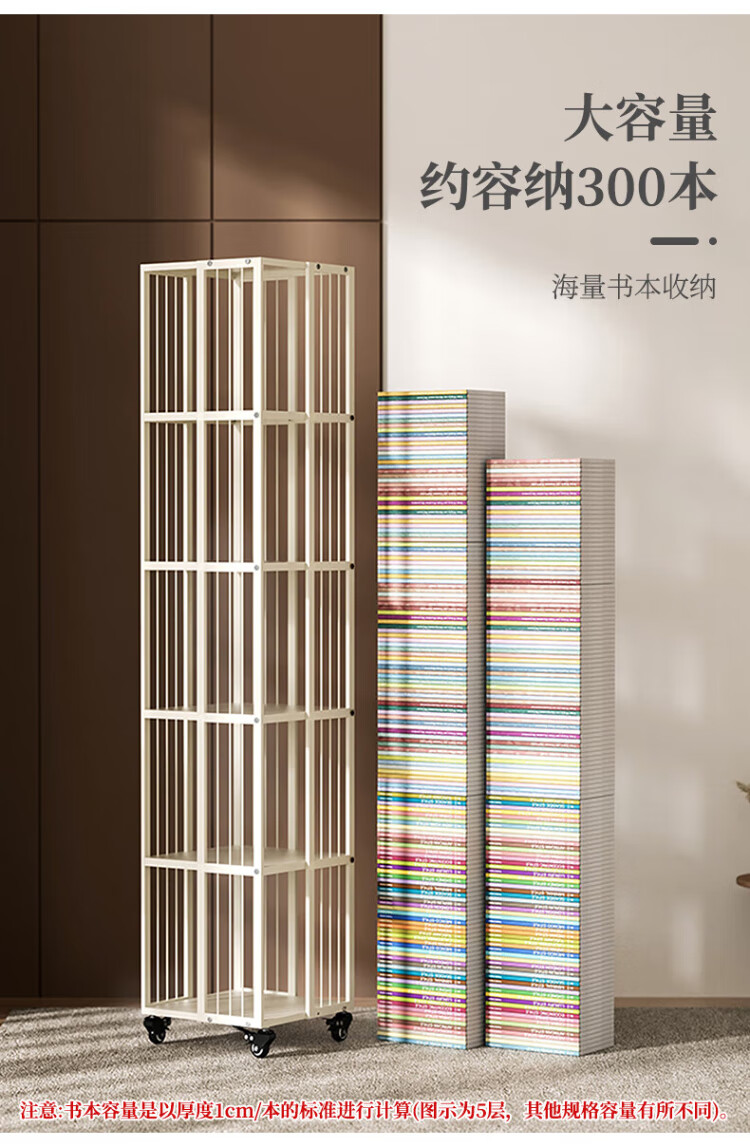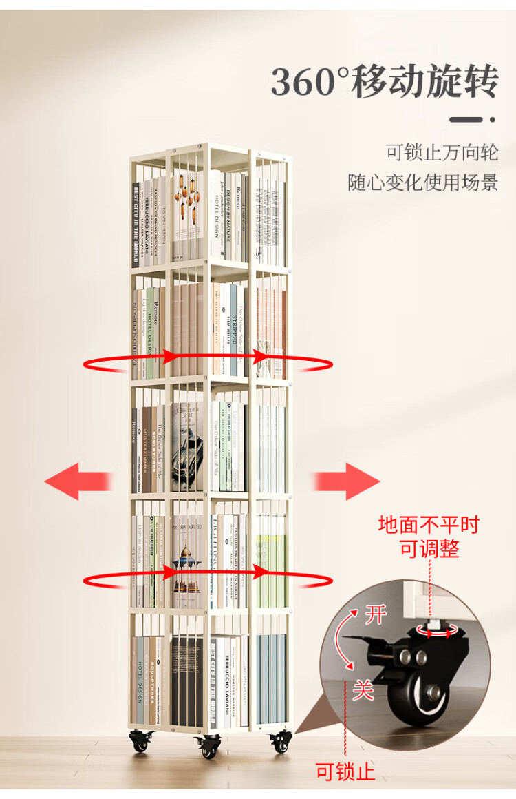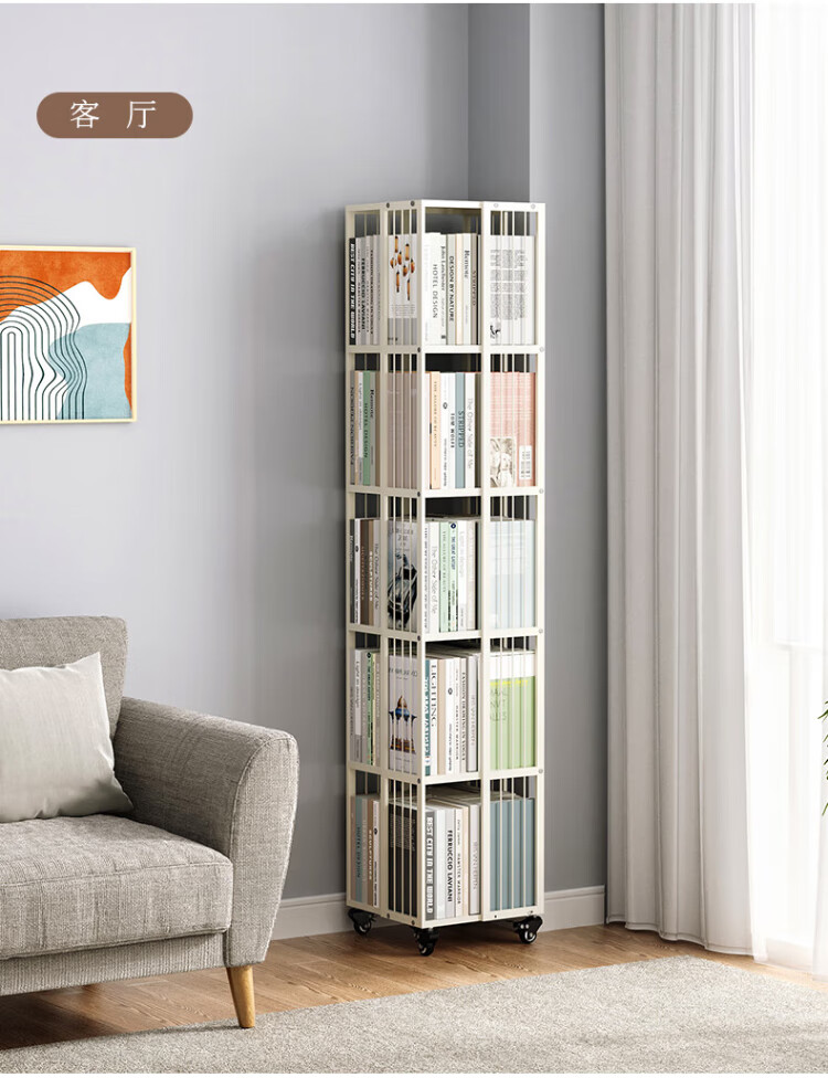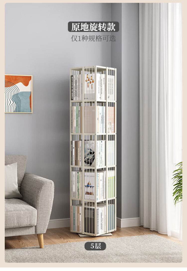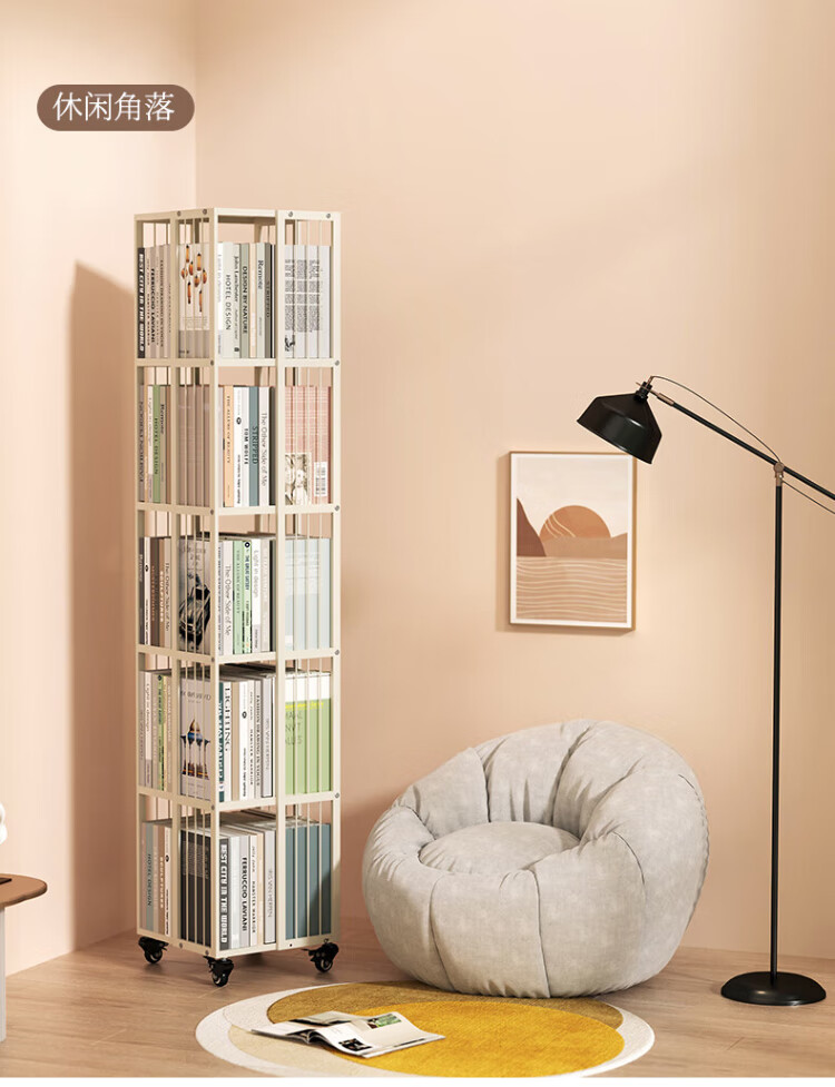 SOFS 360 degree rotating bookshelf floor-standing simple student storage rack bedroom bedside movable steel wrought iron small bookcase mobile rotating model metal bookshelf 5 layers white