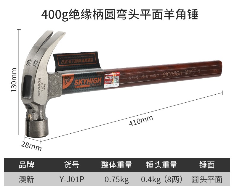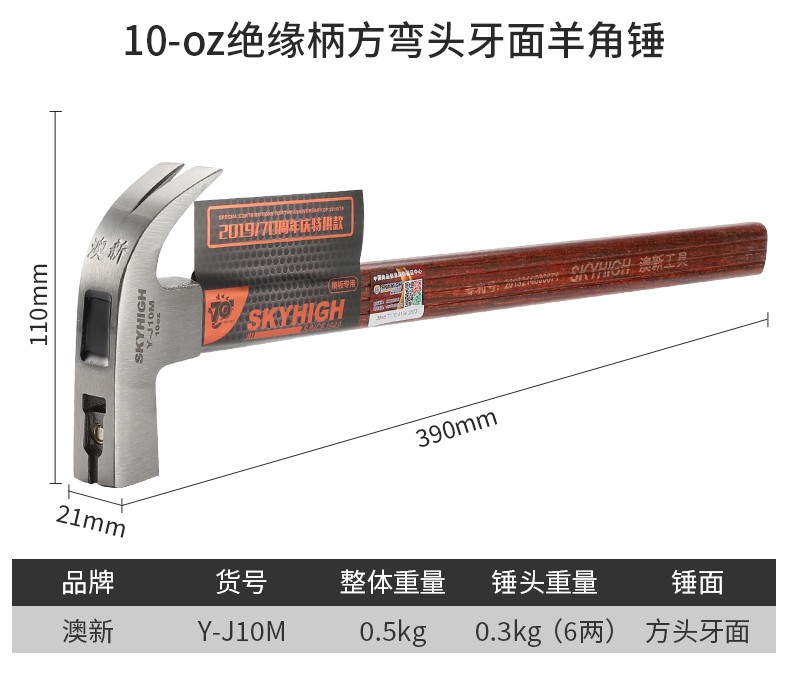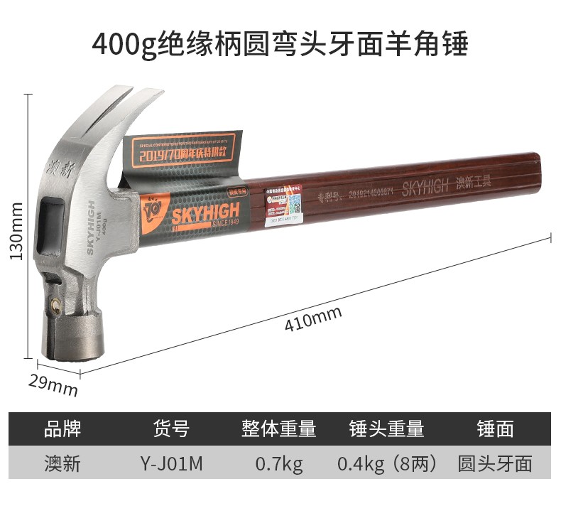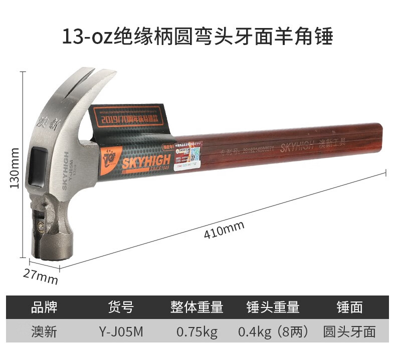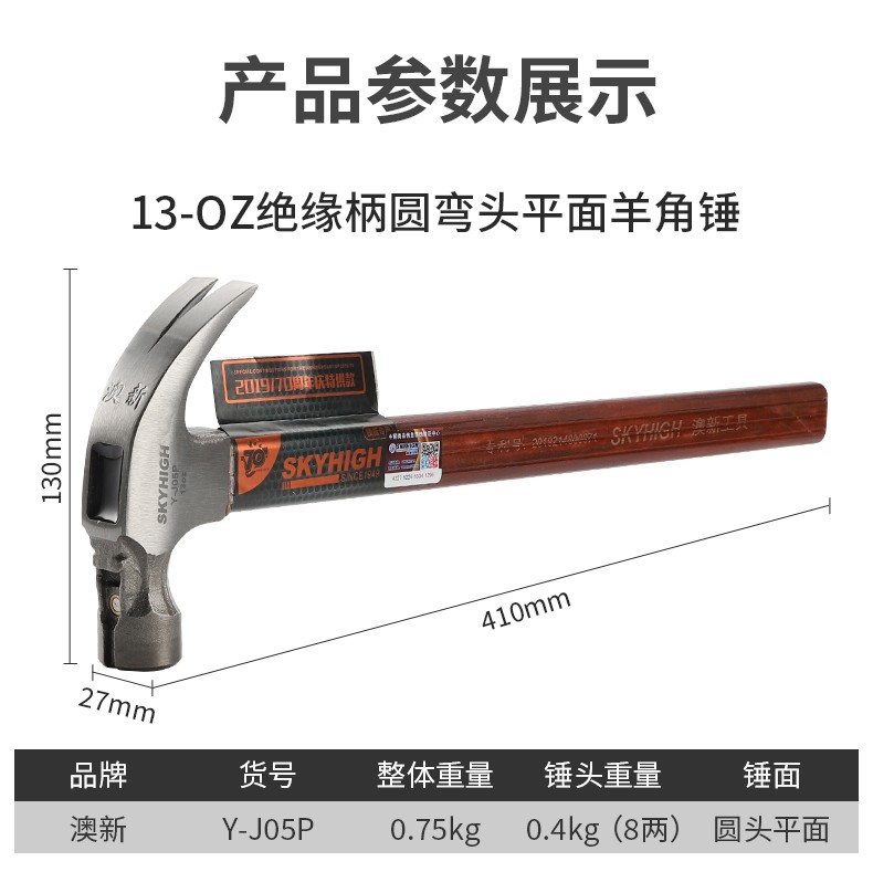 New Australian and New Zealand claw hammer for woodworking, multifunctional insulated handle, high carbon steel, round head, tooth surface, 10 taels, magnetic bent tail, Y-J06M