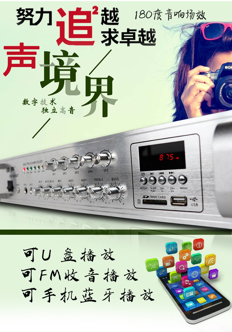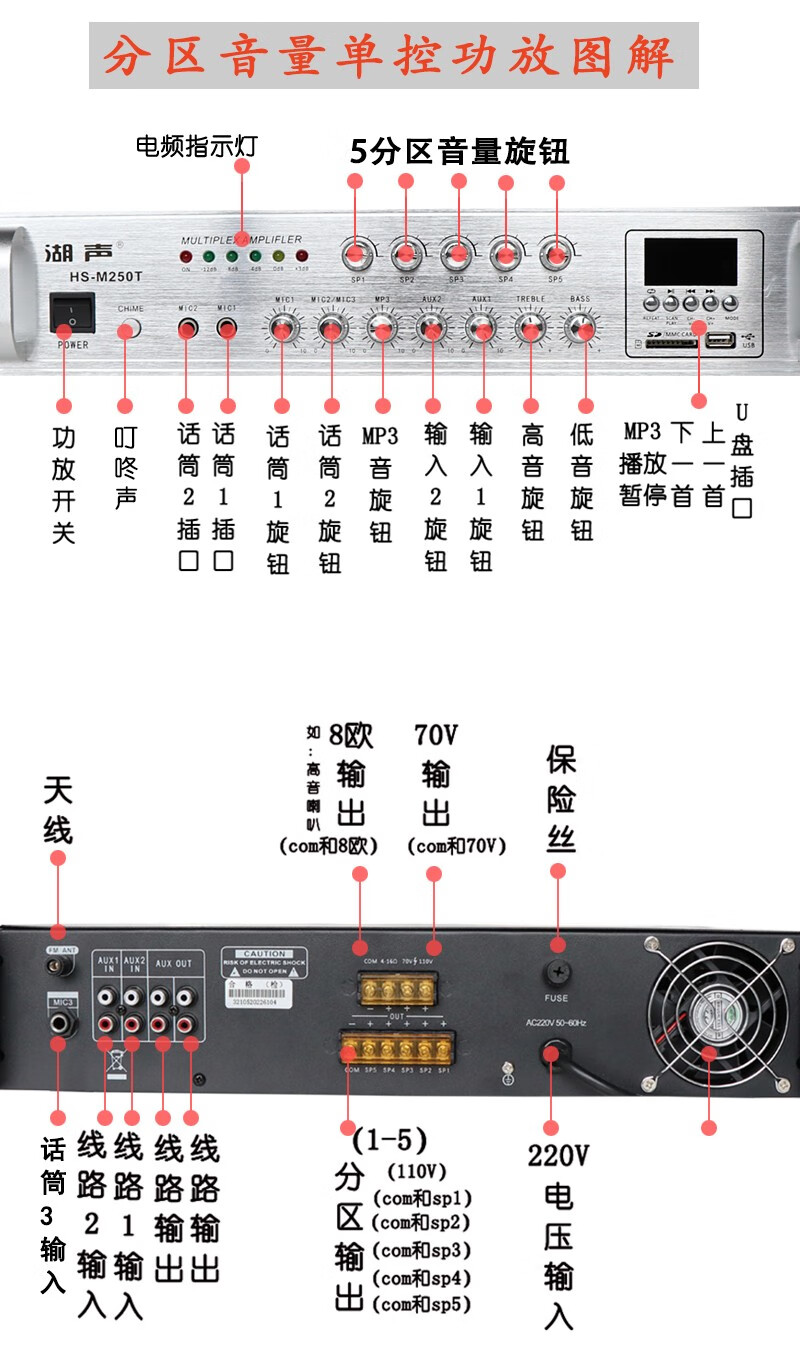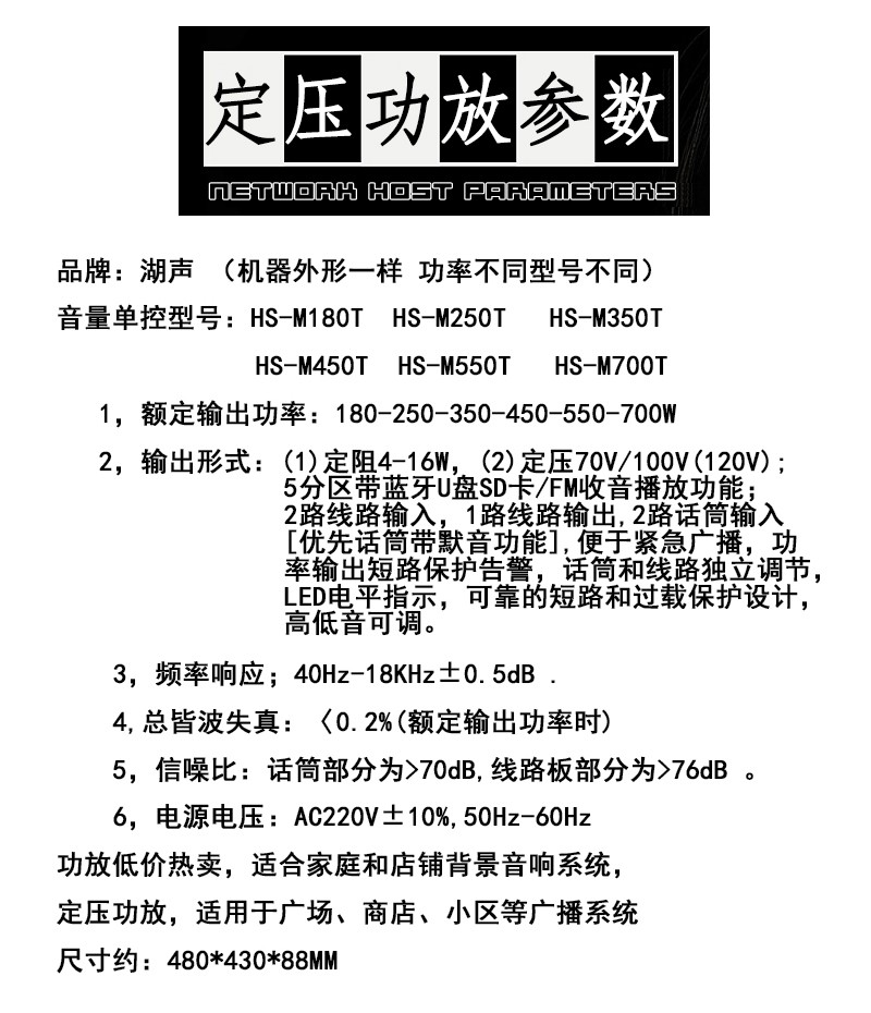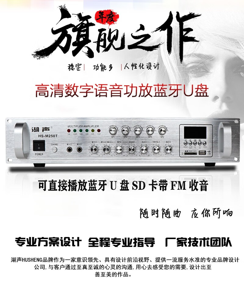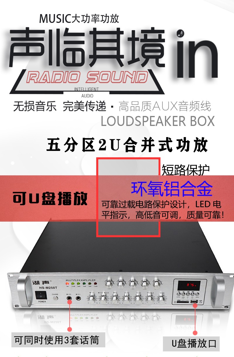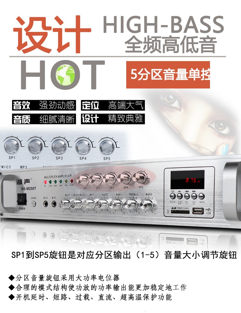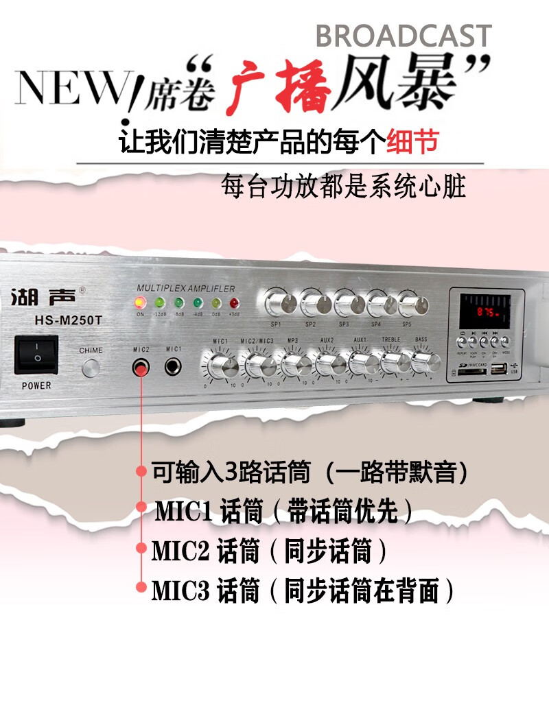 Husheng power amplifier, fixed voltage and fixed resistance dual-purpose power amplifier, integrated 5-zone volume single control power amplifier, campus radio amplifier, free 10 ceiling or wall-mounted speakers, HS-M350T five-zone single volume control