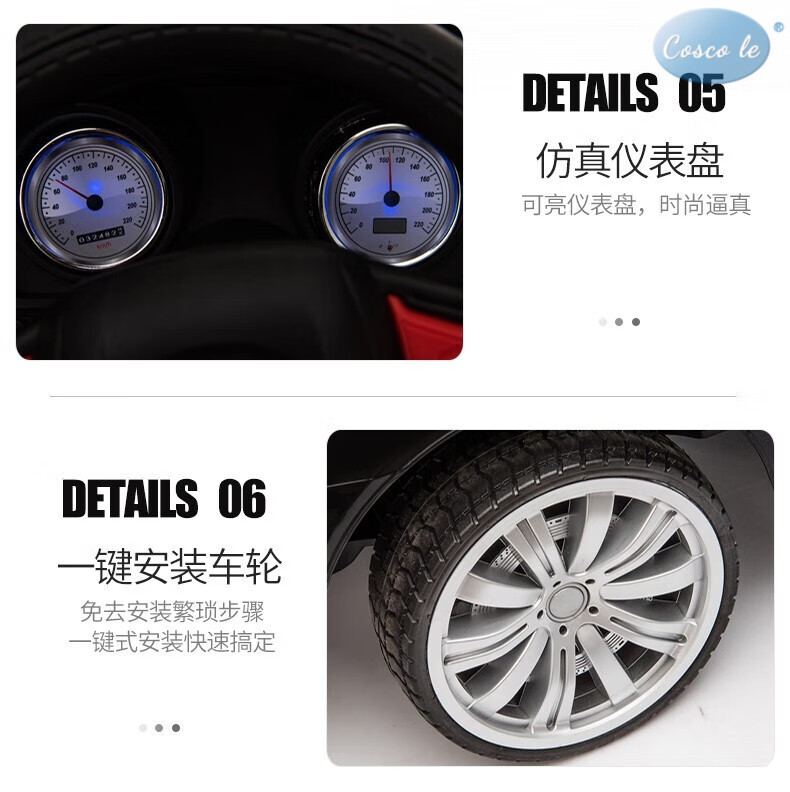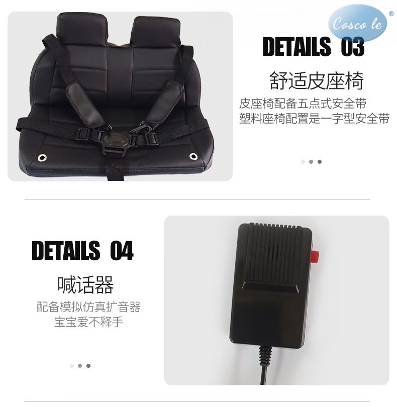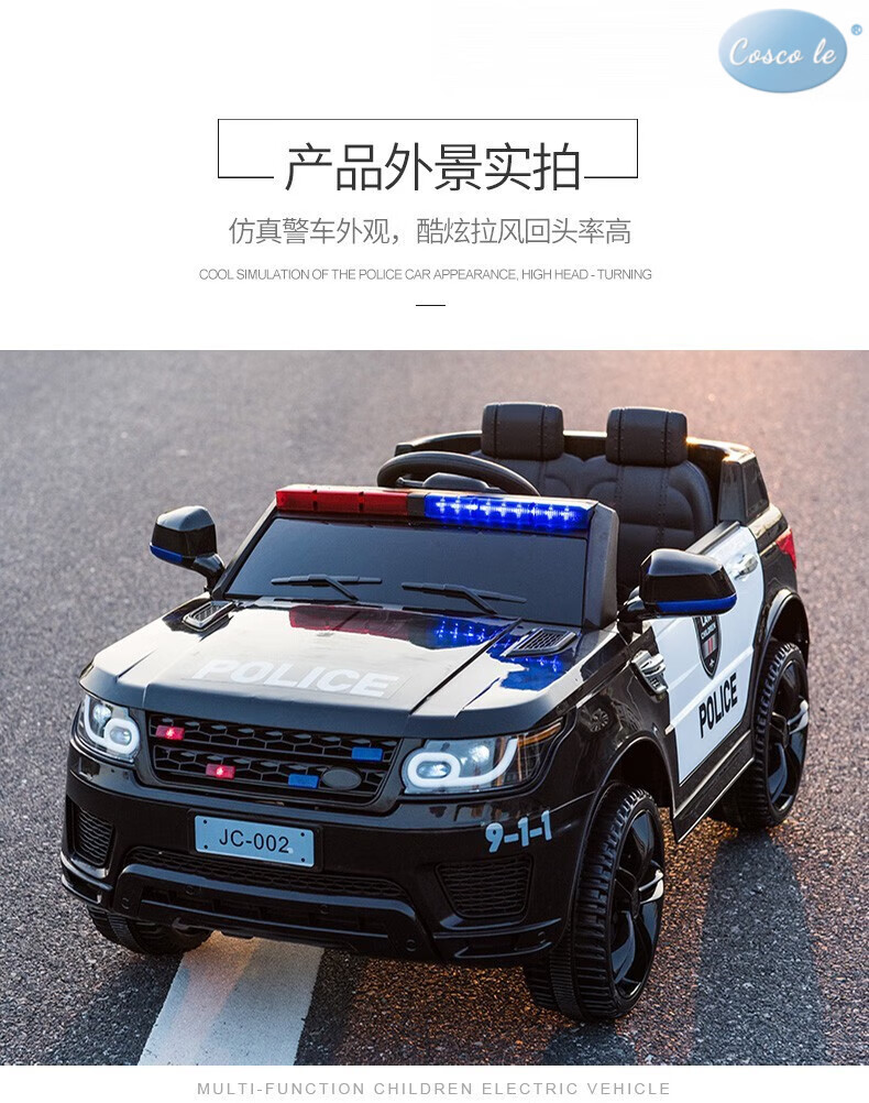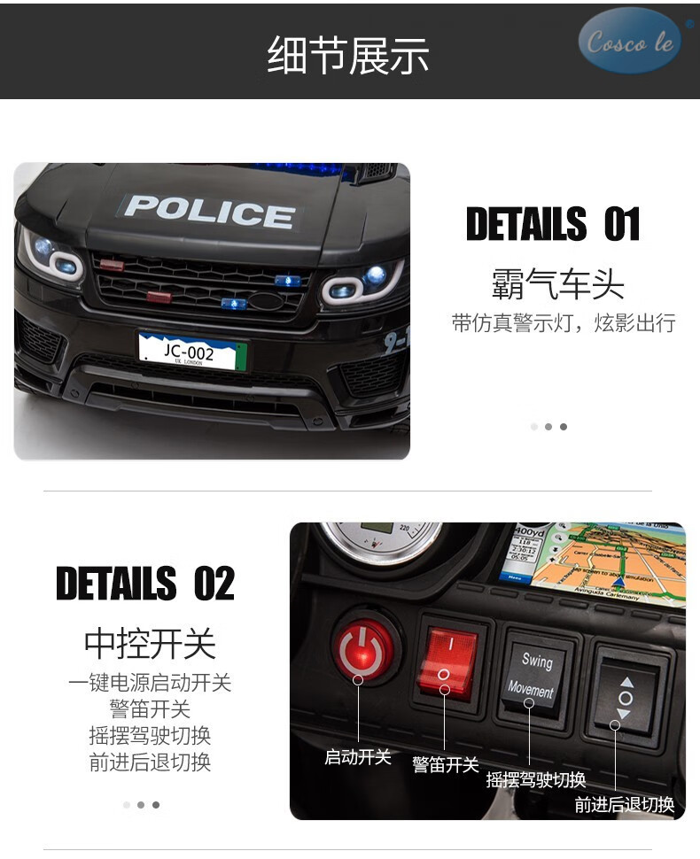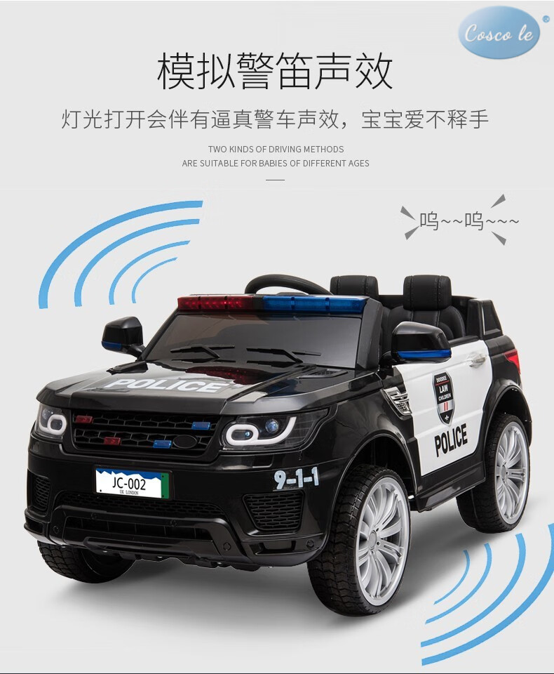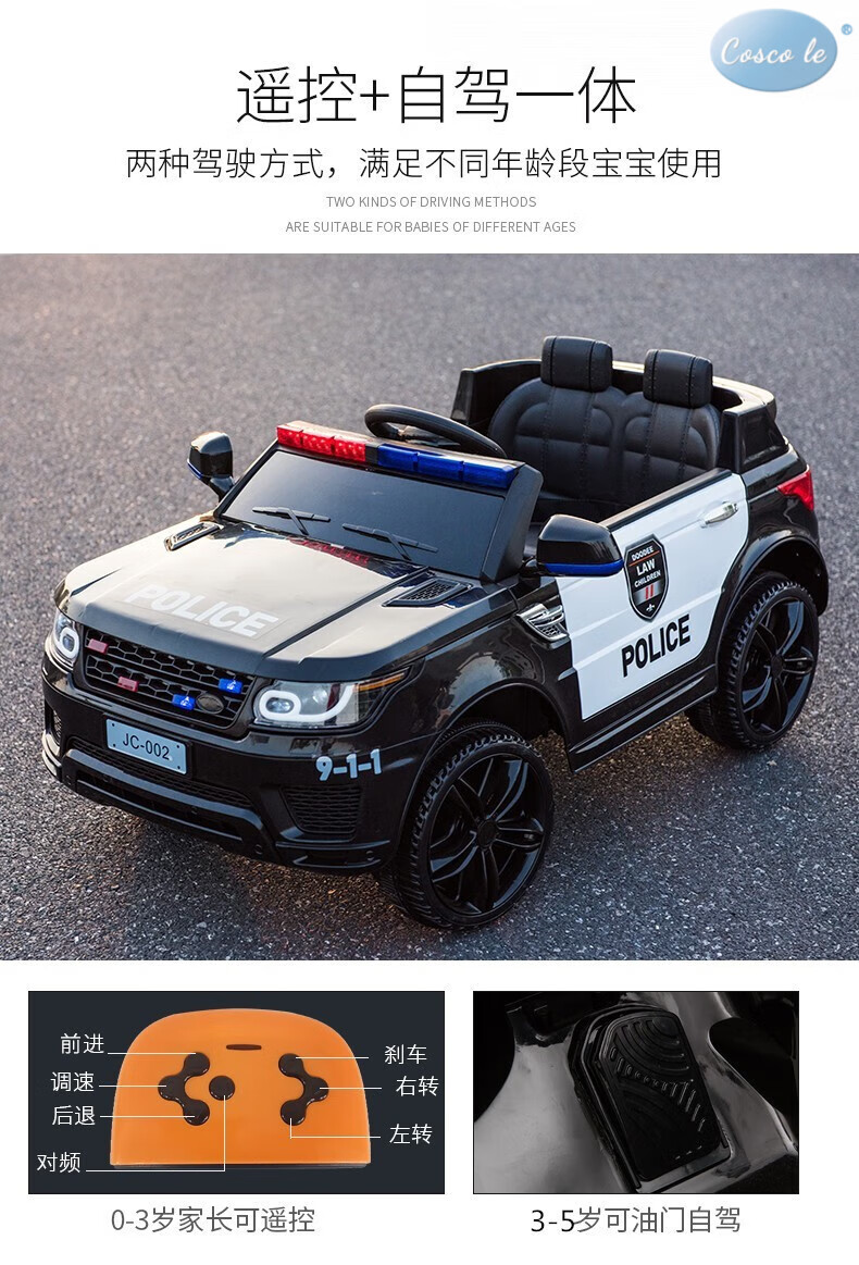 COSCO JUVENI LE children's electric car with Bluetooth remote control, swing and seat, children's police car, child's birthday gift, black, Bluetooth remote control + early education + long-lasting battery life