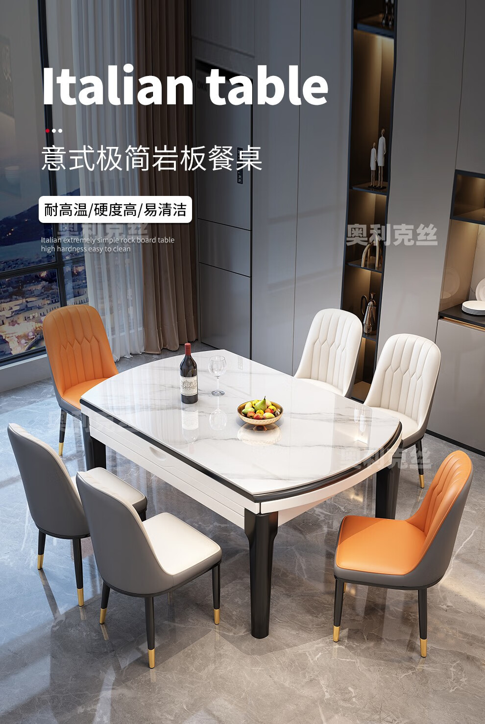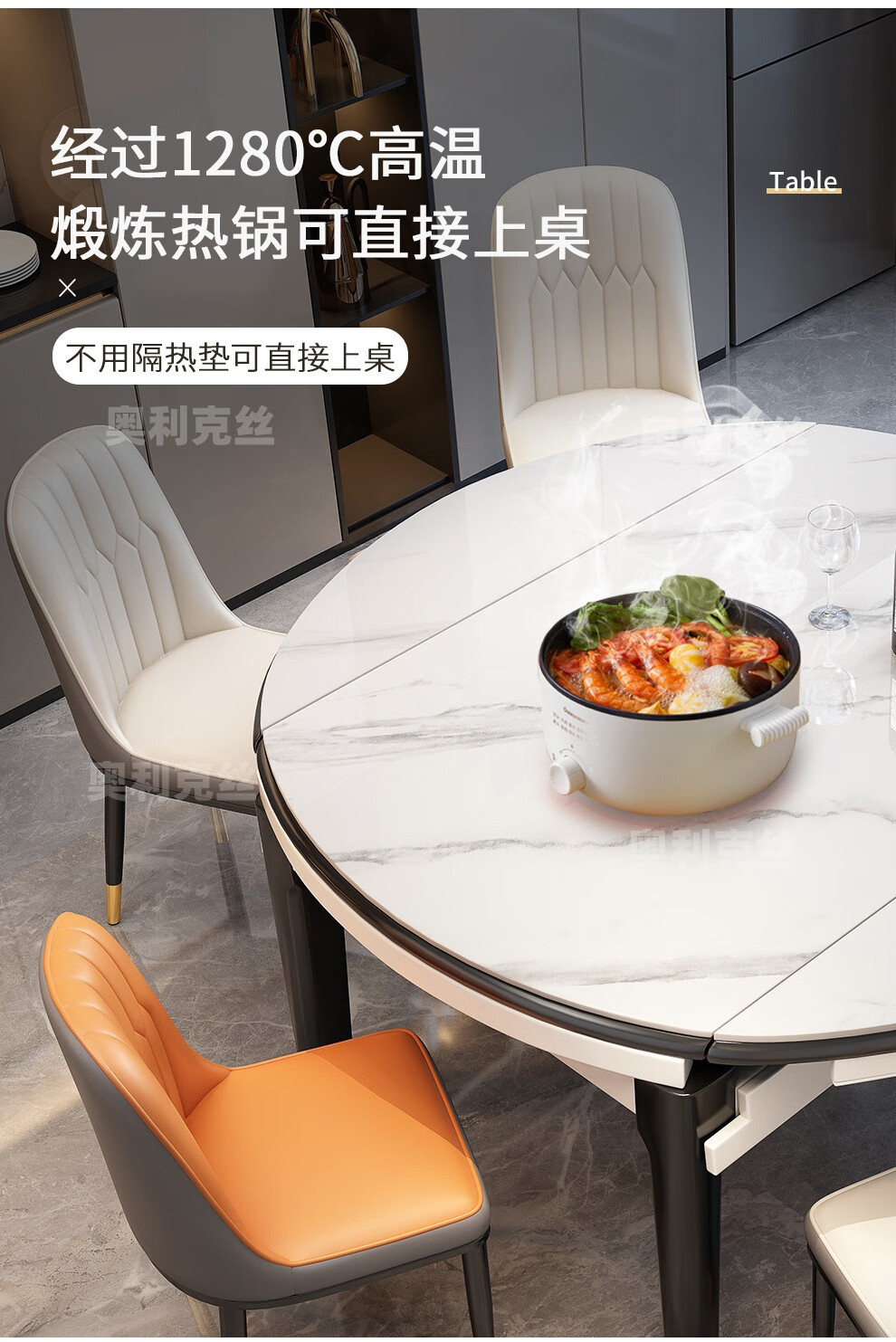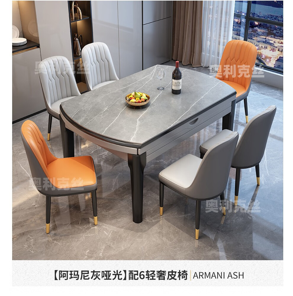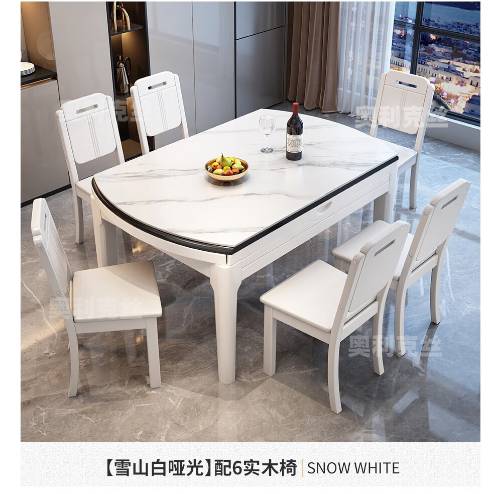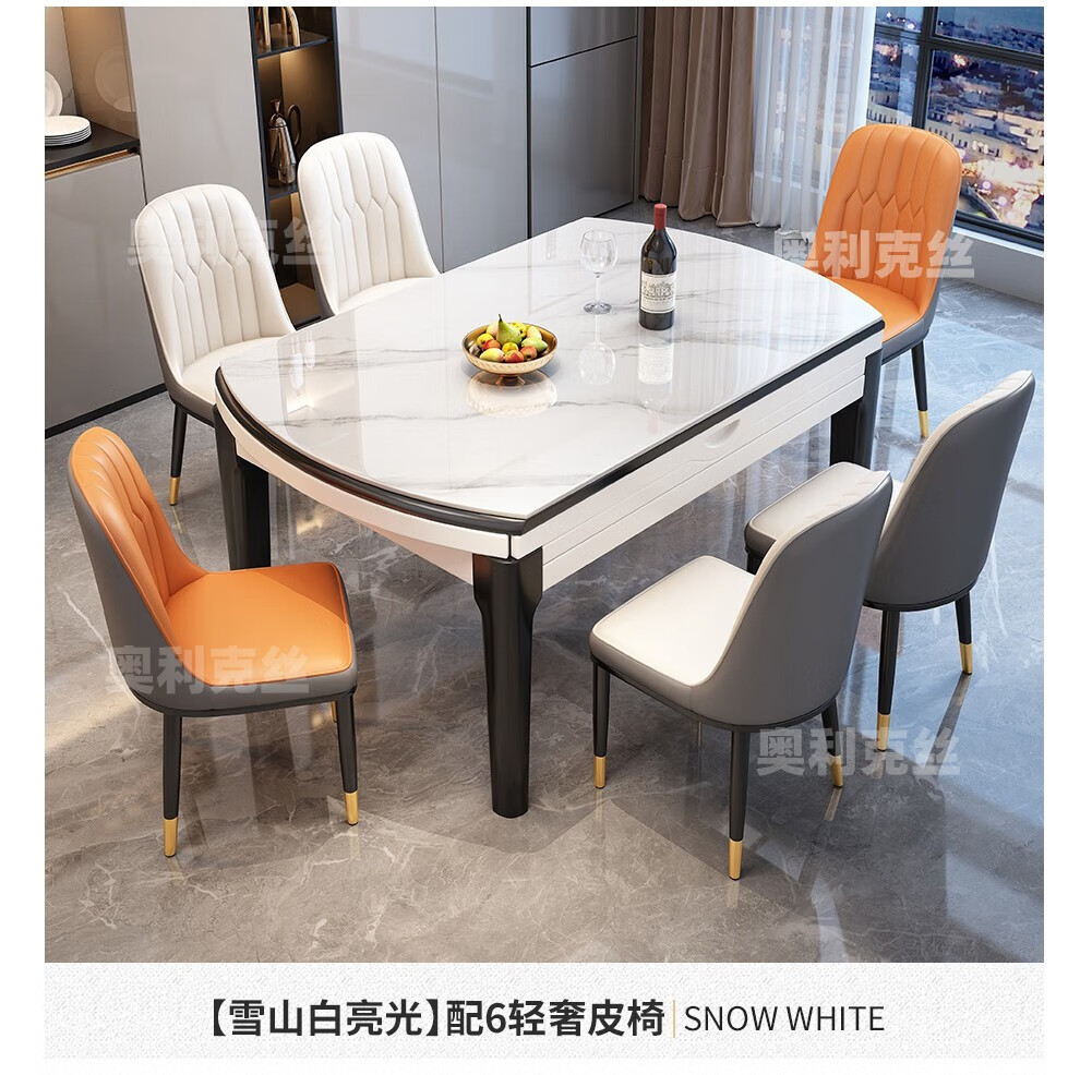 Orix glossy slate dining table and chair combination, modern and simple solid wood dining table, retractable and folding round table, dining table, glossy snow mountain white - black and white frame, light luxury leather chair style, 1.35 meters, one table and six chairs, 12MM thickened slate