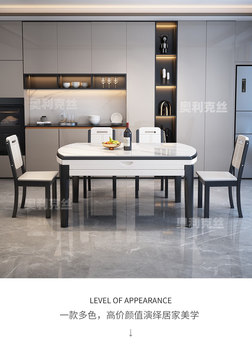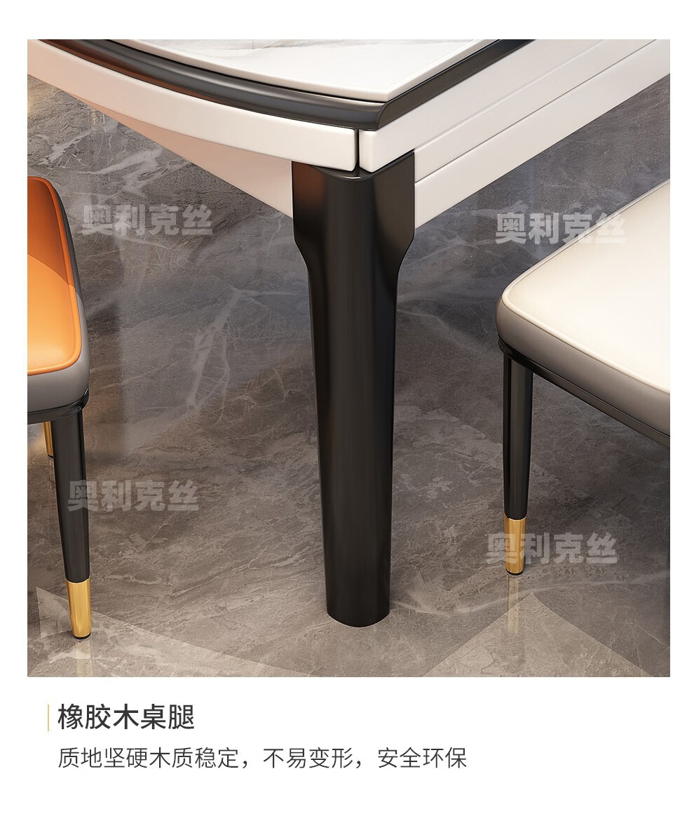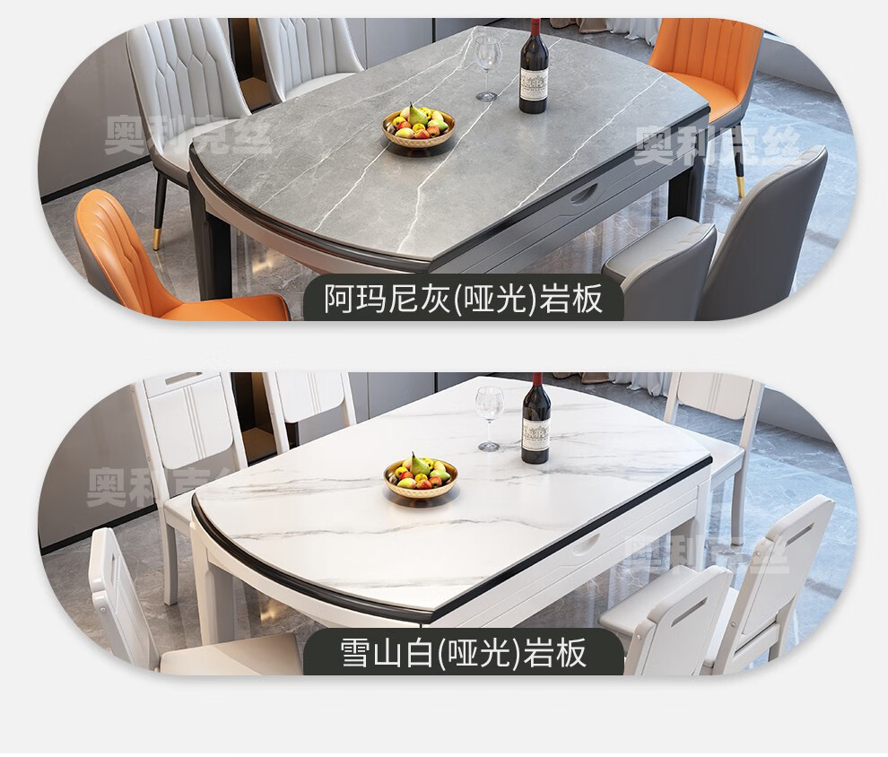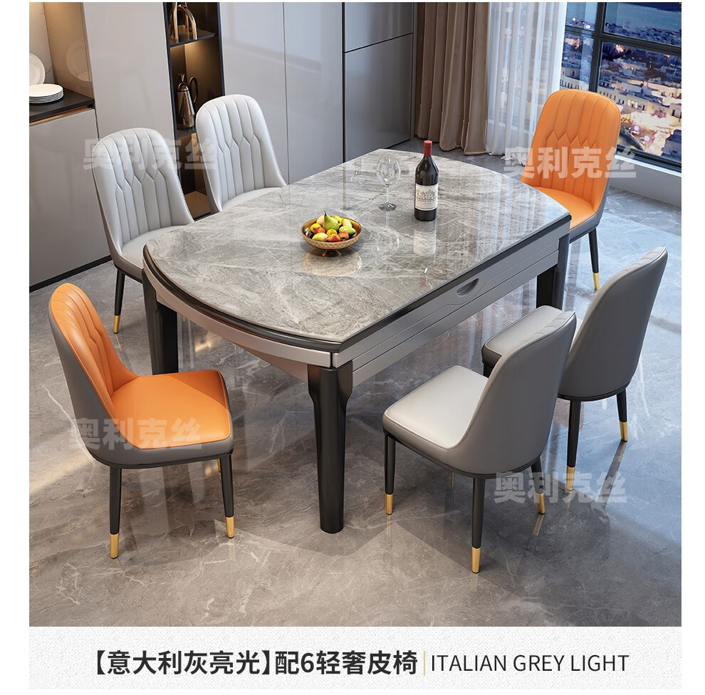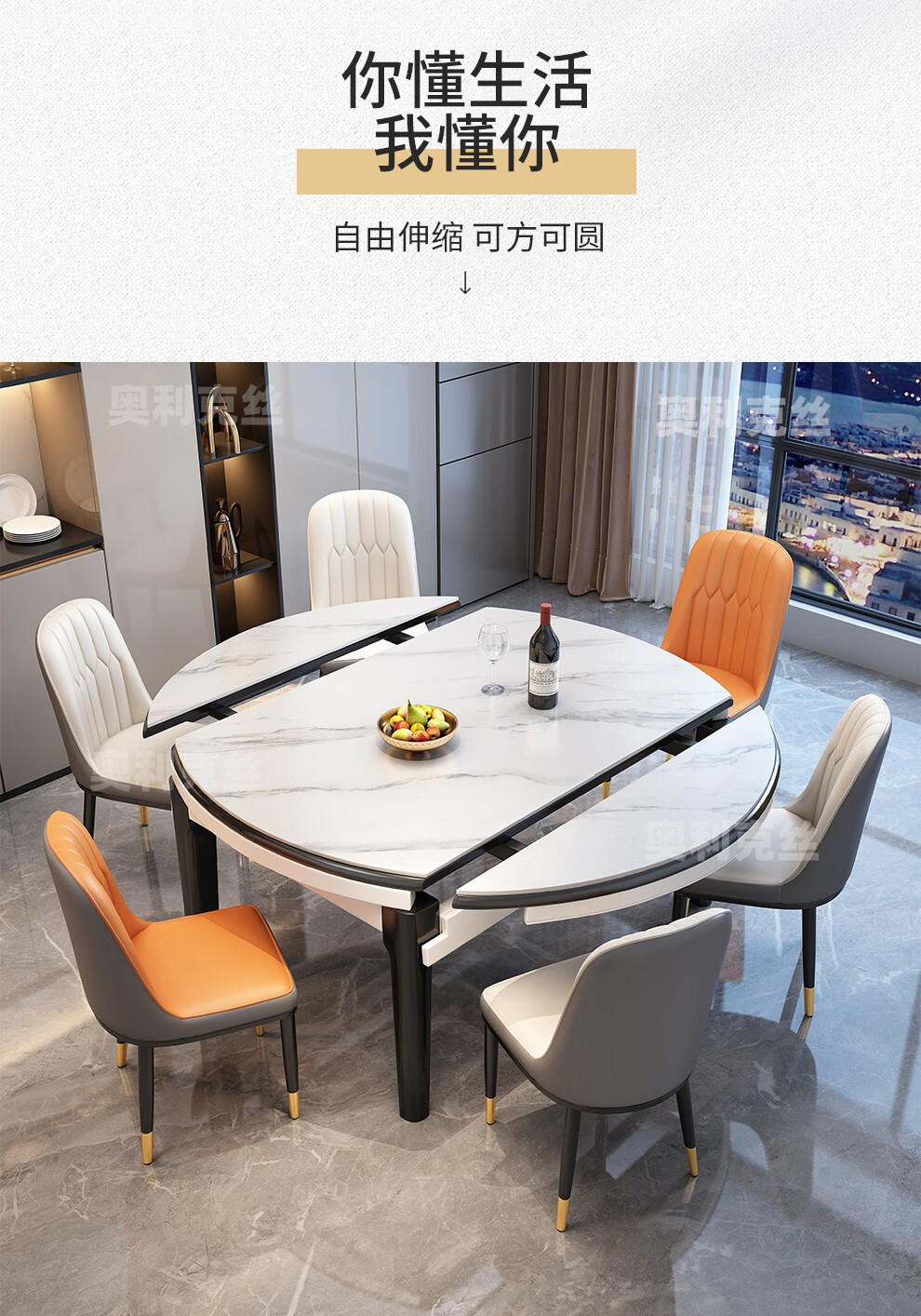 Orix glossy slate dining table and chair combination, modern and simple solid wood dining table, retractable and folding round table, dining table, glossy snow mountain white - black and white frame, light luxury leather chair style, 1.35 meters, one table and six chairs, 12MM thickened slate