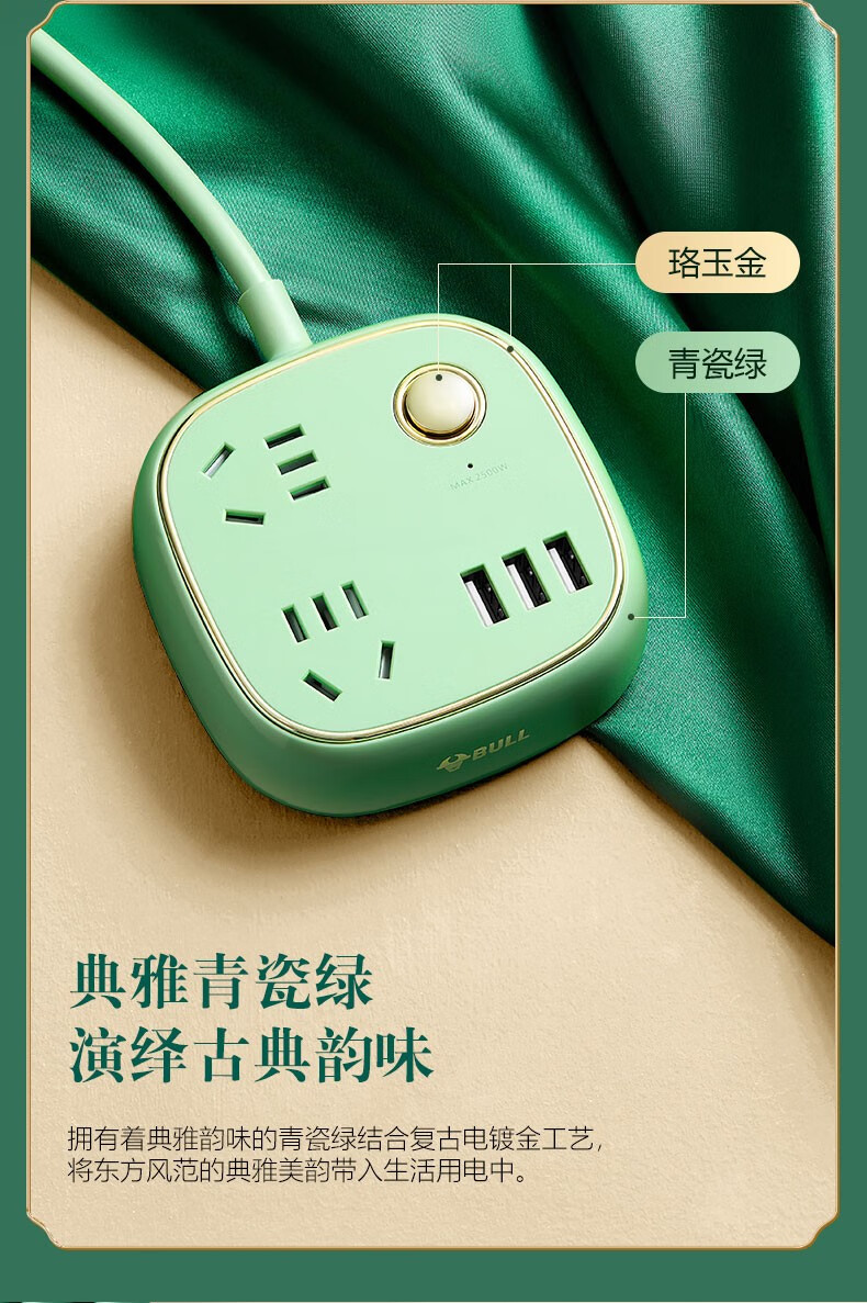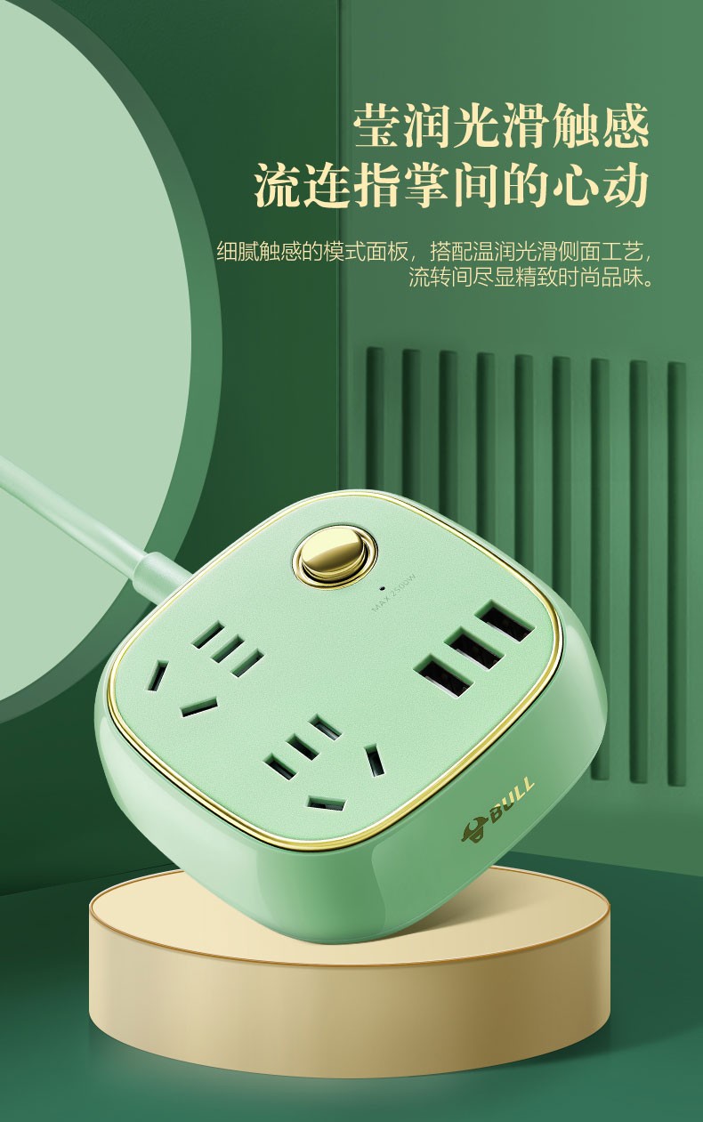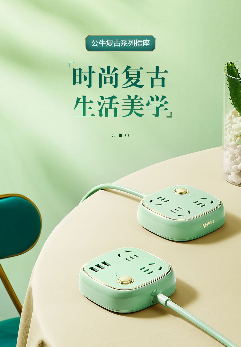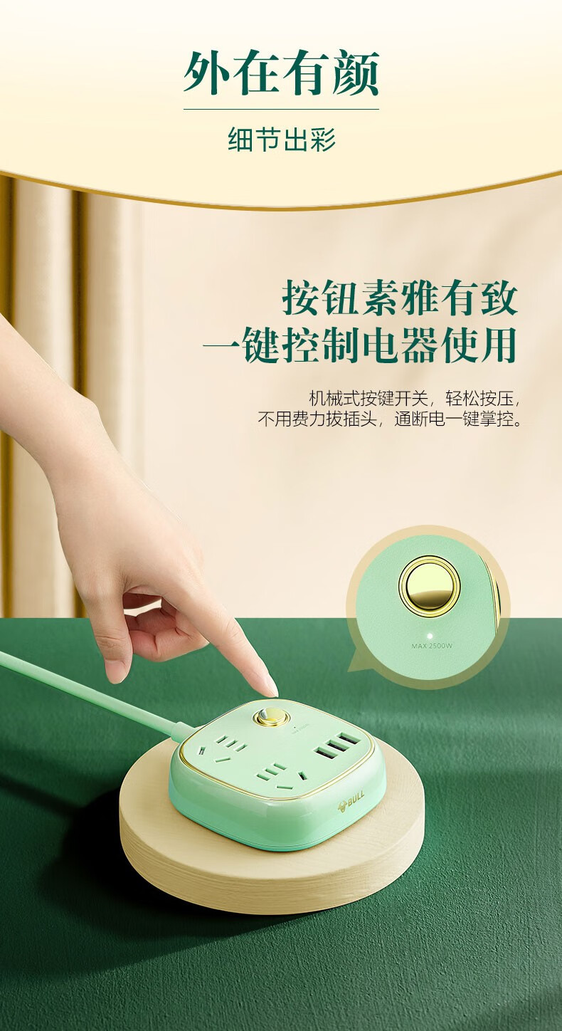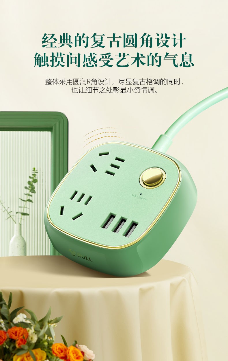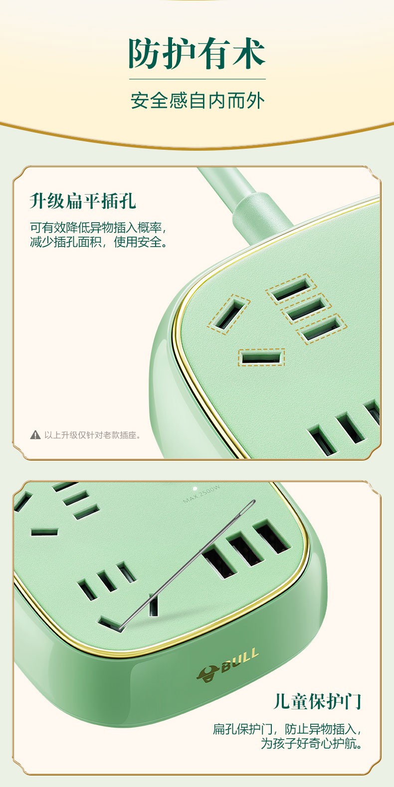 Bull socket retro girly heart safe and cute power strip on the bed for home with wired USB power strip smart power strip wiring board dormitory high-value power strip 2 sockets + USB + Typec 1.5 meters R602KQ black