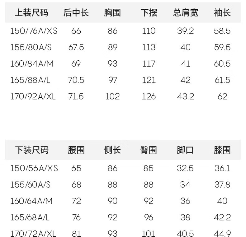 China (cm) 160-165/84-86 165-170 / 88-90 167-172 / 92-96 168-173 / 98-102 170-176 / 106-110