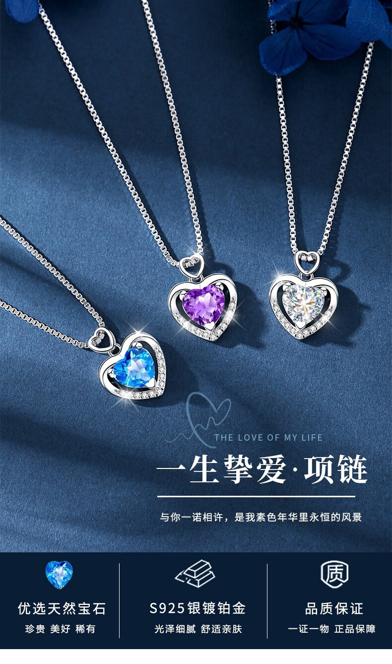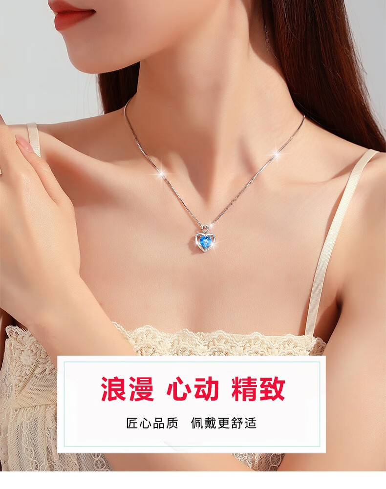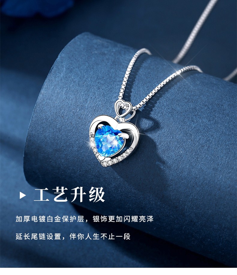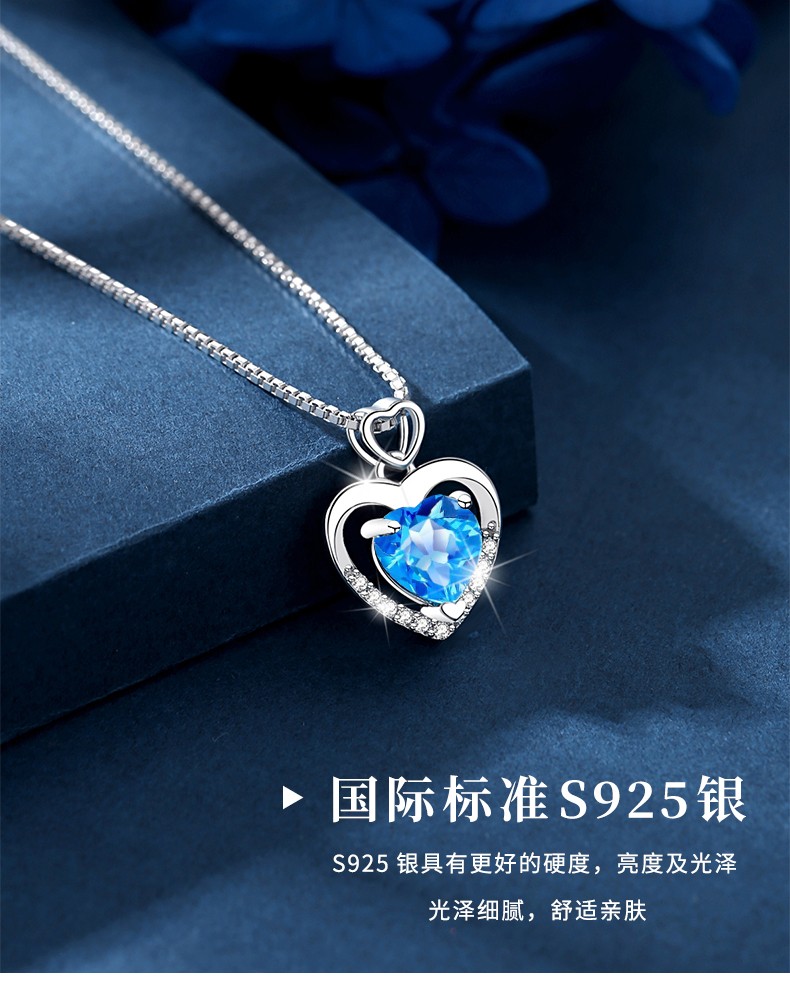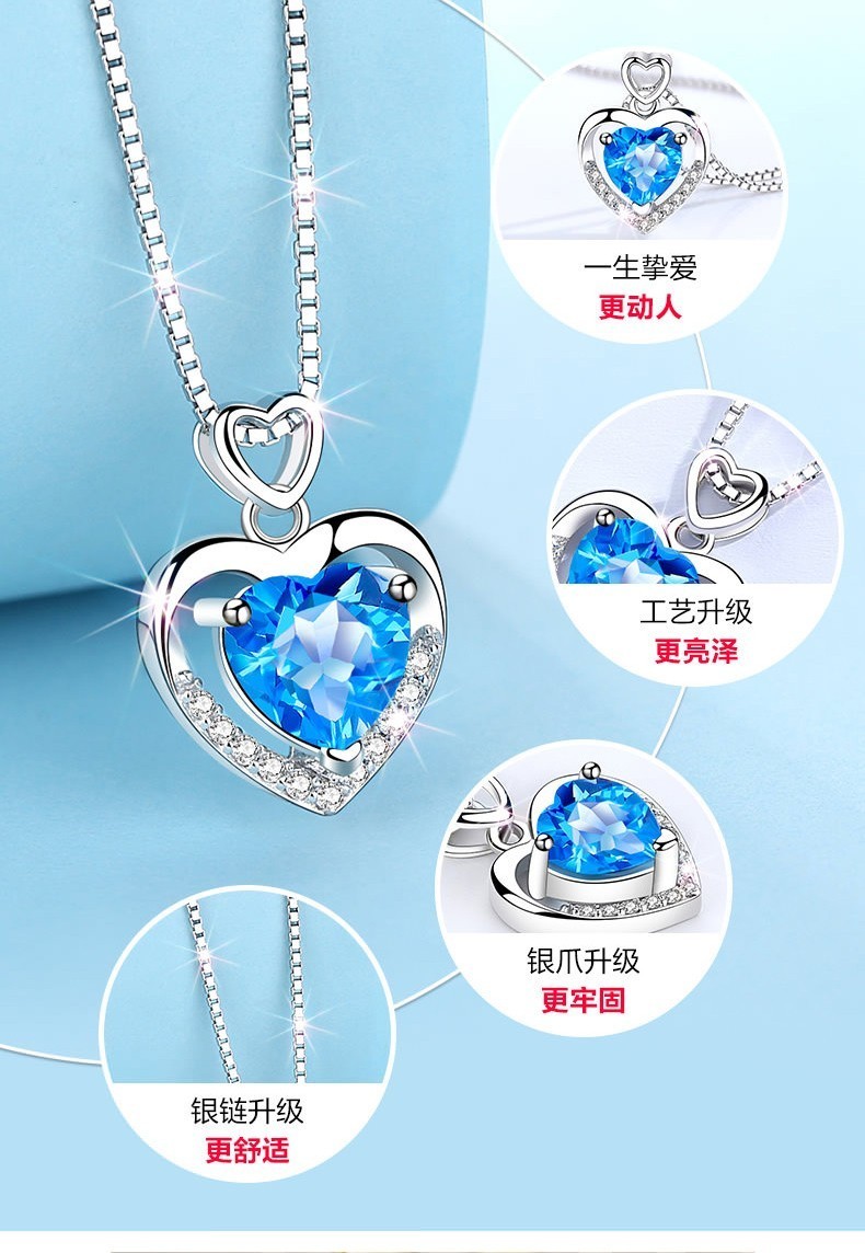 Falinro Ocean Heart Necklace Women's Heart-Shaped Gemstone Pendant High-end Light Luxury Silver Jewelry 520 Valentine's Day Gift for Girlfriend 1 Carat Topaz Four-Leaf Clover Necklace Free Engraving + Certificate