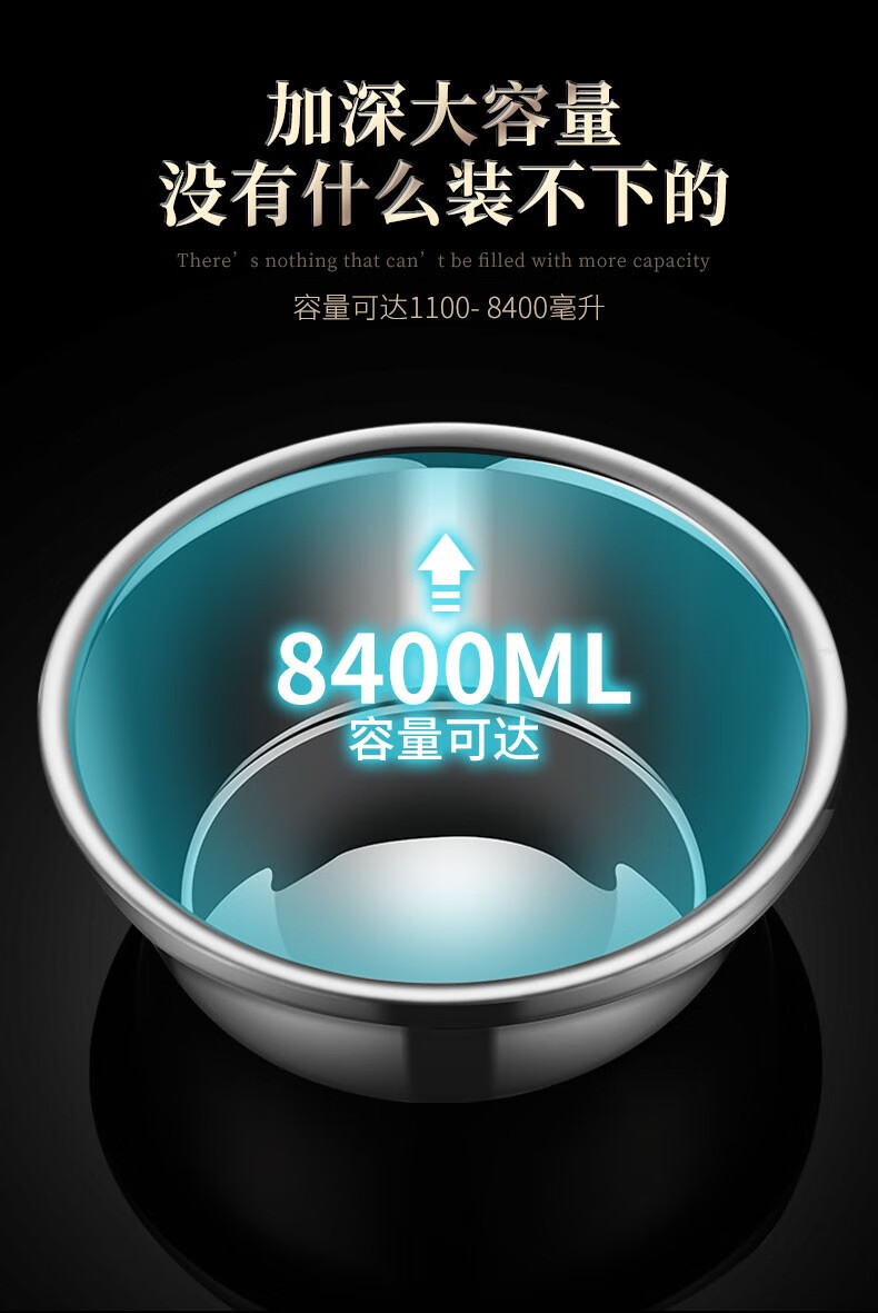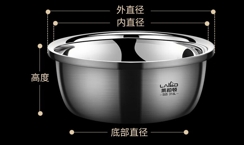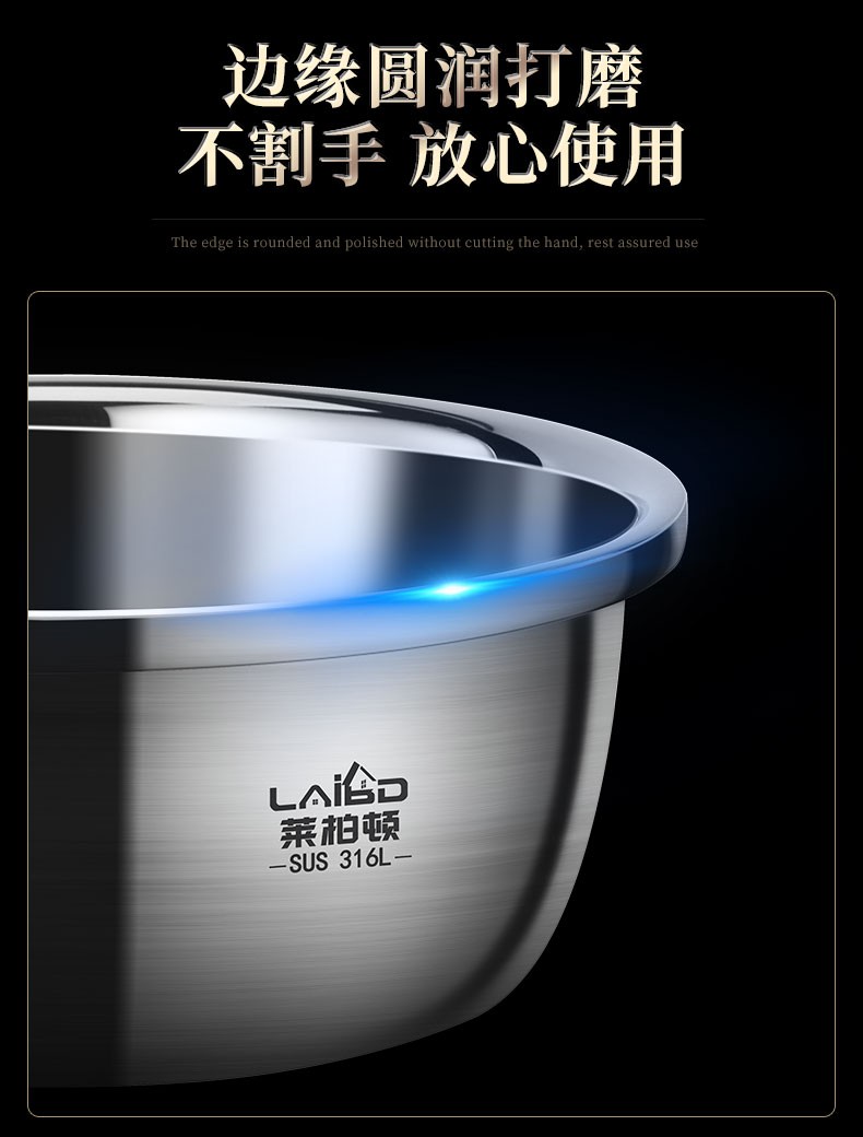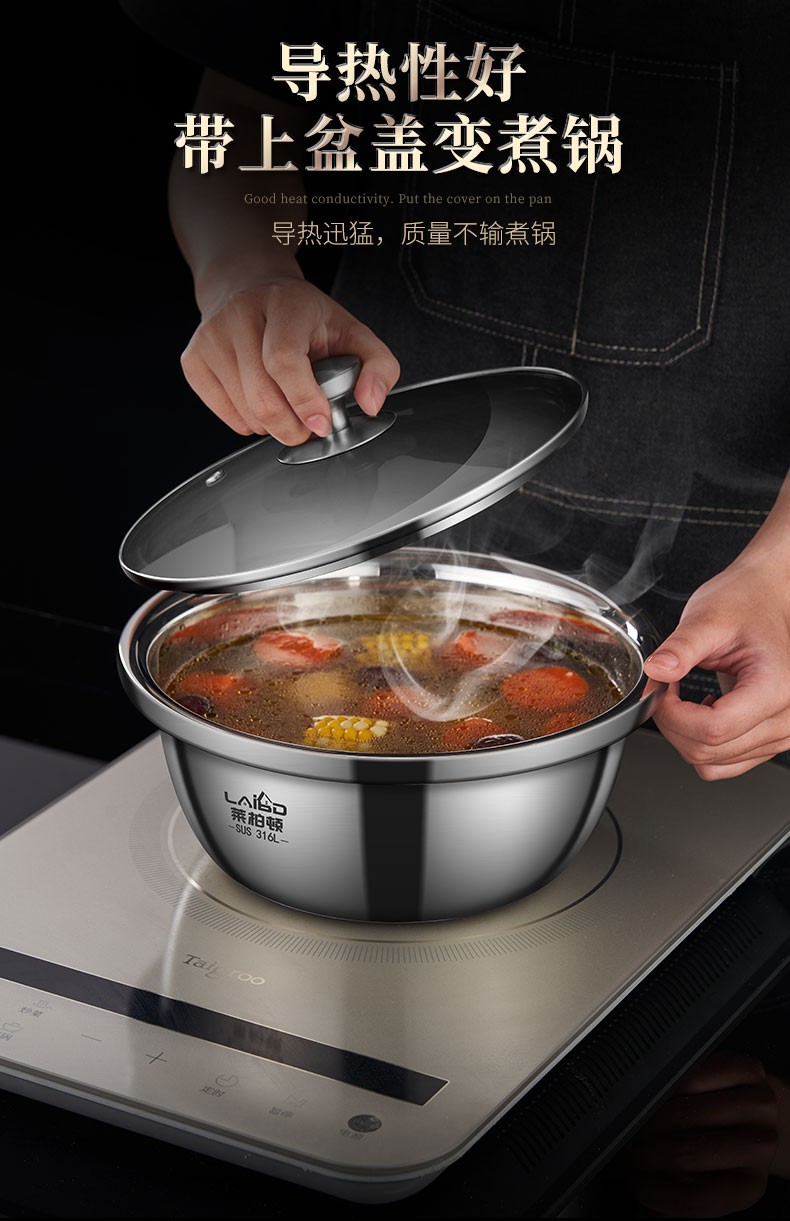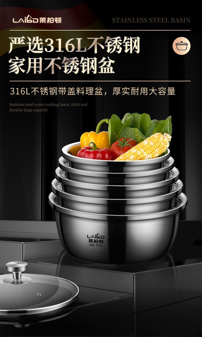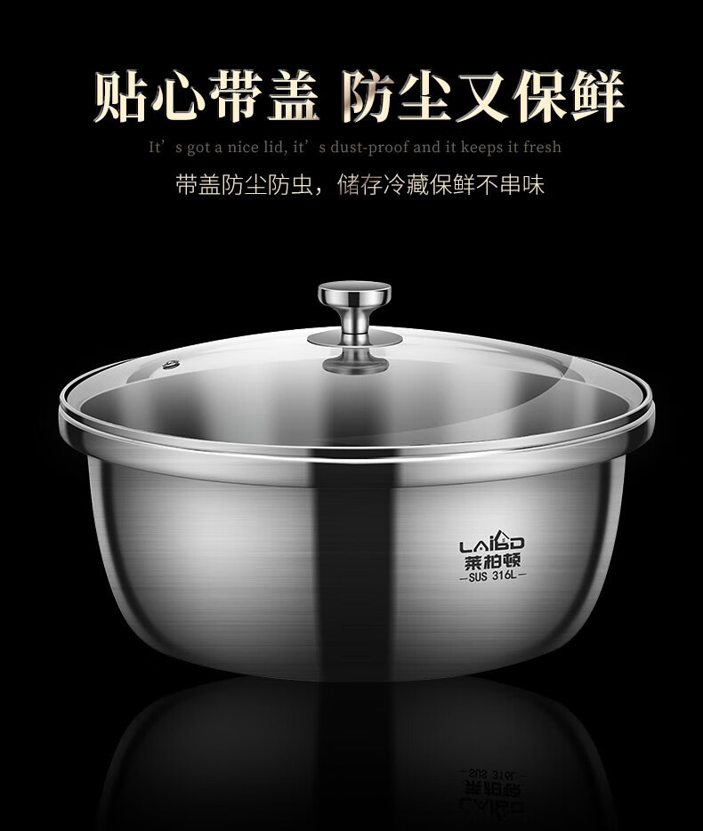 Laberton 316L stainless steel basin set with lid, glass household oil basin, thickened and deepened, dough baking basin, dough kneading basin, soup basin, kitchen 34CM stainless steel basin 316L + tempered glass lid 8.4L
