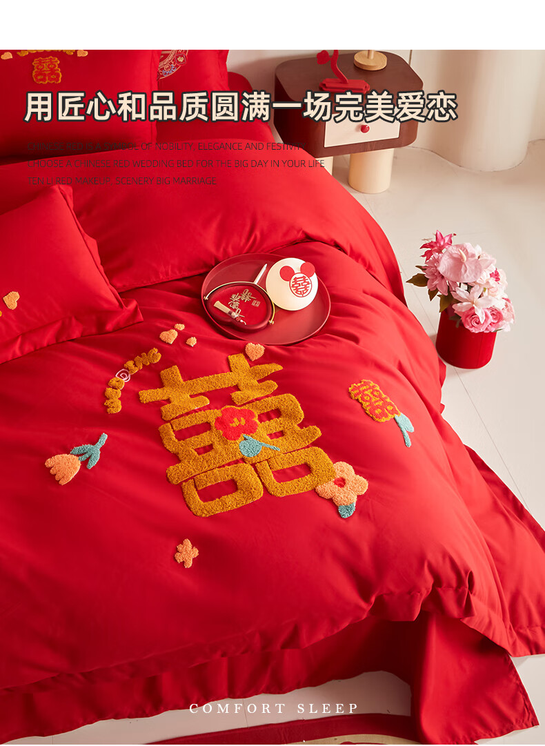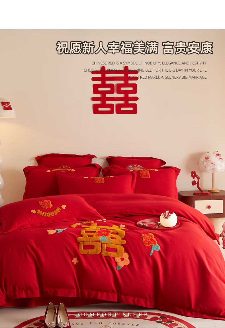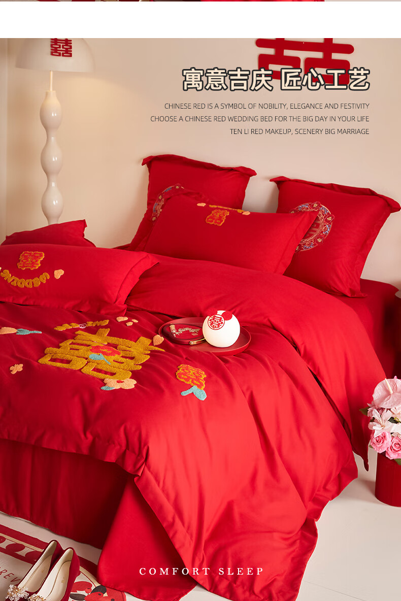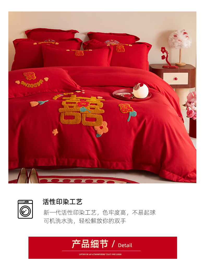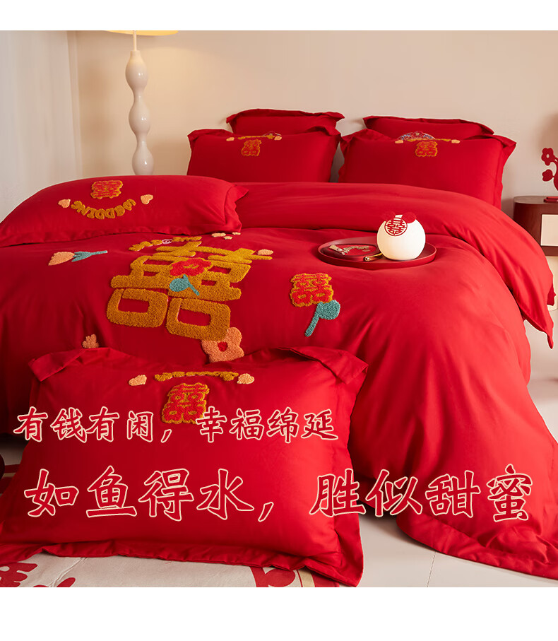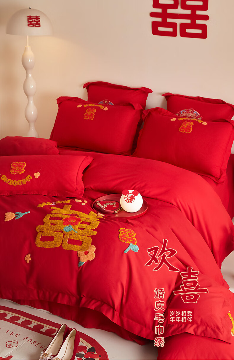 Yalu skin-friendly towel embroidered wedding four-piece set big red embroidered quilt cover bed sheet wedding bedding 1.8M bed romantic engagement 1.8m bed sheet style four-piece set-quilt cover 200*230cm