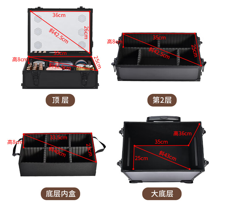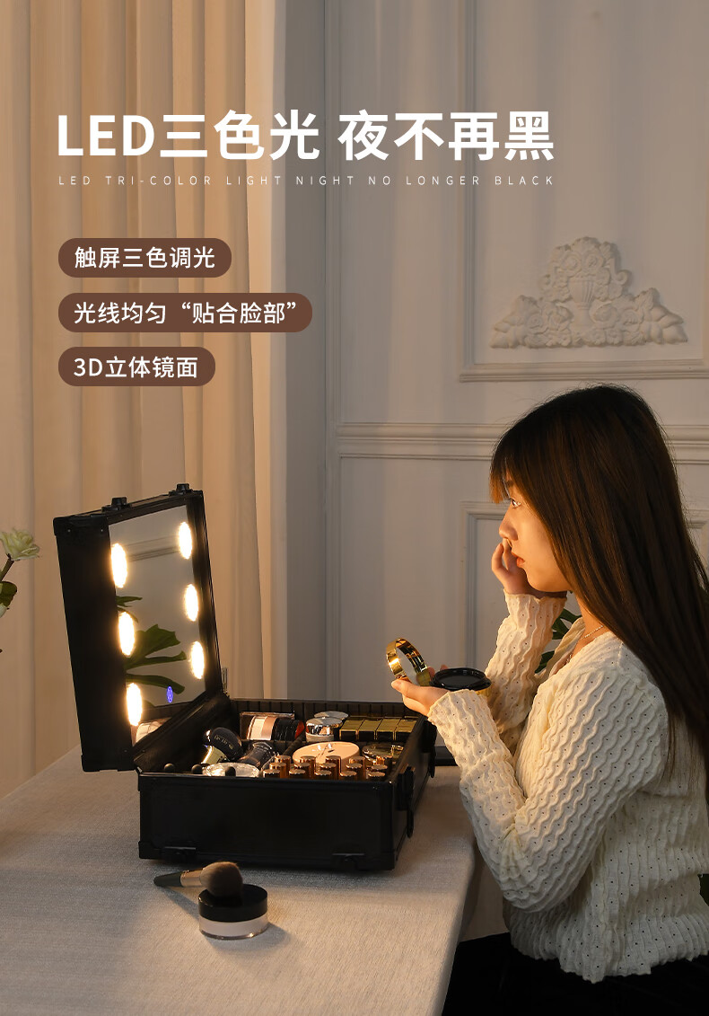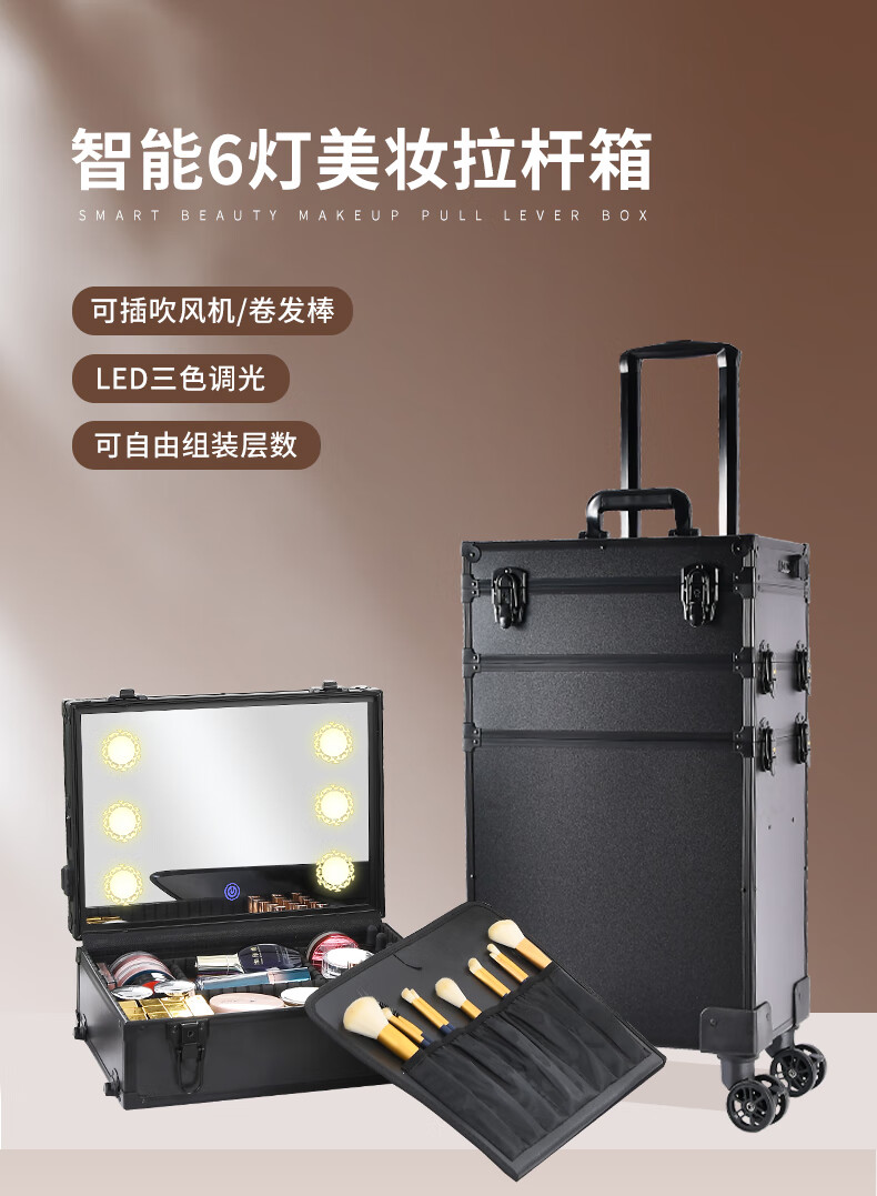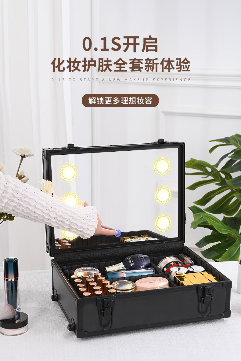Qilong new makeup box professional makeup artist trolley box with light 2025 large capacity high-end bridal cosmetics storage box black upgraded charging model four layers 6 lights