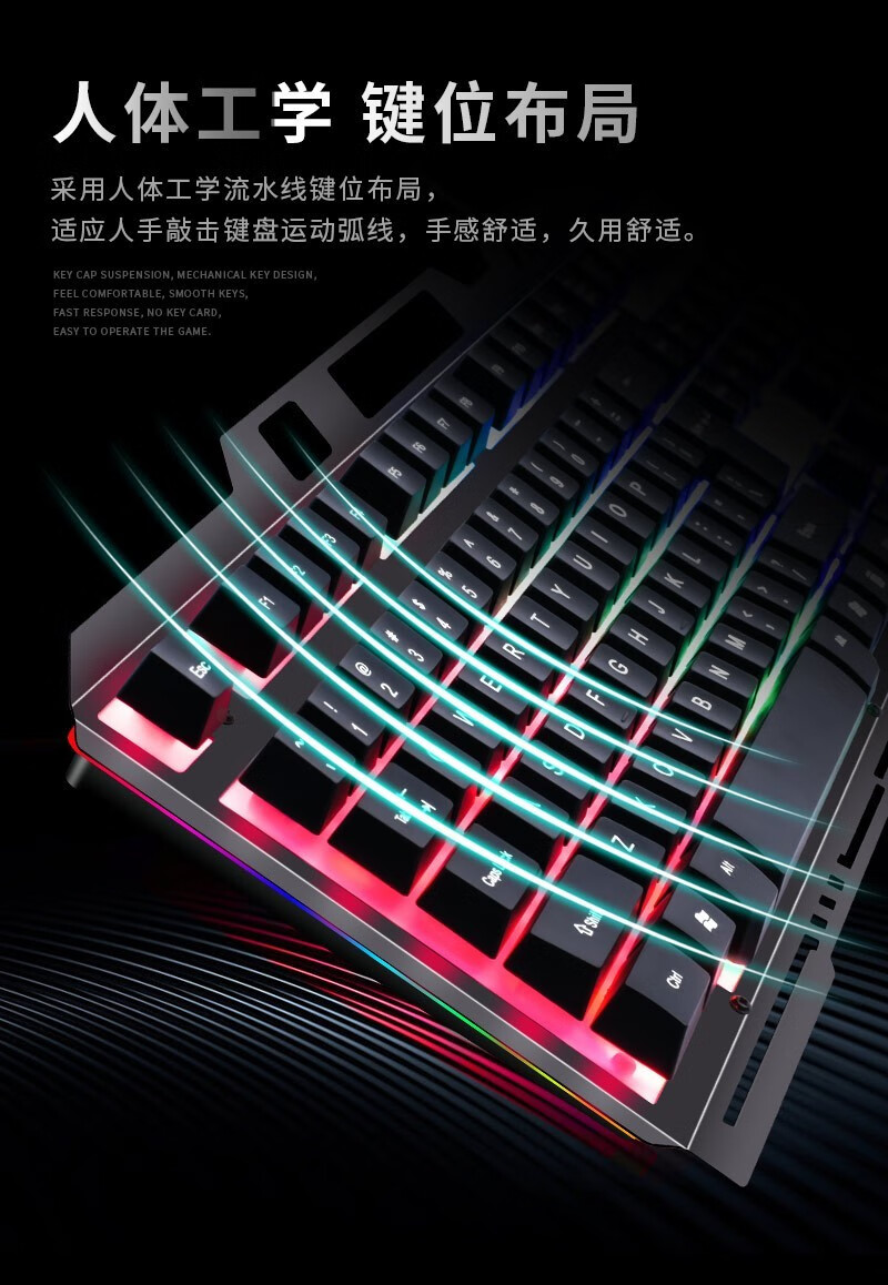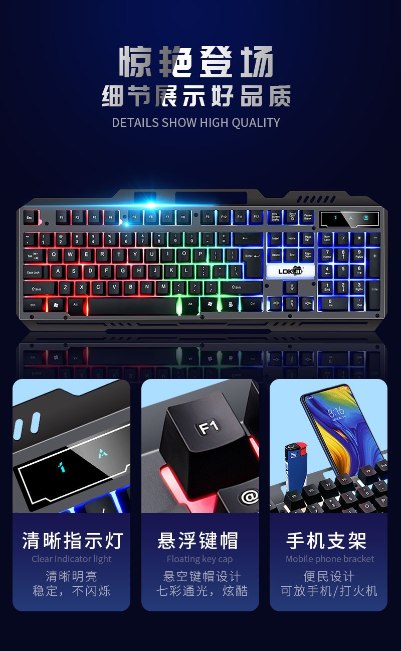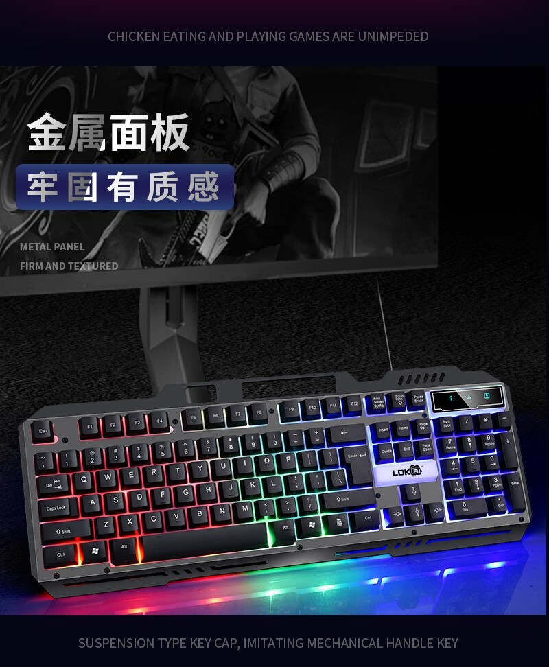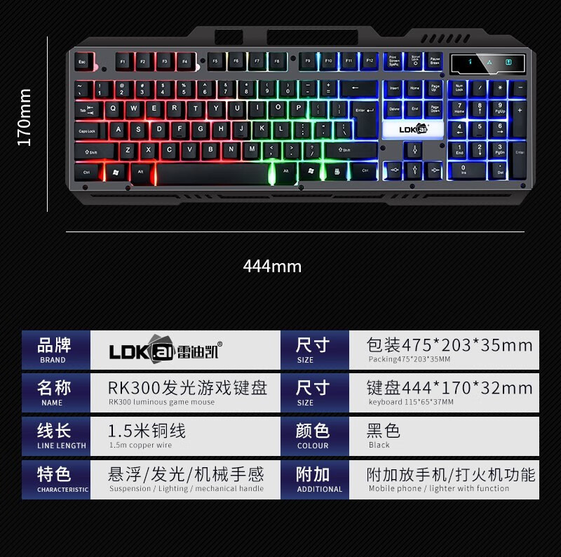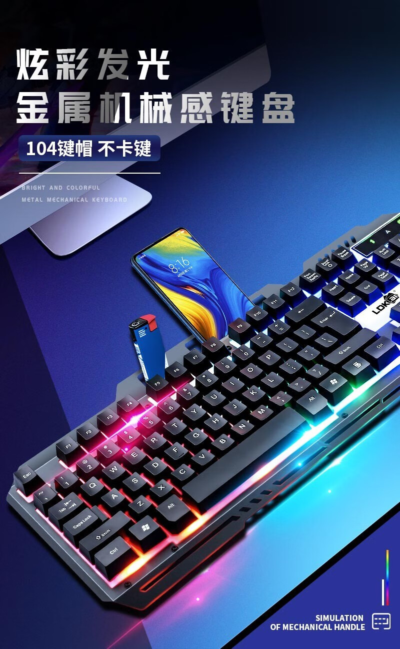 LDK.al RK300 Juego de teclado y mouse para cibercafé, sensación mecánica, panel de metal, teclado retroiluminado luminoso de tamaño completo de 104 teclas, teclado y mouse para computadora portátil, teclado luminoso genial + mouse agrietado + auriculares