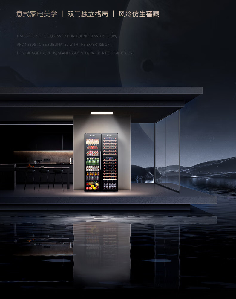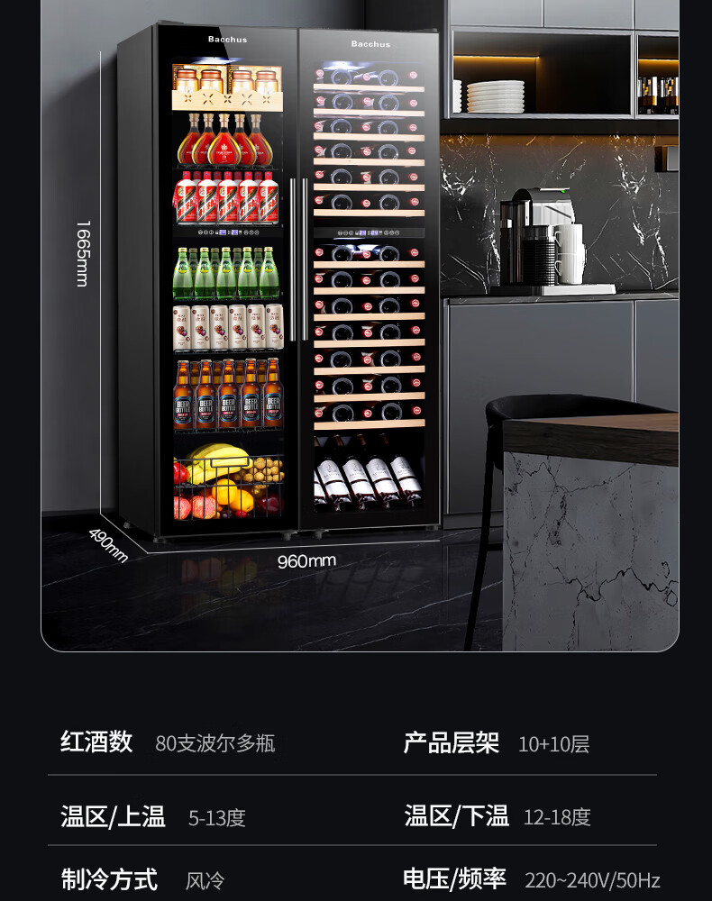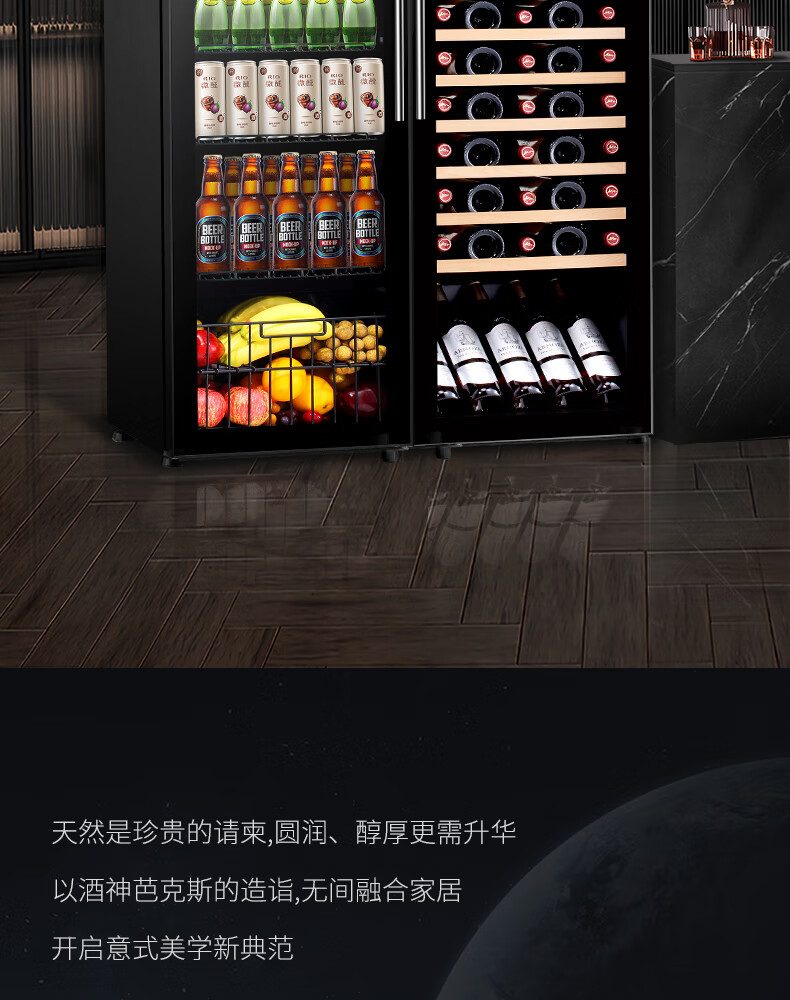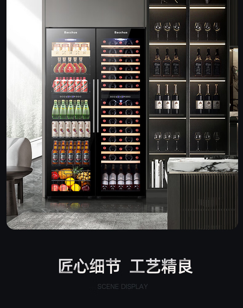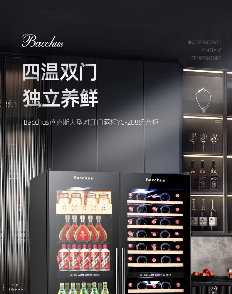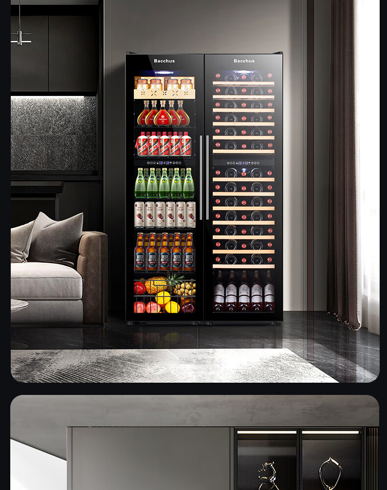 Bacchus wine cabinet with double doors, 150 bottles, thermostatic cabinet, home commercial tea cabinet, frozen beer, champagne, whiskey ice bar, double-door built-in wine storage, large living room, villa, combination cabinet, left ice bar type + right all-wood shelf type 416L YC-208 air-cooled compressor four temperature zones