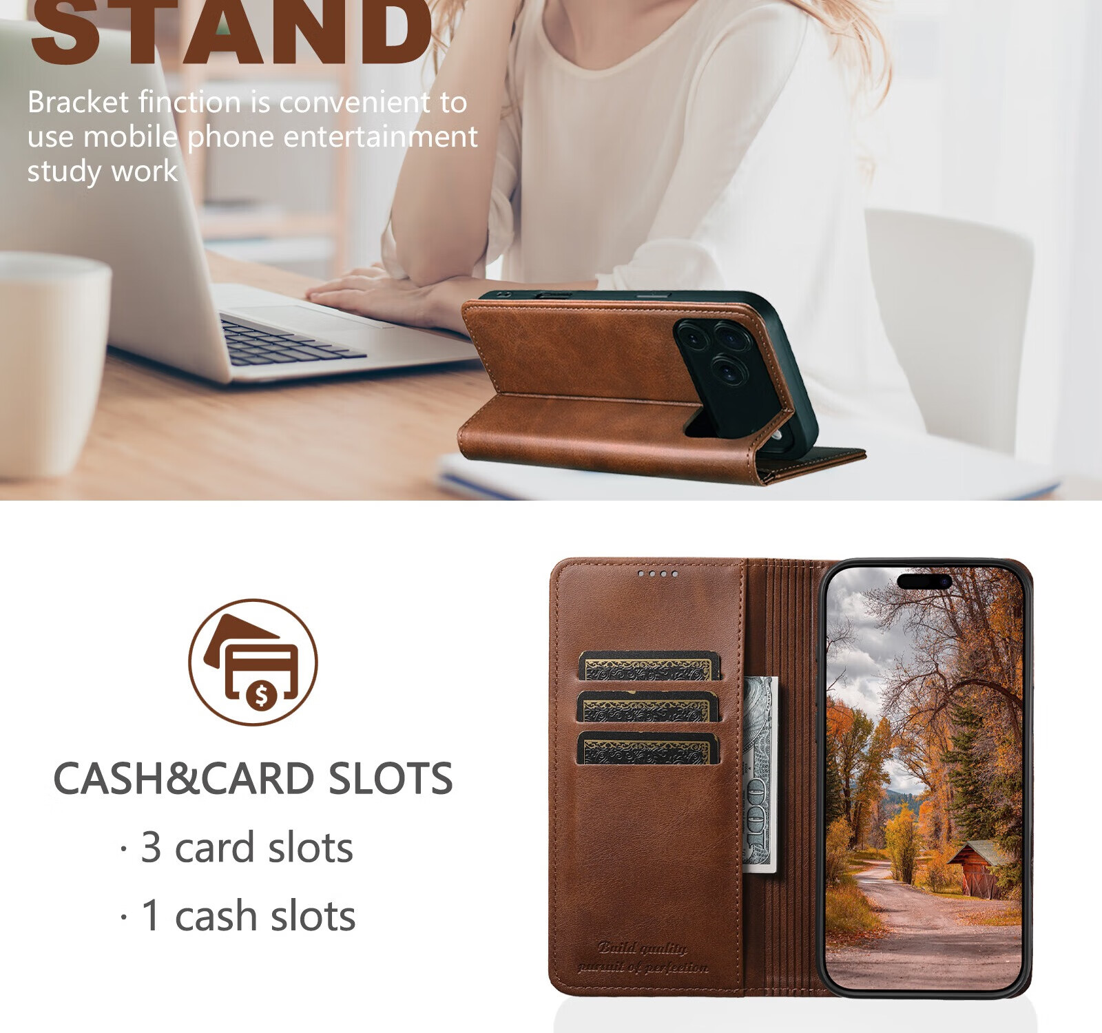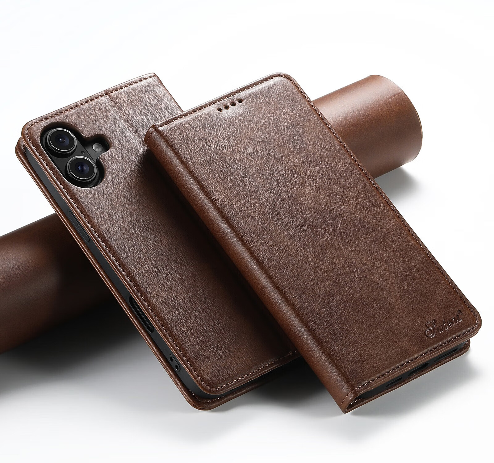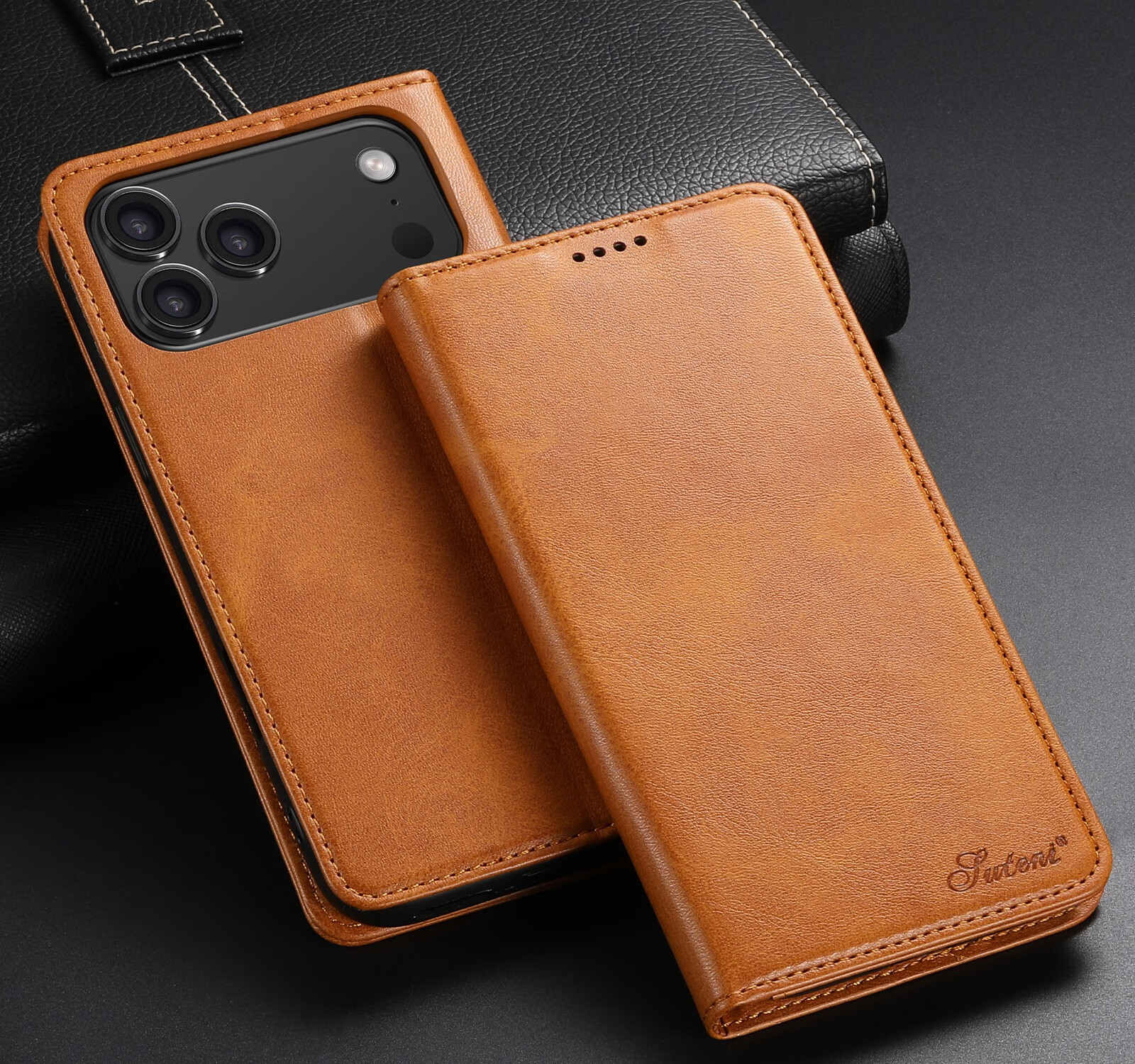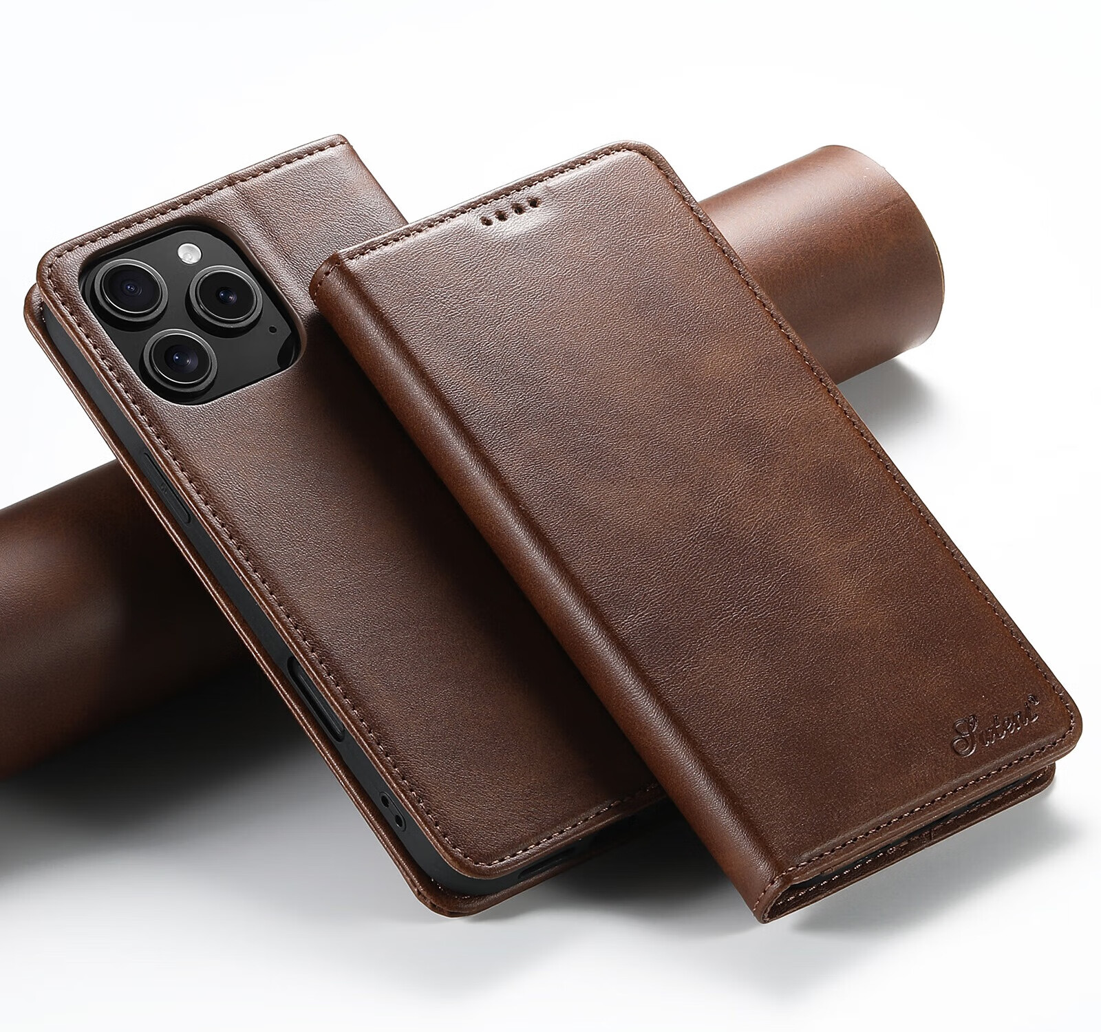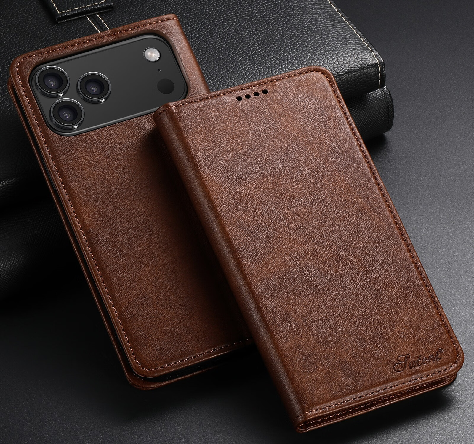 Luo Yi is suitable for Apple 17ProMax mobile phone case iPhone16/15/14/13Pro genuine leather clamshell magnetic leather case all-inclusive anti-fall silicone protective cover for men and women high-end brown calf simple magnetic leather case Apple 15ProMax