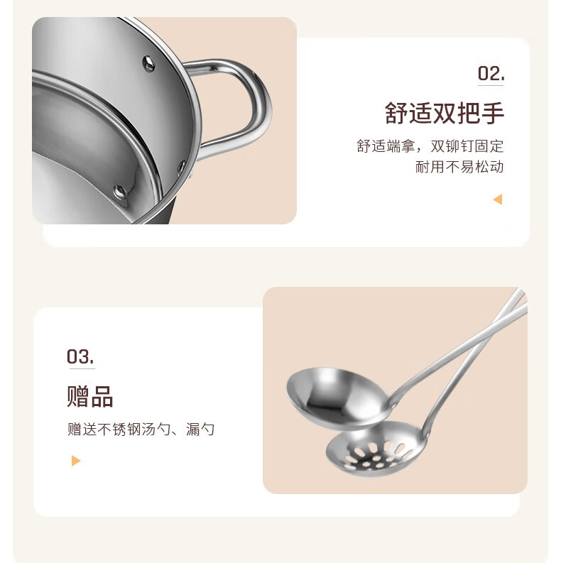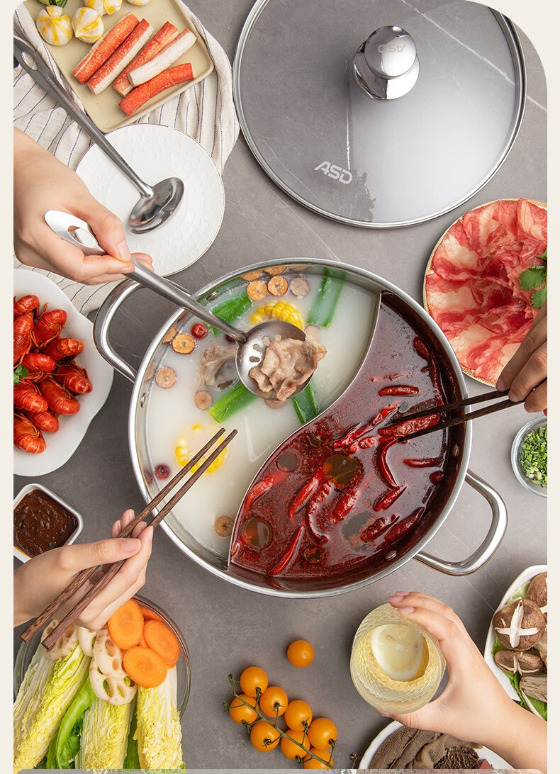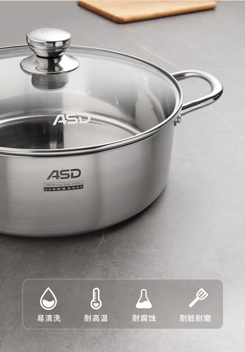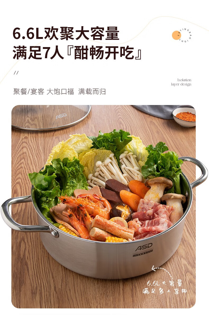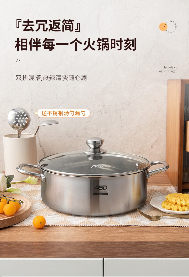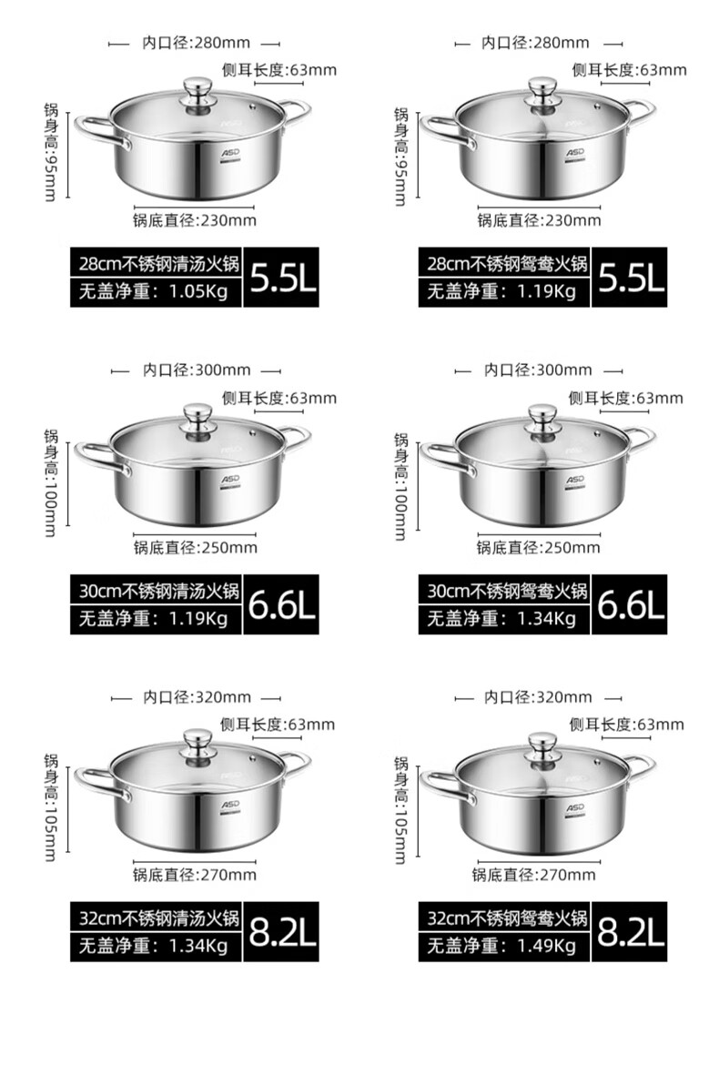 ASD hot pot 304 stainless steel straight large capacity hot pot soup pot kitchen household living room shabu shabu electromagnetic open flame universal cyclone double bottom clear soup hot pot 28cm