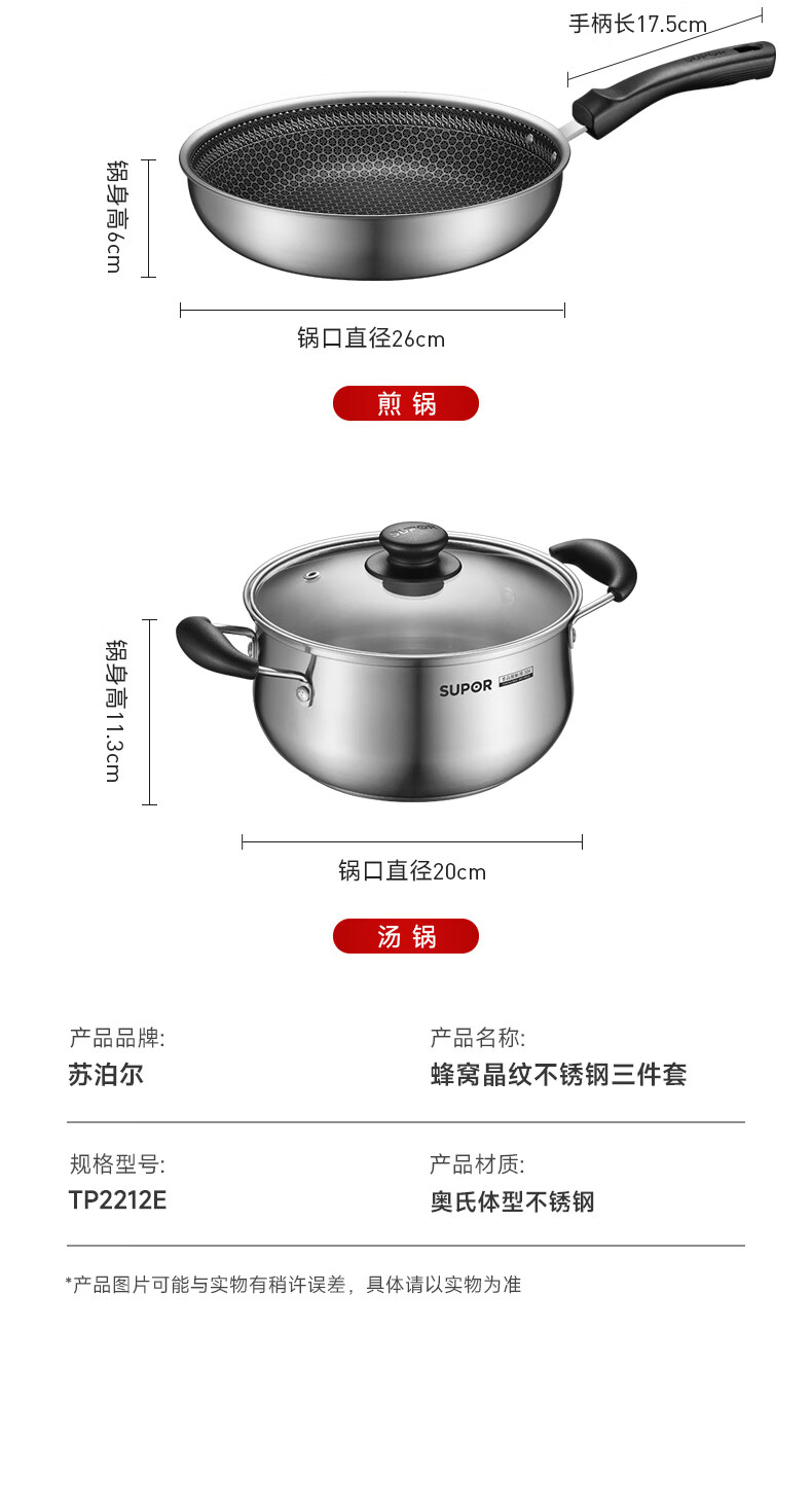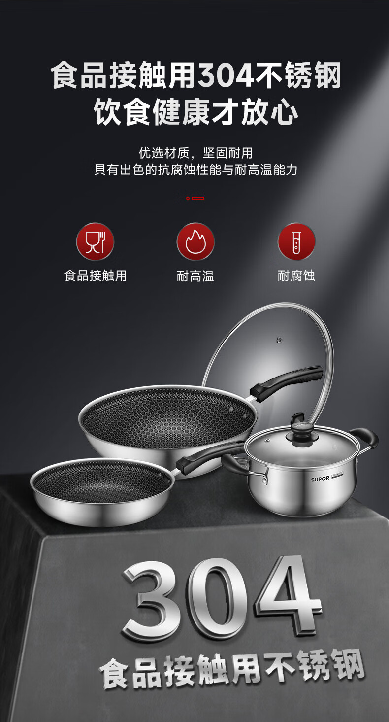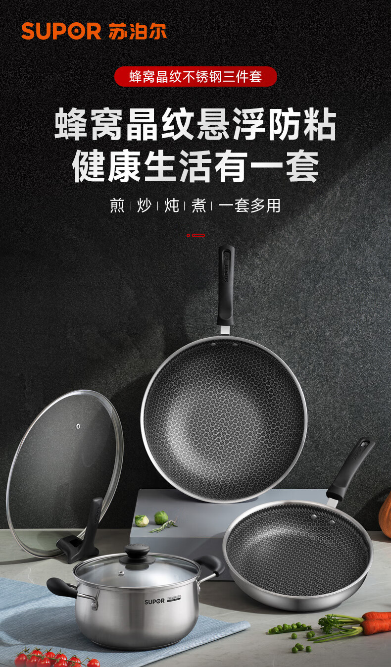 SUPOR pot set non-stick honeycomb crystal stainless steel three-piece set home kitchen wok frying pan soup pot healthy TP2212E
