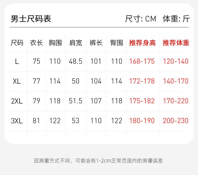 China (cm) 165 / 88-90 170 / 96-98 175 / 108-110 180 / 118-122 185 / 126-130