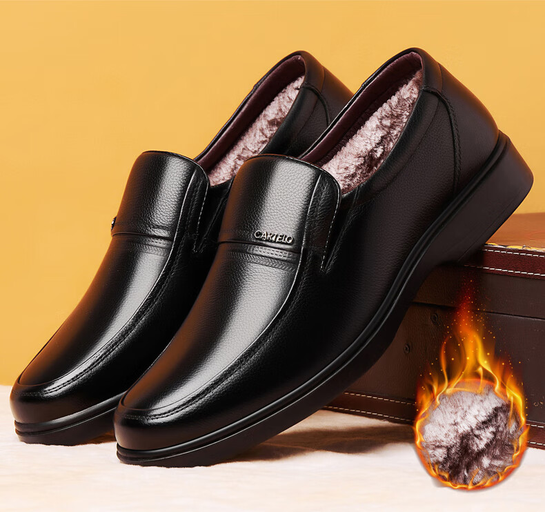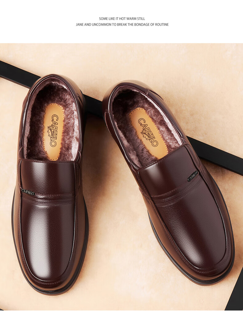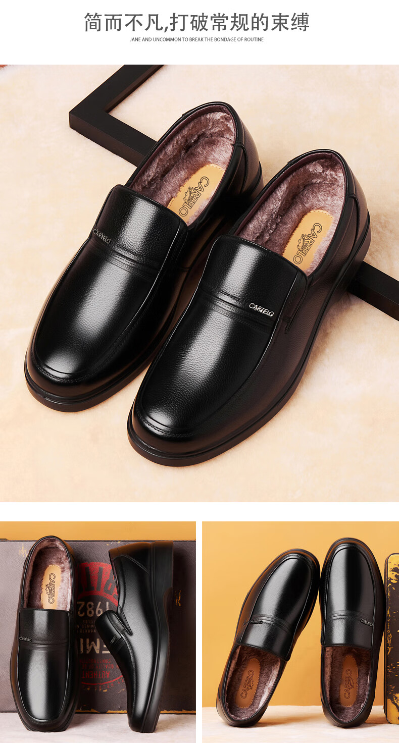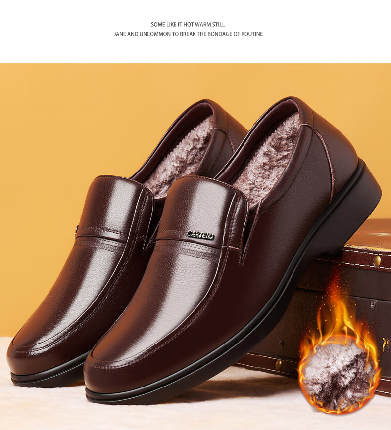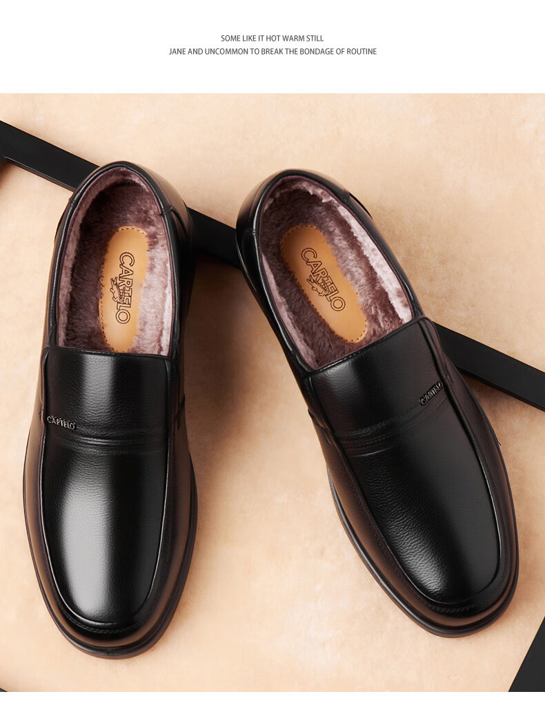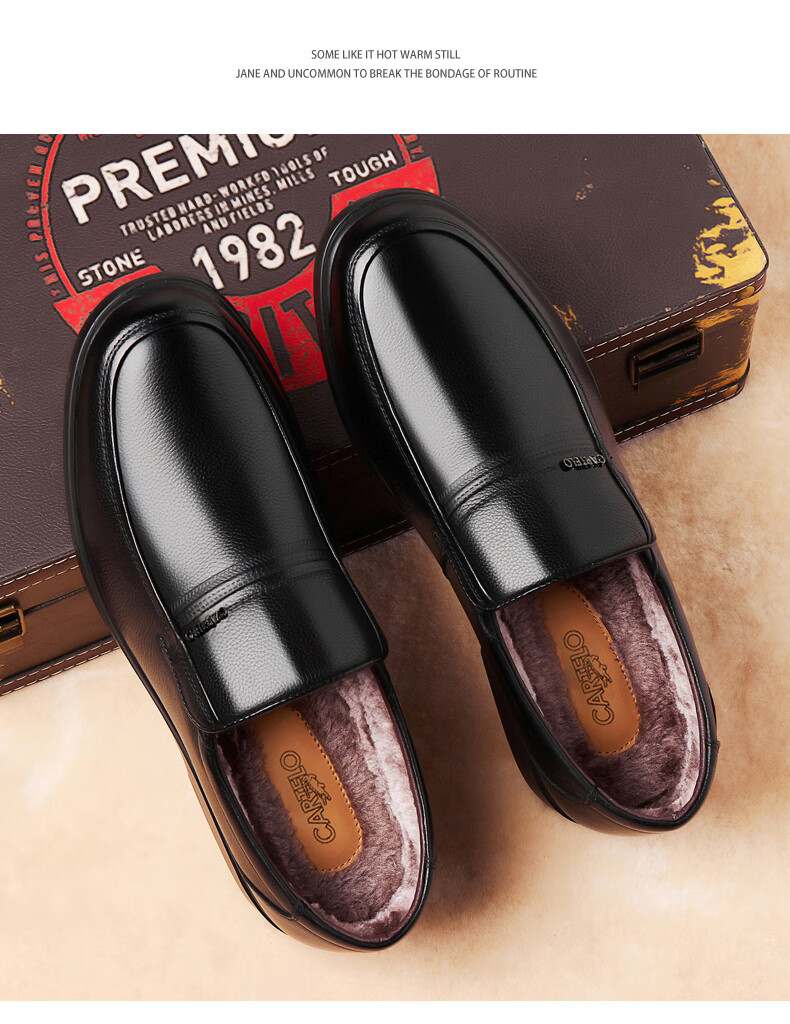 CARTELO Men's Winter Velvet Leather Shoes Men's Genuine Leather Business Casual Soft Sole Middle-aged Dad Shoes Middle-aged Warm Cotton Shoes Black Velvet Style 42