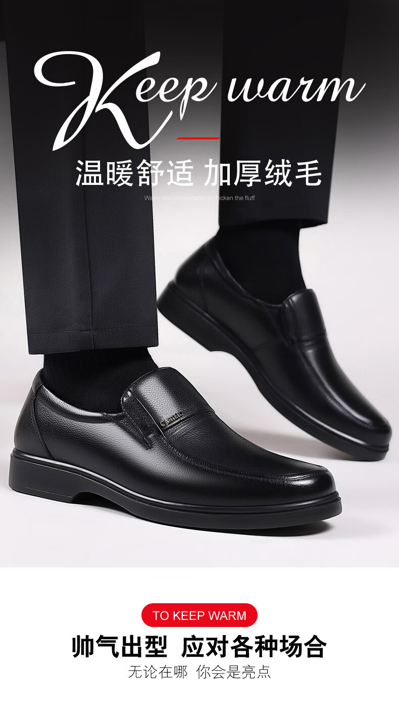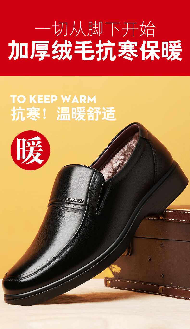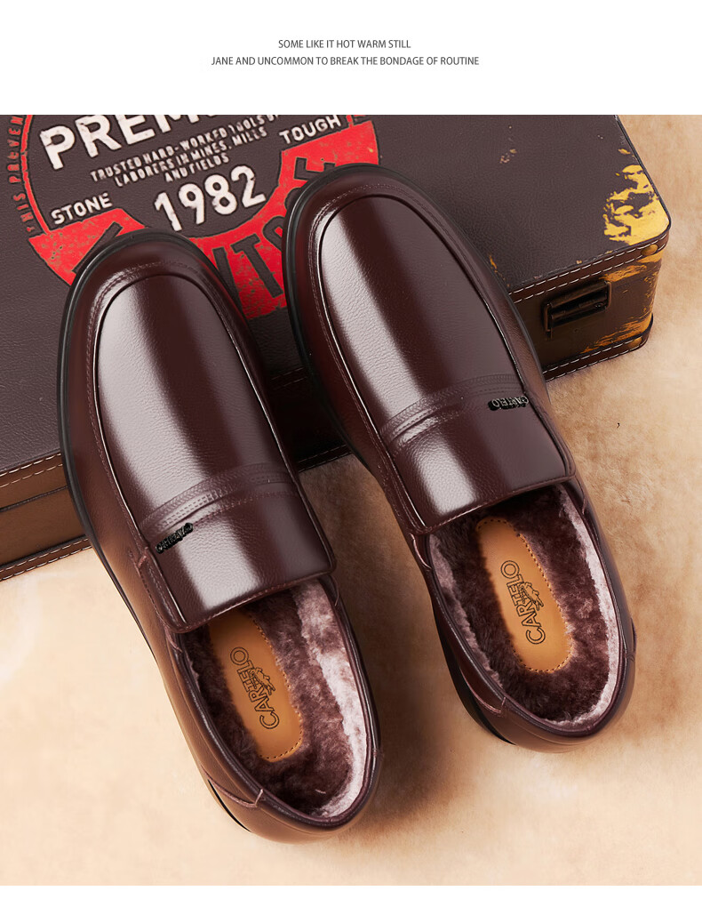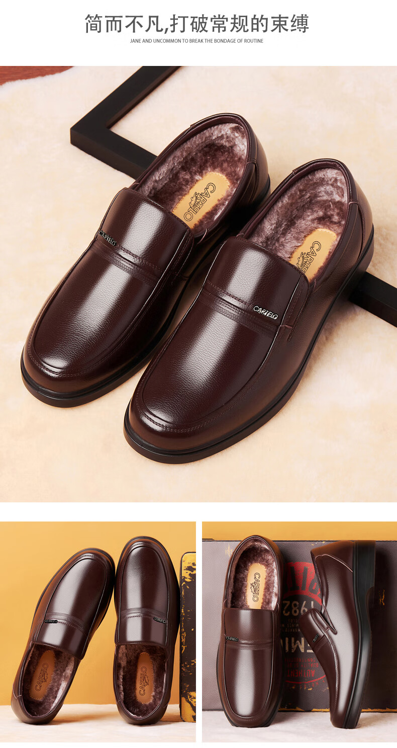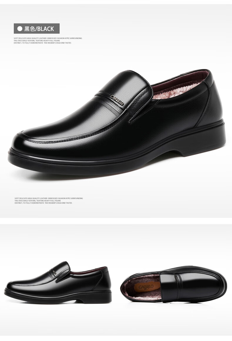 CARTELO Men's Winter Velvet Leather Shoes Men's Genuine Leather Business Casual Soft Sole Middle-aged Dad Shoes Middle-aged Warm Cotton Shoes Black Velvet Style 42
