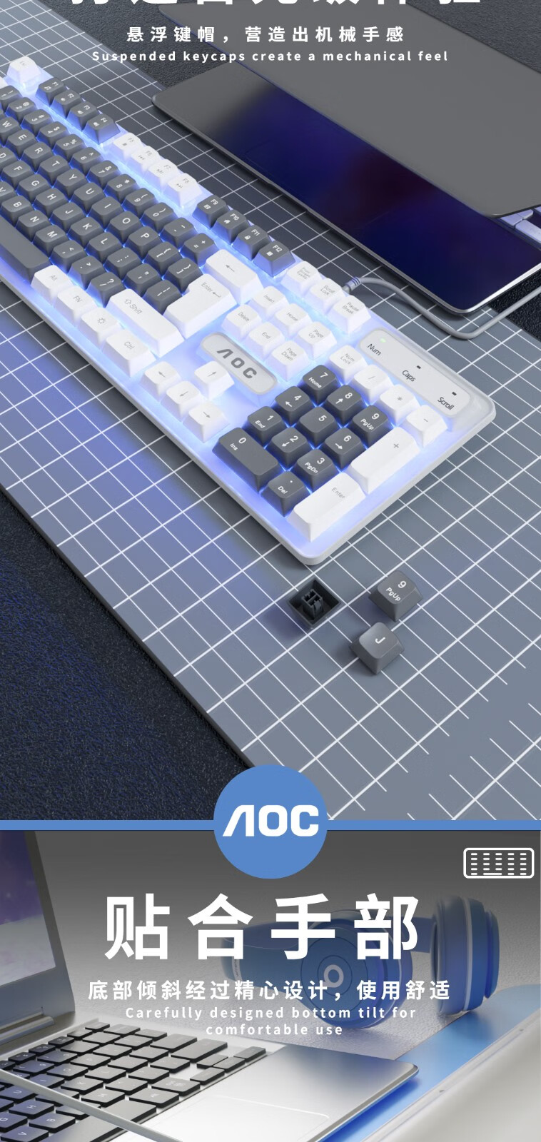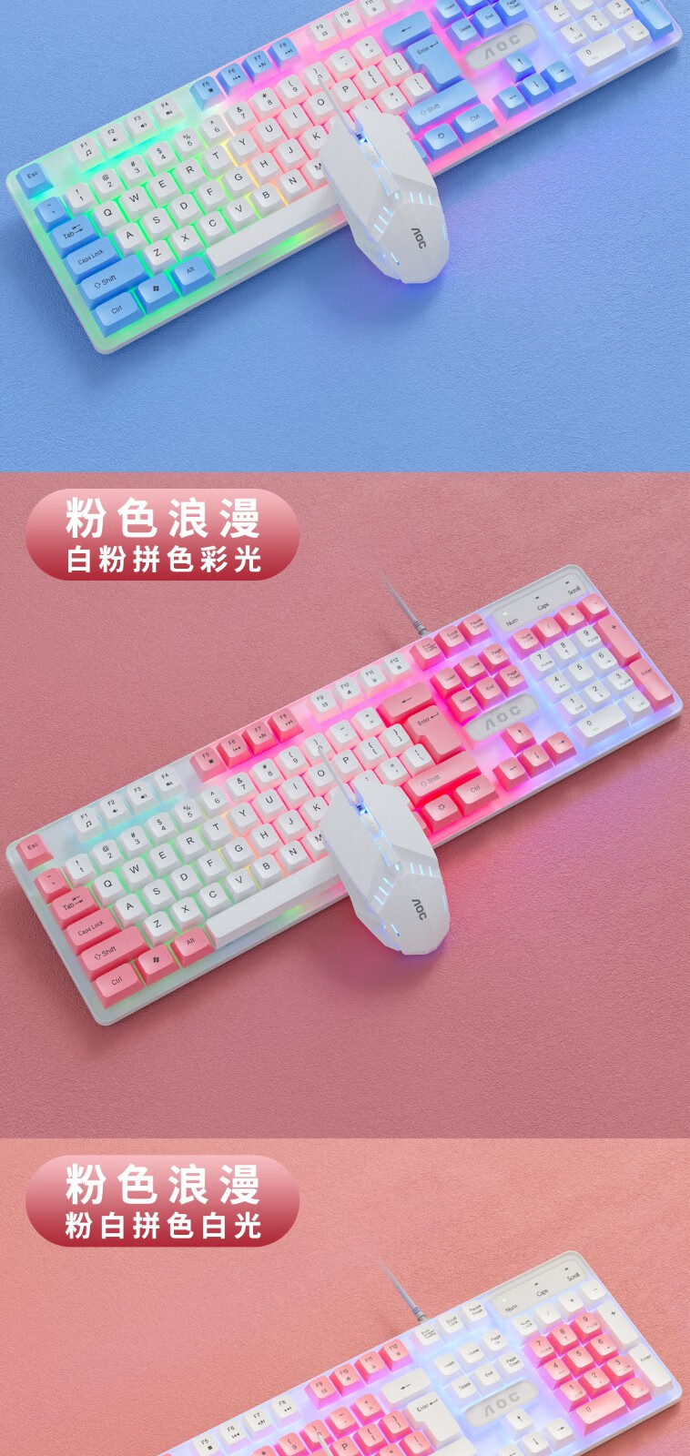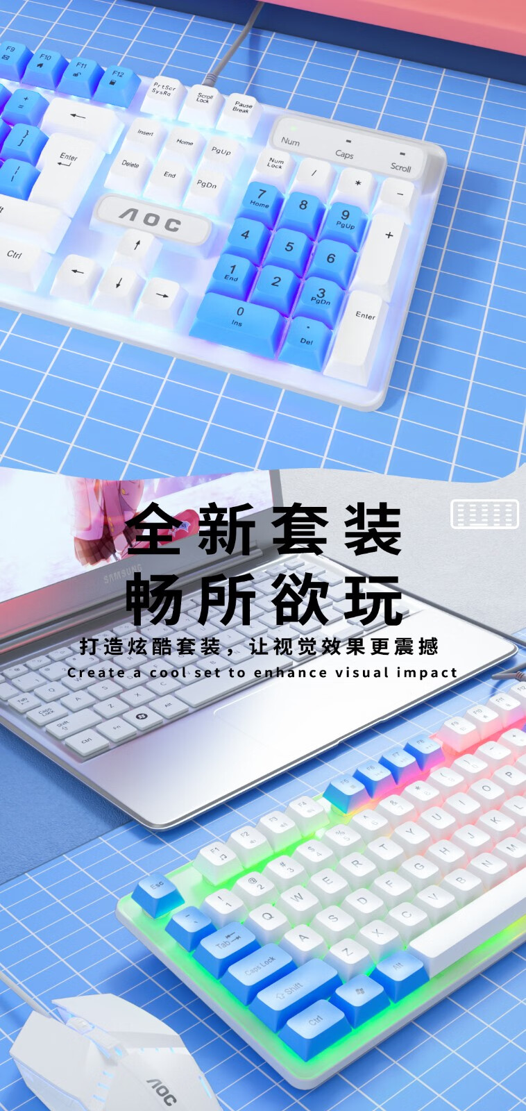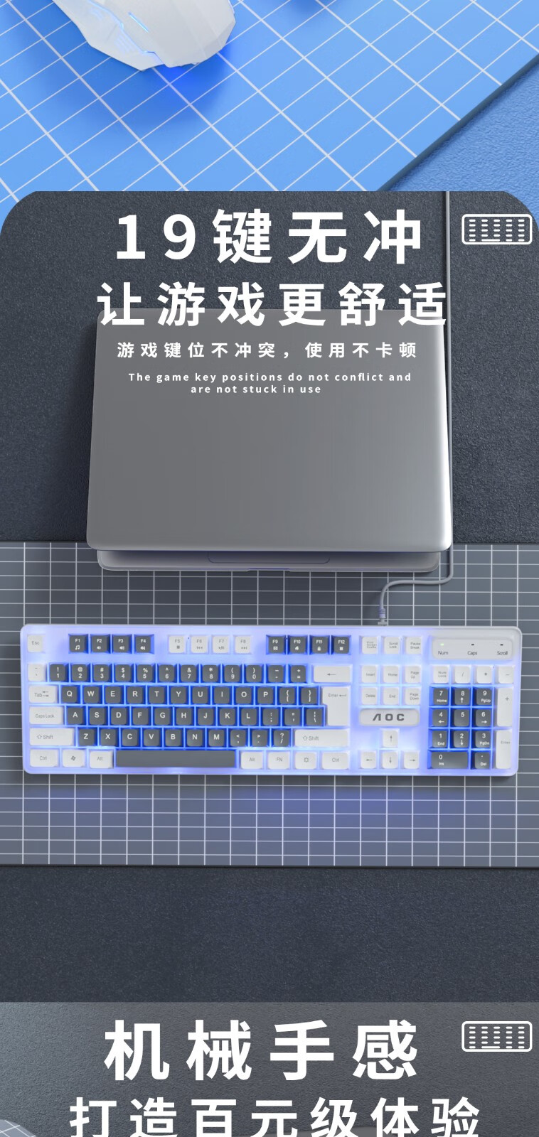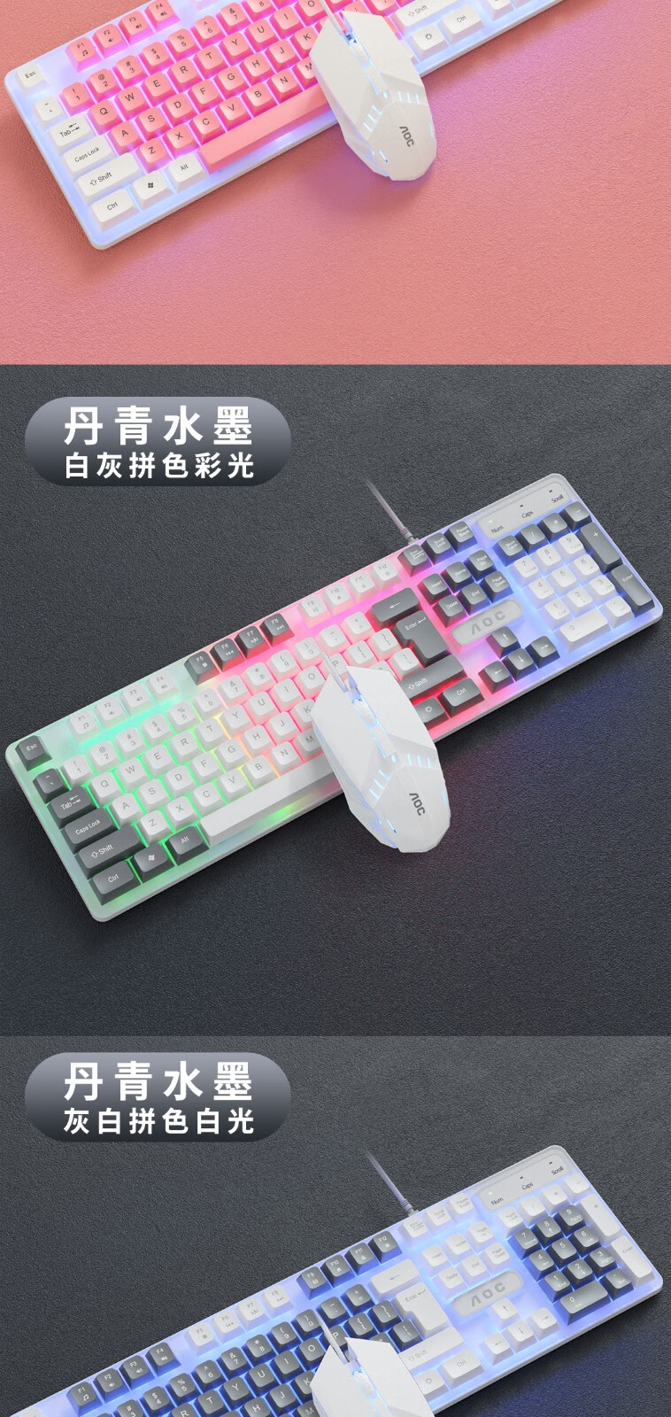 AOC True Mechanical Feel Keyboard and Mouse Set Wired Game Backlight Luminous Desktop Computer USB Peripheral Notebook Office LoL Chicken Internet Cafe E-Sports Membrane Keyboard and Mouse KM100 White Single Keyboard