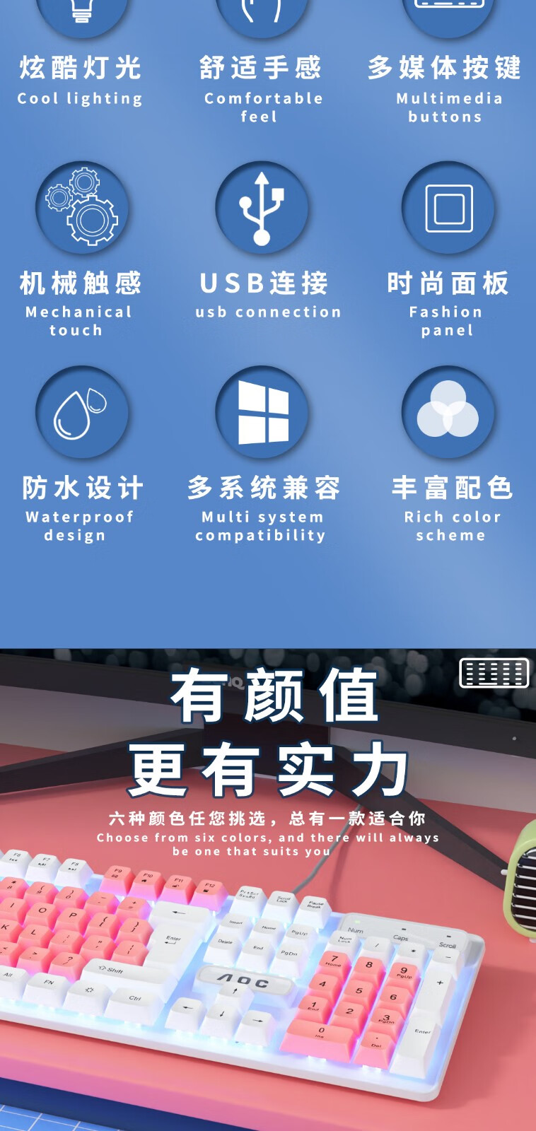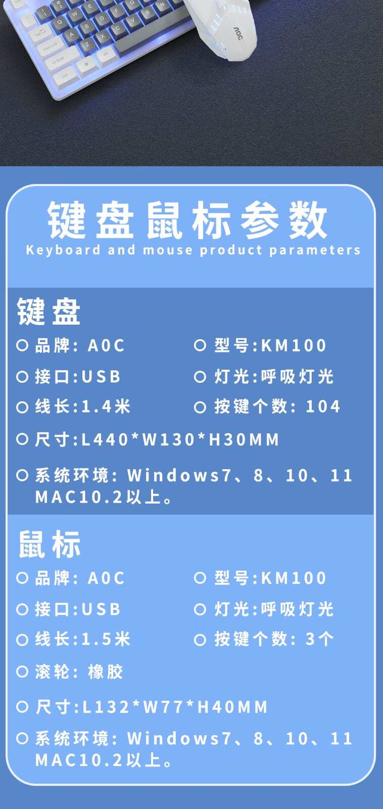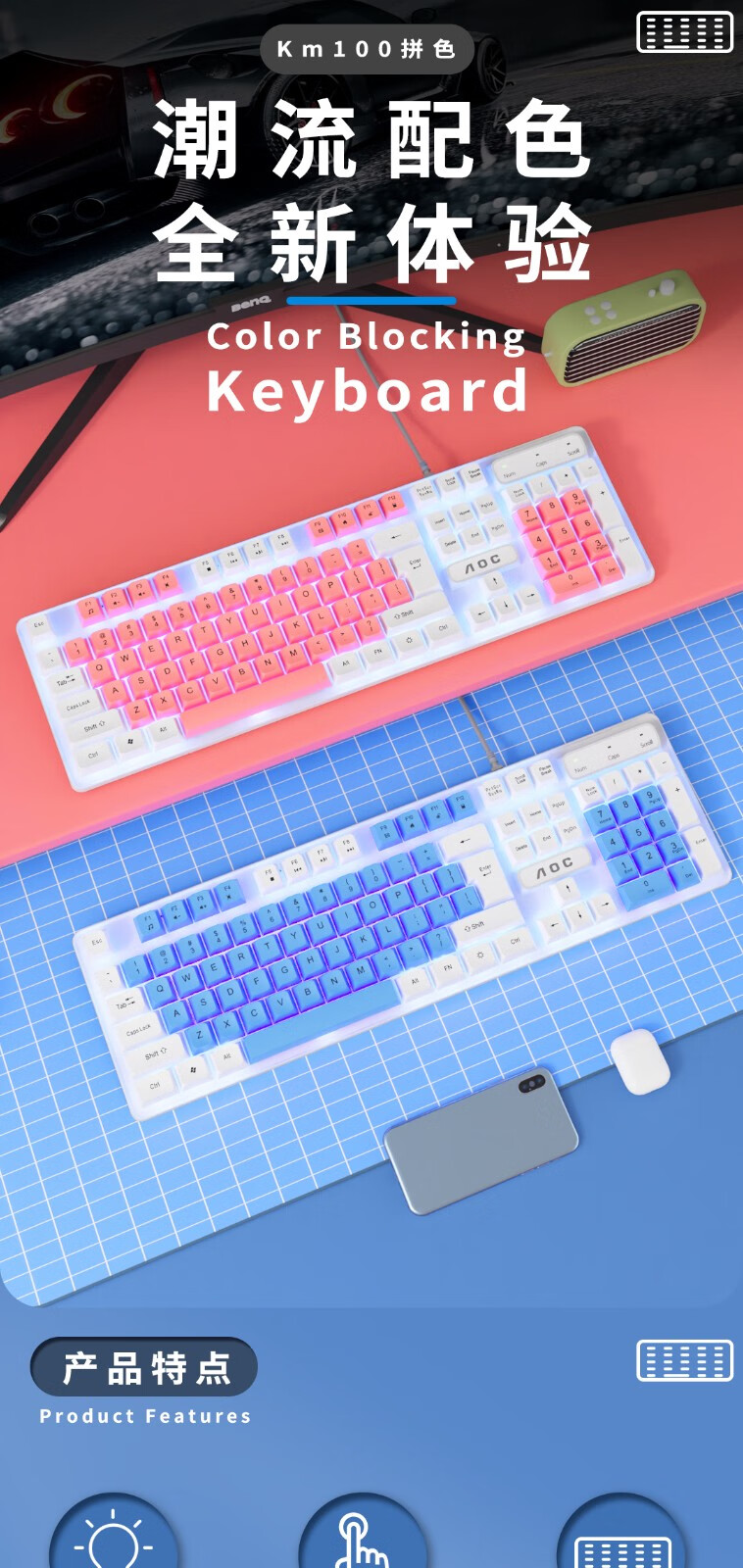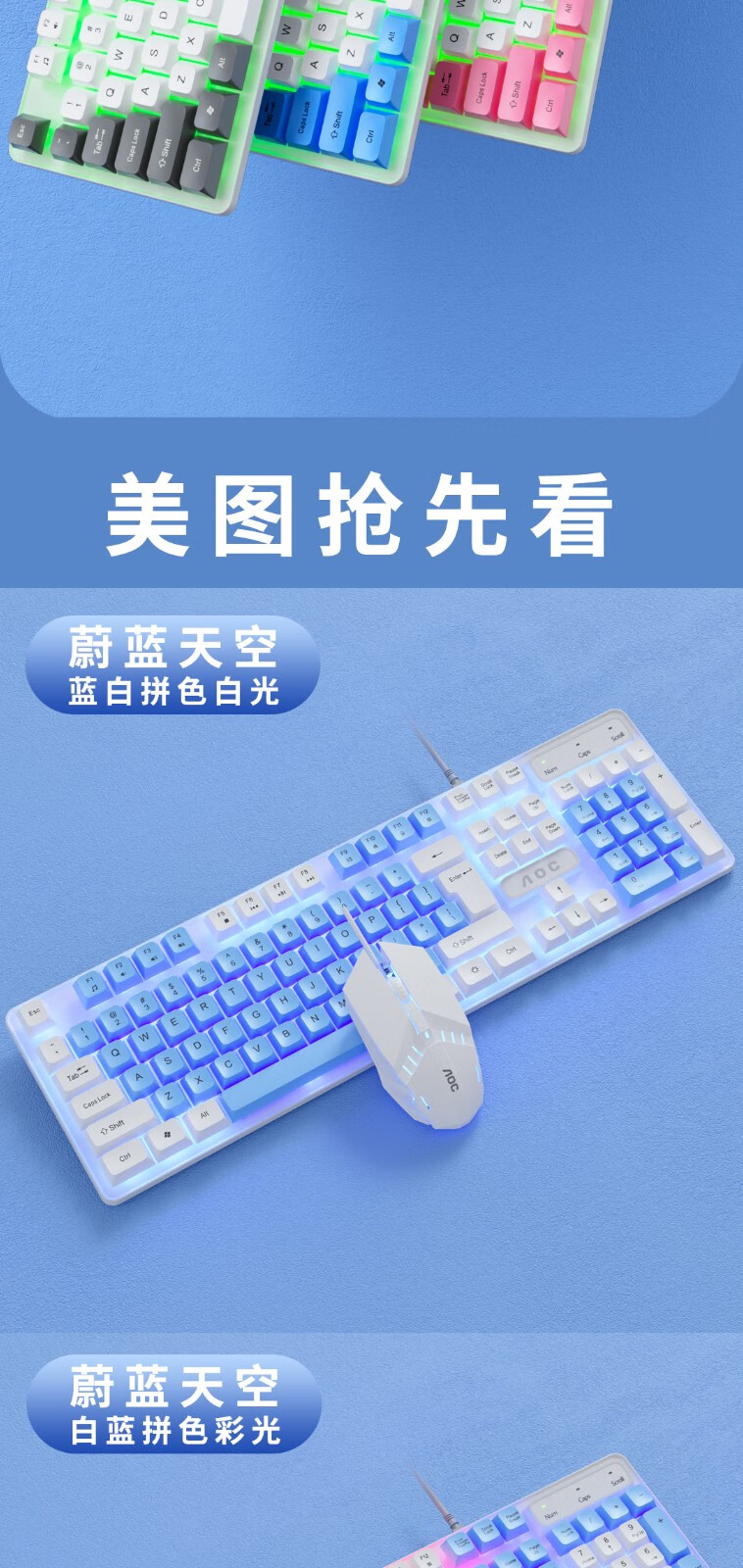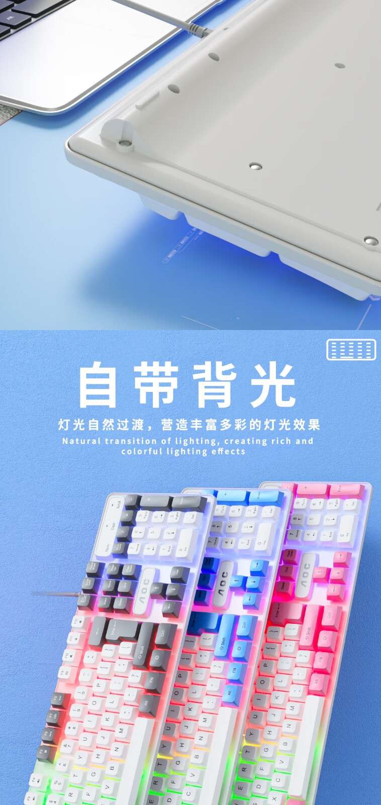 AOC True Mechanical Feel Keyboard and Mouse Set Wired Game Backlight Luminous Desktop Computer USB Peripheral Notebook Office LoL Chicken Internet Cafe E-Sports Membrane Keyboard and Mouse KM100 White Single Keyboard